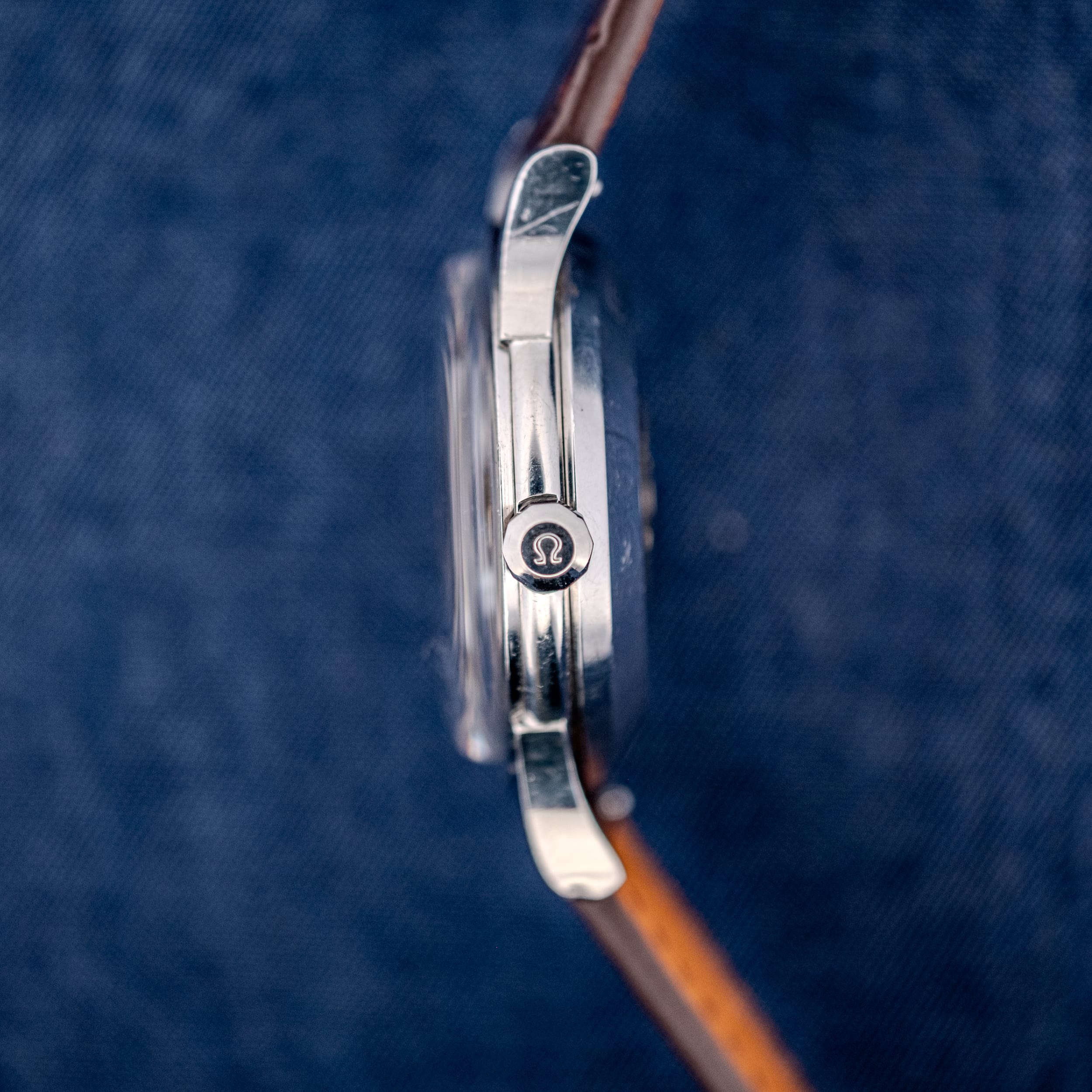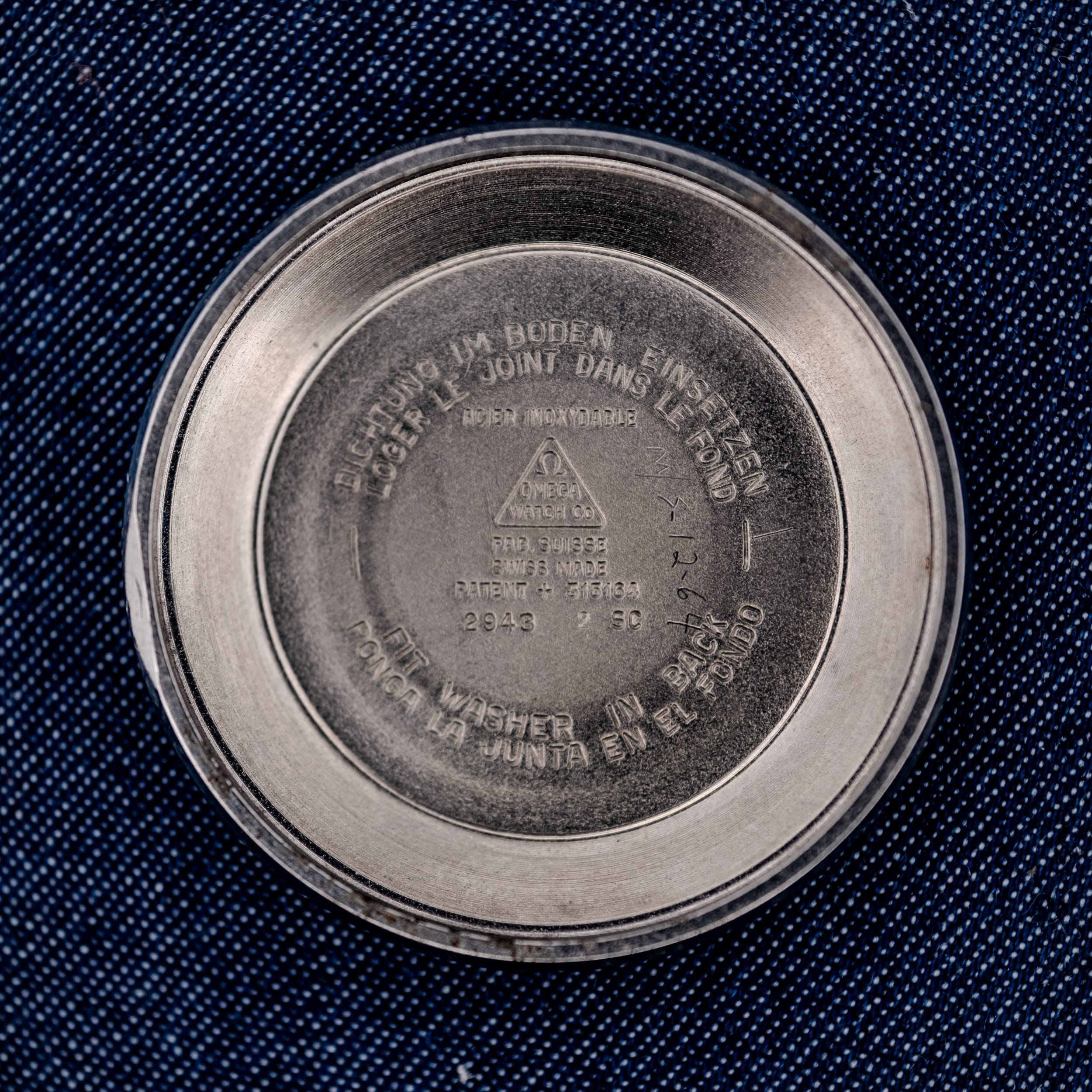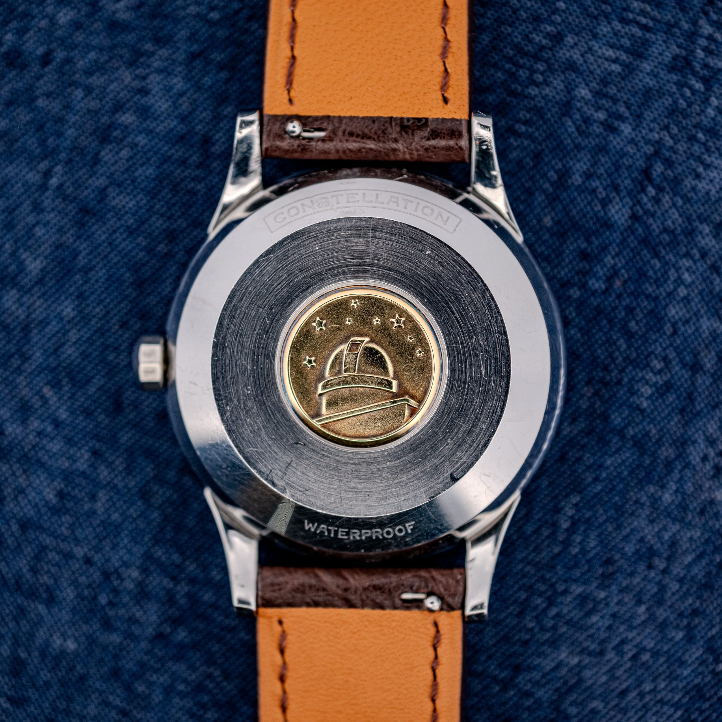 The 35mm stainless steel case is, in a word, exceptional. Garrett’s assessment of “unpolished and super crisp” is borne out in every photograph. The downturned lugs retain their full factory geometry with sharp edges and clearly defined chamfers. The Omega-signed crown is correct for the period, and the side profile reveals no softening or rounding from past polishing. The screw-in caseback carries the famous Constellation Observatory medallion in solid gold, depicting the Geneva Observatory beneath a constellation of eight stars, with “CONSTELLATION” engraved at the top and “WATERPROOF” at the bottom. The inside of the caseback is stamped with the reference 2943 7 SC, confirming the stainless steel Constellation Calendar designation, along with “ACIER INOXYDABLE,” “FAB. SUISSE,” “SWISS MADE,” and the patent number 515194.