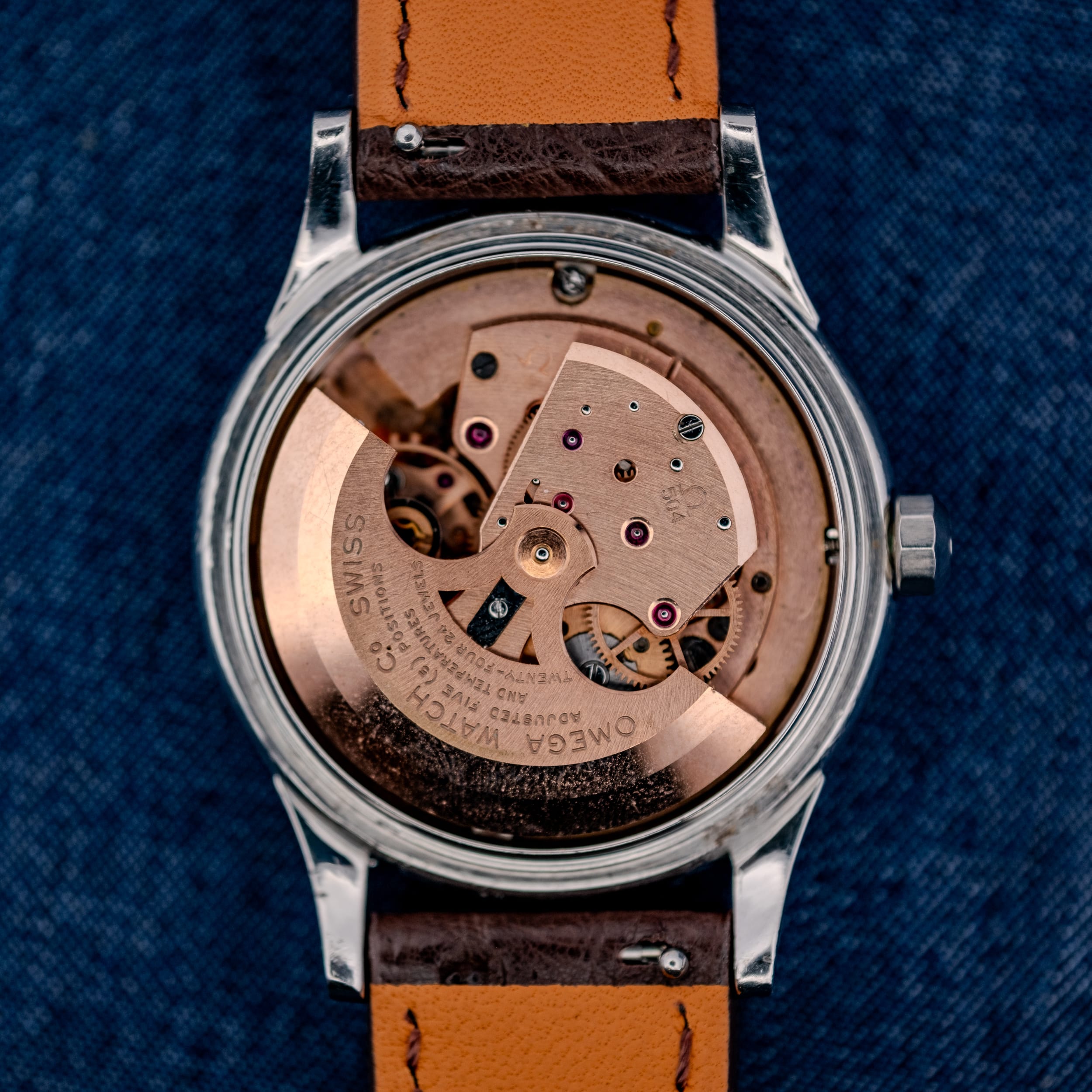 Powering this watch is the Omega caliber 504, an in-house automatic movement that holds the distinction of being the first chronometer-certified date caliber in the Constellation family. Featuring 24 jewels, beating at 19,800 vibrations per hour, and adjusted to five positions and temperatures, the cal. 504 was produced in relatively small numbers, with approximately 25,000 Constellation Calendar references made across all case materials during the production run. The rose gold finished movement visible in our photographs displays Omega’s characteristic broad rotor, signed “OMEGA WATCH Co.” and “SWISS,” with the chronometer adjustment markings clearly legible. This example has been freshly serviced this month and is running well.