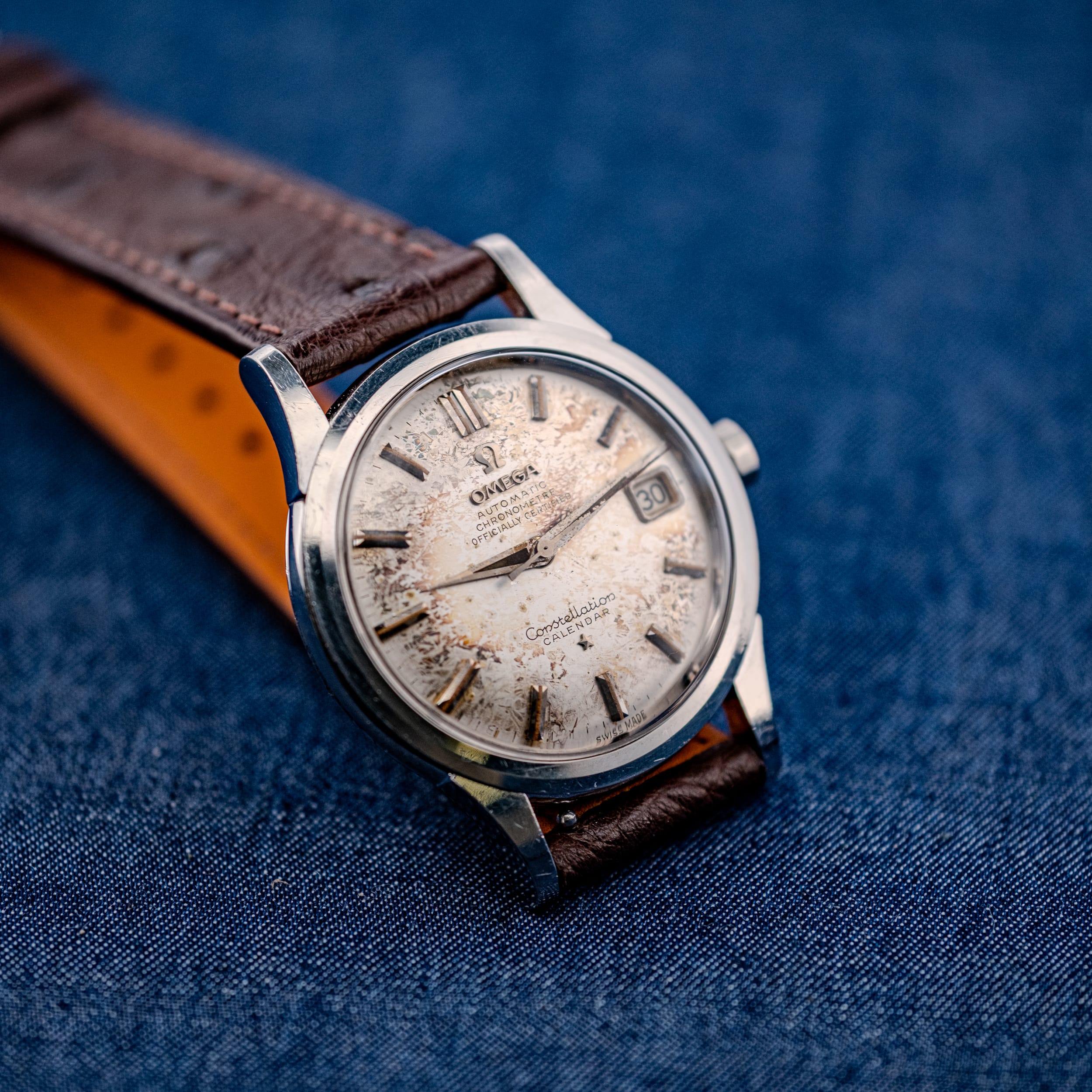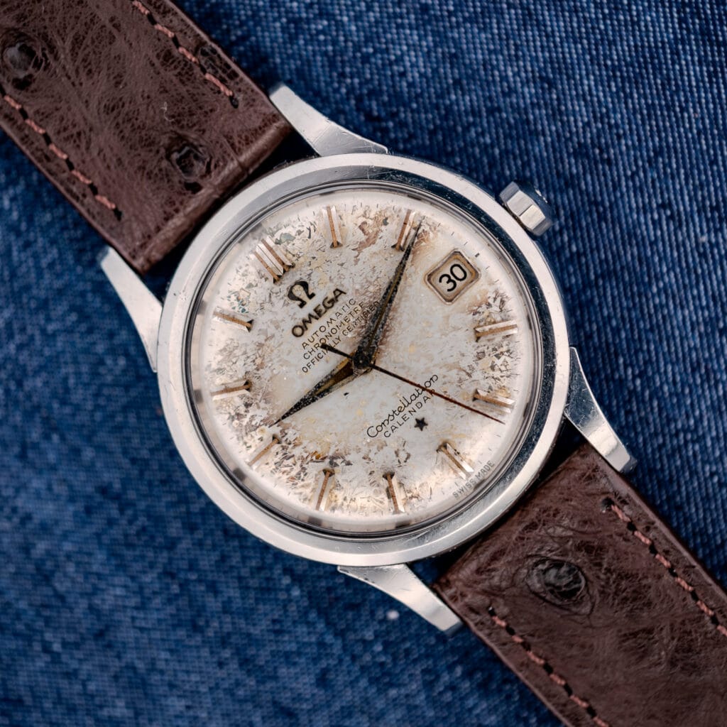 And then there is the dial. To call it “tropical” would be an understatement. The original silver surface has undergone a transformation that can only be described as crystalline, developing an intricate, frost-like pattern that sprawls across the entire dial in veins and clusters of oxidation. It is not spotting, not fading, and not moisture damage in any conventional sense. It is something far more unusual, a chemical interaction between the dial’s lacquer and metallic base layer that has produced a texture resembling frost on a winter windowpane. The applied gold faceted dart indices, the gold-framed date aperture at 3 o’clock, and the Constellation star above six all sit atop this extraordinary surface like landmarks in an abstract landscape. The gold dauphine hands have developed their own gentle patina, and the printed text, “Automatic, Chronometre, Officially Certified,” along with the “Constellation Calendar” script, remains legible throughout. We want to be transparent: this dial shows significant and dramatic aging. But in our opinion, it is precisely this transformation that makes this particular watch unforgettable.