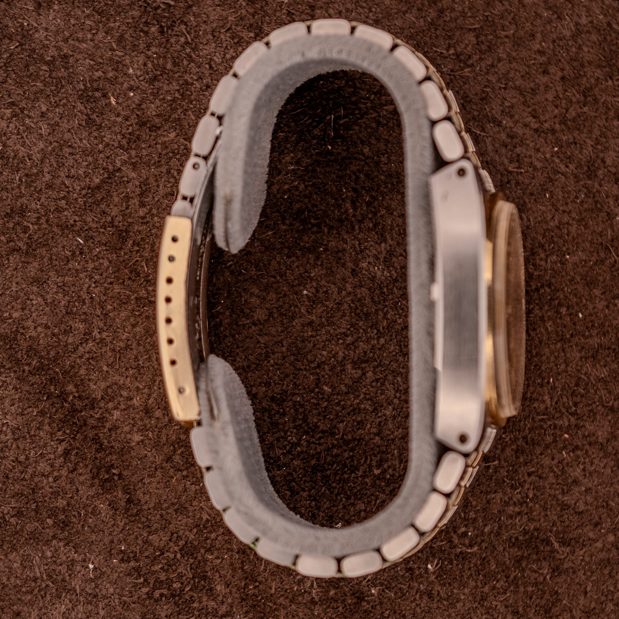 This particular example, with movement number 32547260, dates to 1973 and is presented in what can only be described as extraordinary condition. The stainless steel tonneau case, measuring approximately 36mm across, retains razor-sharp chamfers on every edge, a clear indication that this watch has never been polished. The brushed surfaces on the case flanks remain factory-crisp, and the overall proportions are wonderfully bold, wearing substantially larger than the millimeter count would suggest thanks to the wide, cushion-shaped profile and integrated bracelet design. The 14K gold coin-edge bezel frames the dial with a warmth and richness that elevates the entire presentation, its fine fluting still sharply defined and glinting beautifully in the light.