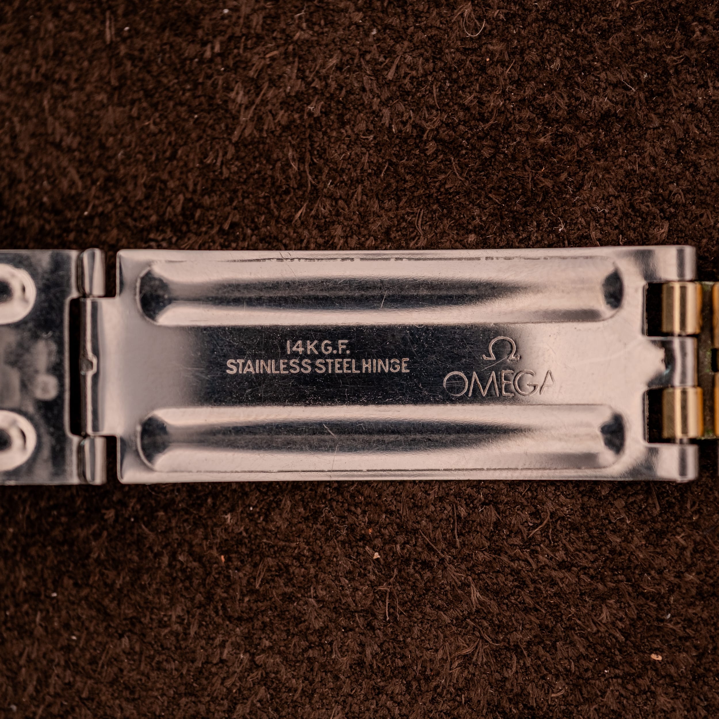 The original Omega two-tone jubilee-style bracelet is in excellent condition with 14K gold filled center links alternating with brushed stainless steel outer links, showing minimal stretch and maintaining a satisfying, weighty drape on the wrist. The signed Omega clasp is stamped “14K G.F. / Stainless Steel Hinge” on the interior. Extra links are included.