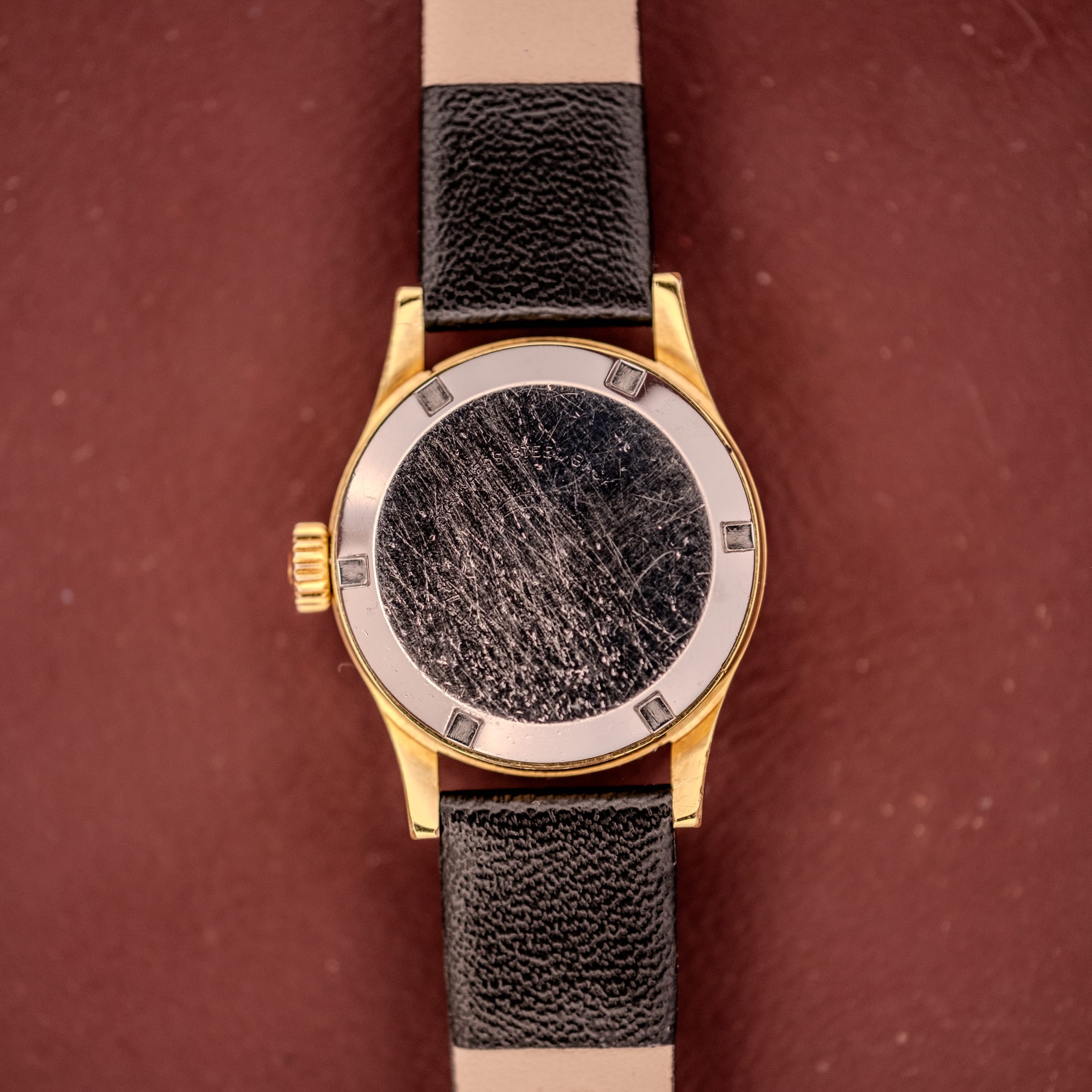 For anyone searching for a vintage ladies’ automatic with genuine Omega pedigree, this Ladymatic is a compelling find. It offers the warmth and presence of gold, the satisfaction of a proper in-house automatic movement, and the timeless appeal of a beautifully executed mid-century design. Paired here with a black leather strap, it’s equally at home with an evening dress or a casual weekend outfit. A fantastic entry point into vintage Omega collecting, or a thoughtful gift for the woman who appreciates something with a story to tell.