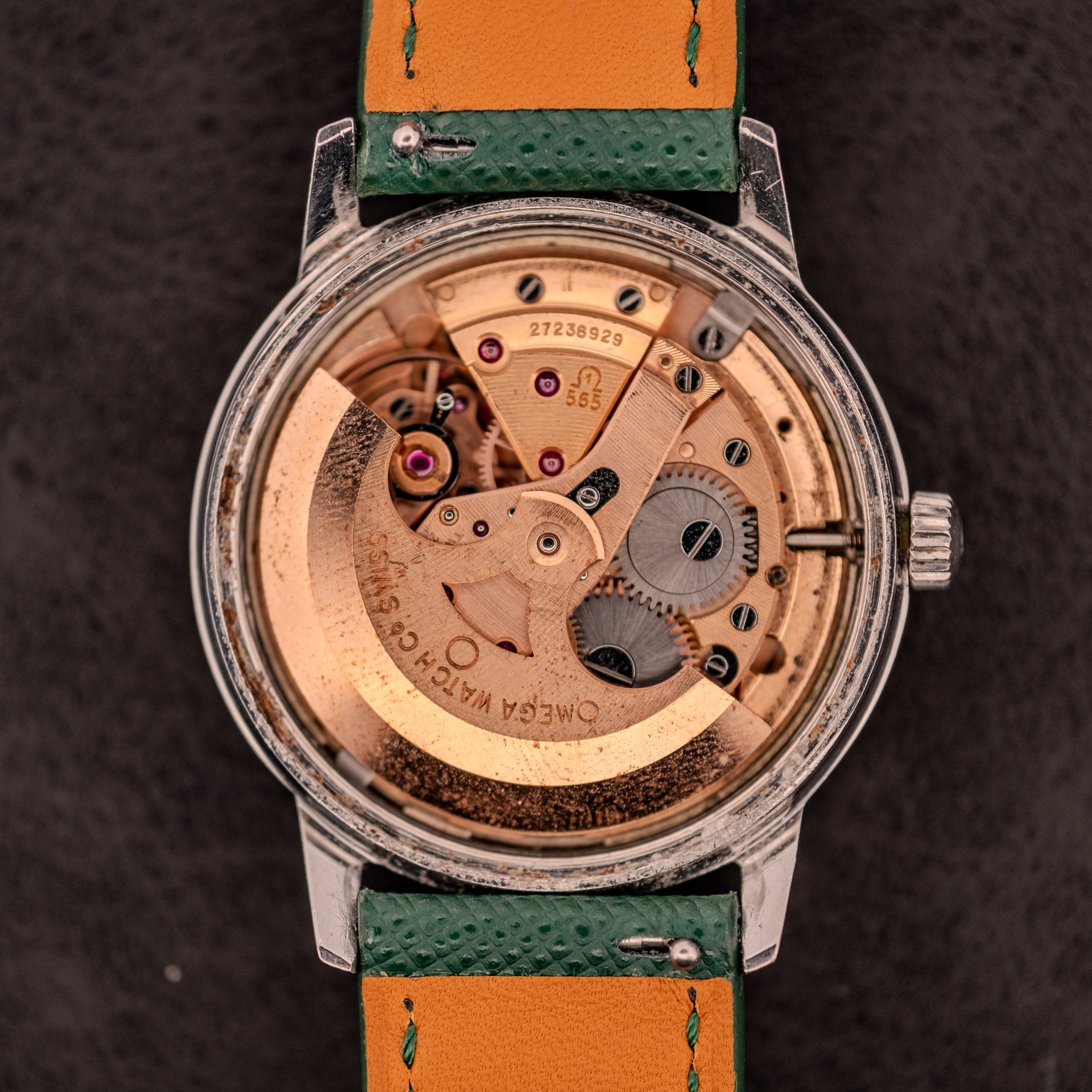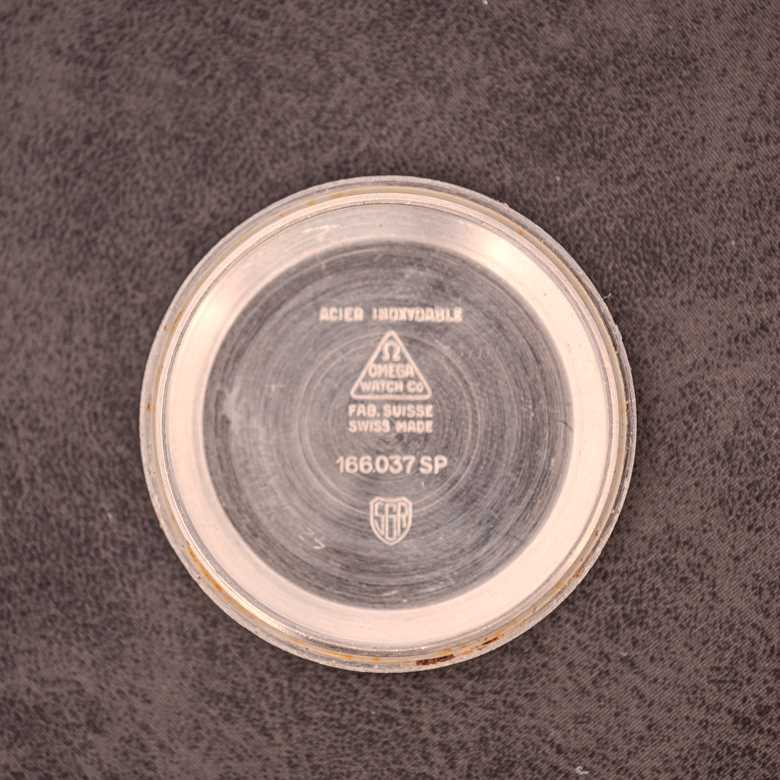 The cal. 565 inside is the 24-jewel quickset date version of Omega’s celebrated 5xx automatic family. The quickset function is operated via a push-pull mechanism on the crown, allowing the date to be advanced independently without cycling the hands through a full 24-hour rotation. It is a small convenience that makes a meaningful difference in daily wear, and it was one of the features that kept Omega at the forefront of practical watchmaking during this period. Movement serial 27238929 dates this example to approximately 1968. The inner caseback is stamped “166.037 SP” along with “Acier Inoxydable, Omega Watch Co, Fab. Suisse, Swiss Made,” confirming the stainless steel construction.