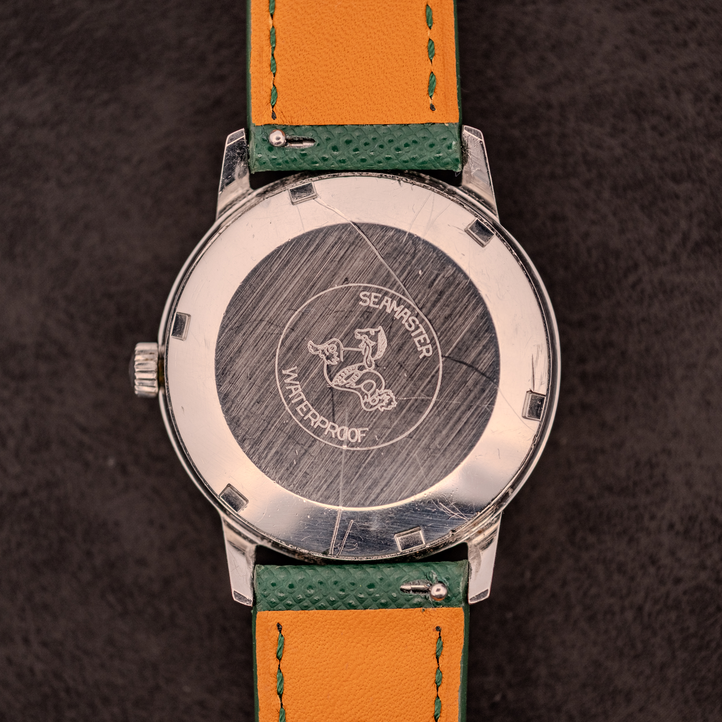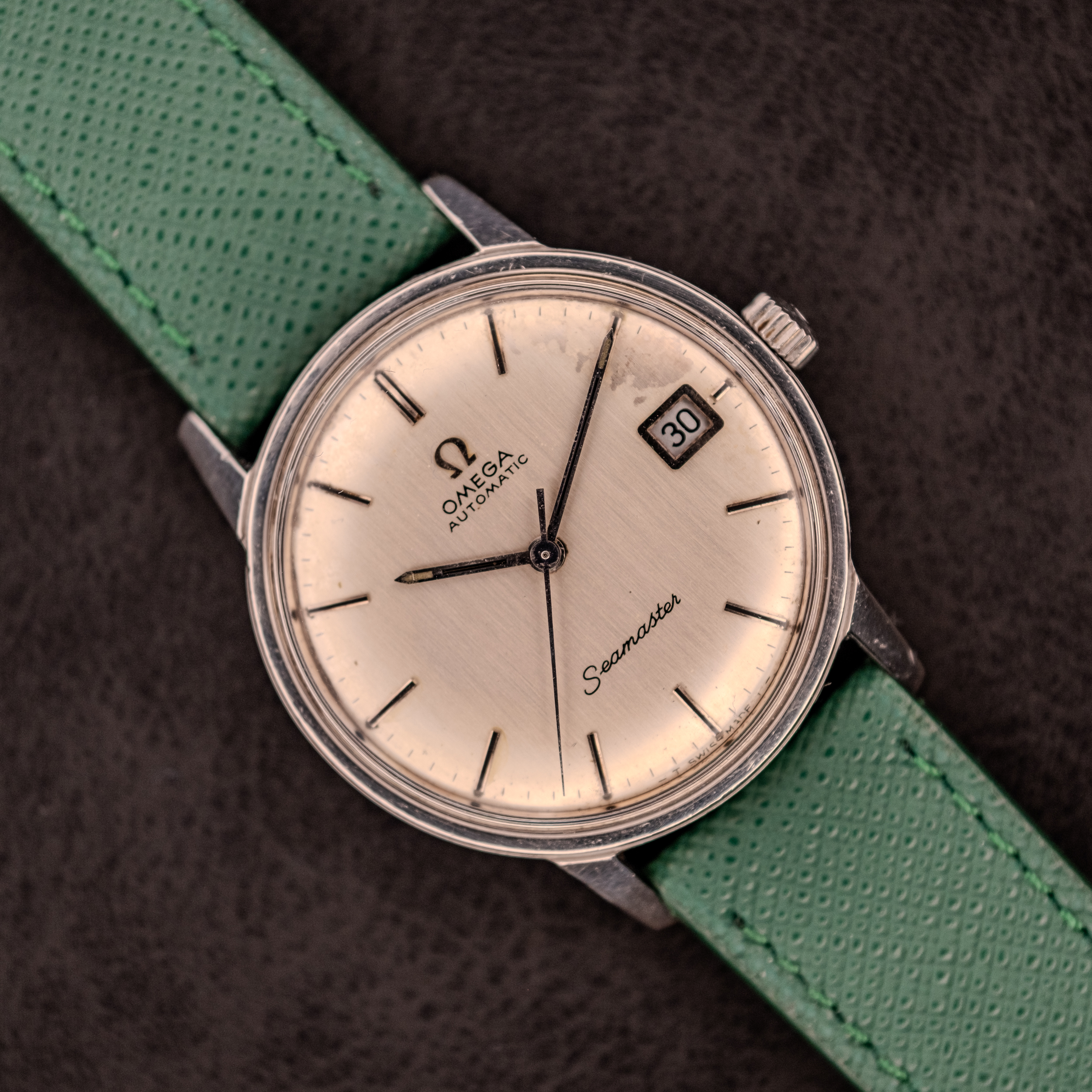This particular example shows the honest character of a watch that was worn and enjoyed for decades. The silver sunburst dial retains its overall structure and legibility, with the applied stick markers, “Omega Automatic” printing, and “Seamaster” script all intact. There is some patina visible on the dial surface, including light marks and a subtle area of discoloration near the 3 o’clock position, consistent with moisture exposure over the years. The “T Swiss Made T” at 6 o’clock confirms tritium. The sword hands retain their original form with aged lume fills. The date window at 3 is clean, with a black date wheel providing good contrast. The stainless steel case shows wear on the bezel and lugs consistent with regular use, though the overall proportions remain intact. The signed Omega crown is original. The outer caseback carries the Seamaster hippocampus medallion with “Waterproof” text, and turning the watch over reveals the copper-toned cal. 565 with “Omega Watch Co, Swiss” on the rotor.