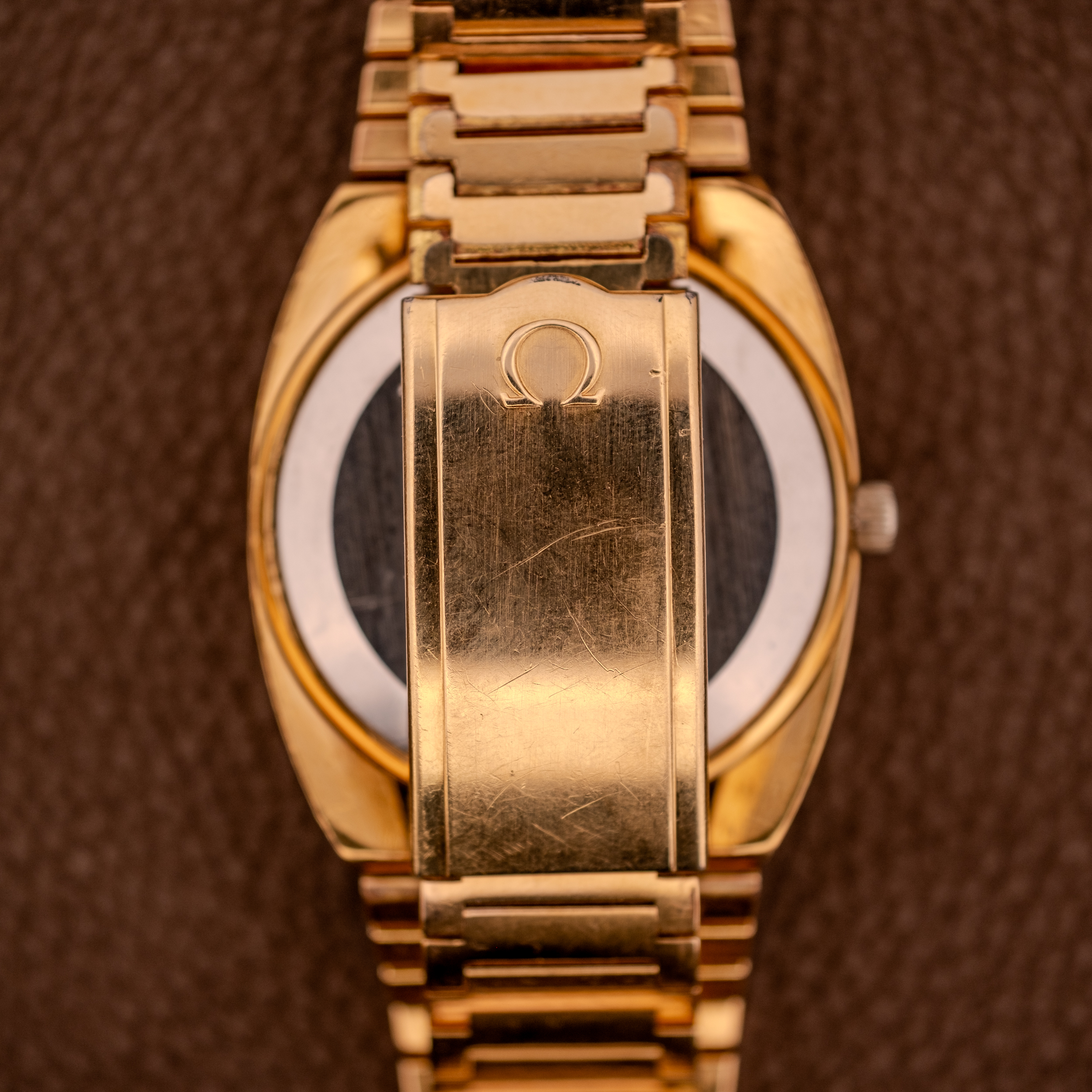 The gold plated case and bracelet show honest wear consistent with regular use over decades. There is some brassing visible at the edges of the lugs and bracelet links where the 20 micron gold plating has worn through to the stainless steel beneath, which is entirely normal for a plaqué or piece of this age. The outer caseback features the iconic Seamaster hippocampus medallion, and the inner caseback reads “Carrure Lunette Plaque Or G 20 Microns, Fond Acier Inoxydable, LL, 166.0207, 366.0843.”