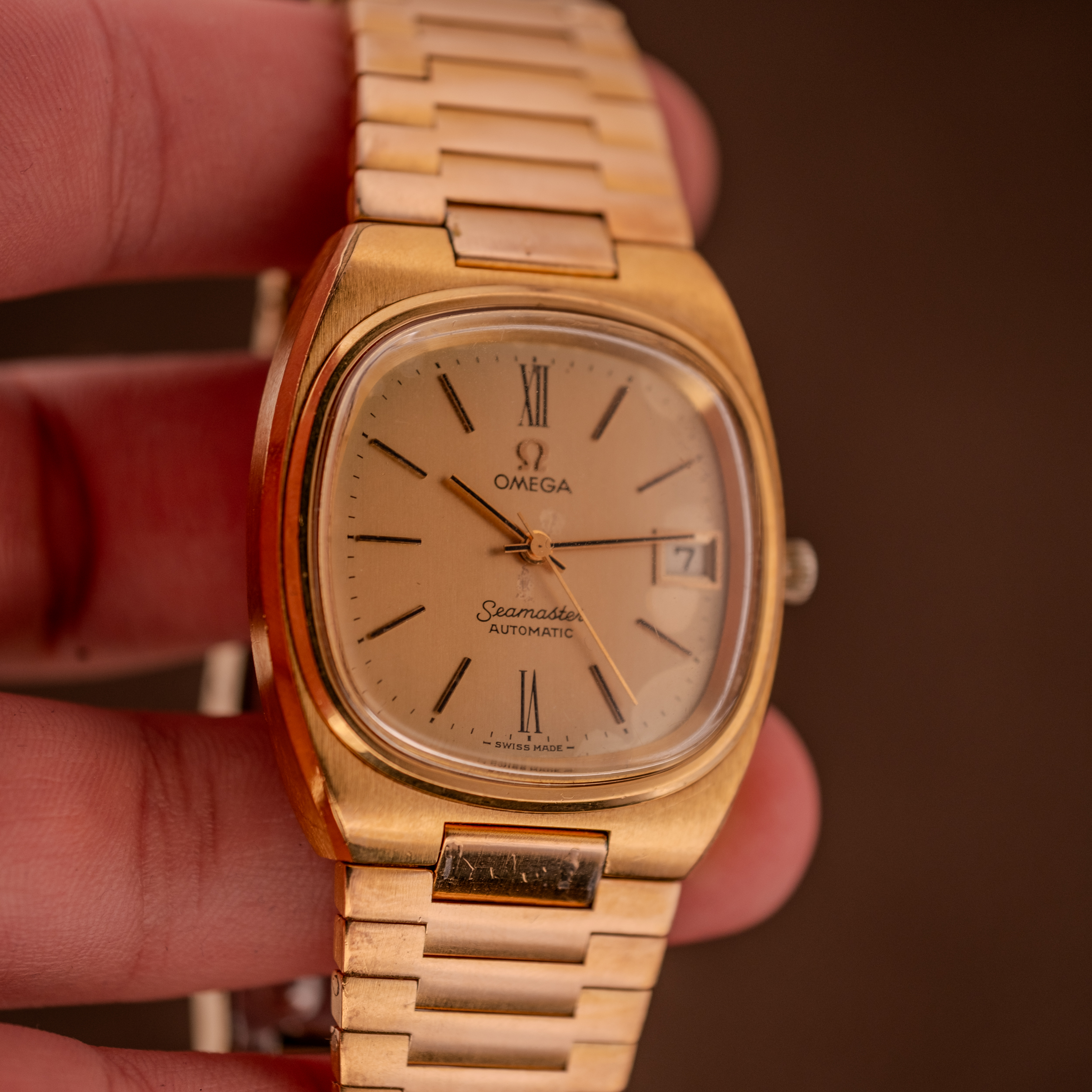 As a complete, bracelet-equipped TV case Seamaster in warm gold tones, this is a fantastic example of 1970s Omega at its most confident. The integrated silhouette, the champagne dial, and the period-correct bracelet all come together to create a watch with genuine presence on the wrist and real collector value as an increasingly hard to find complete set.
