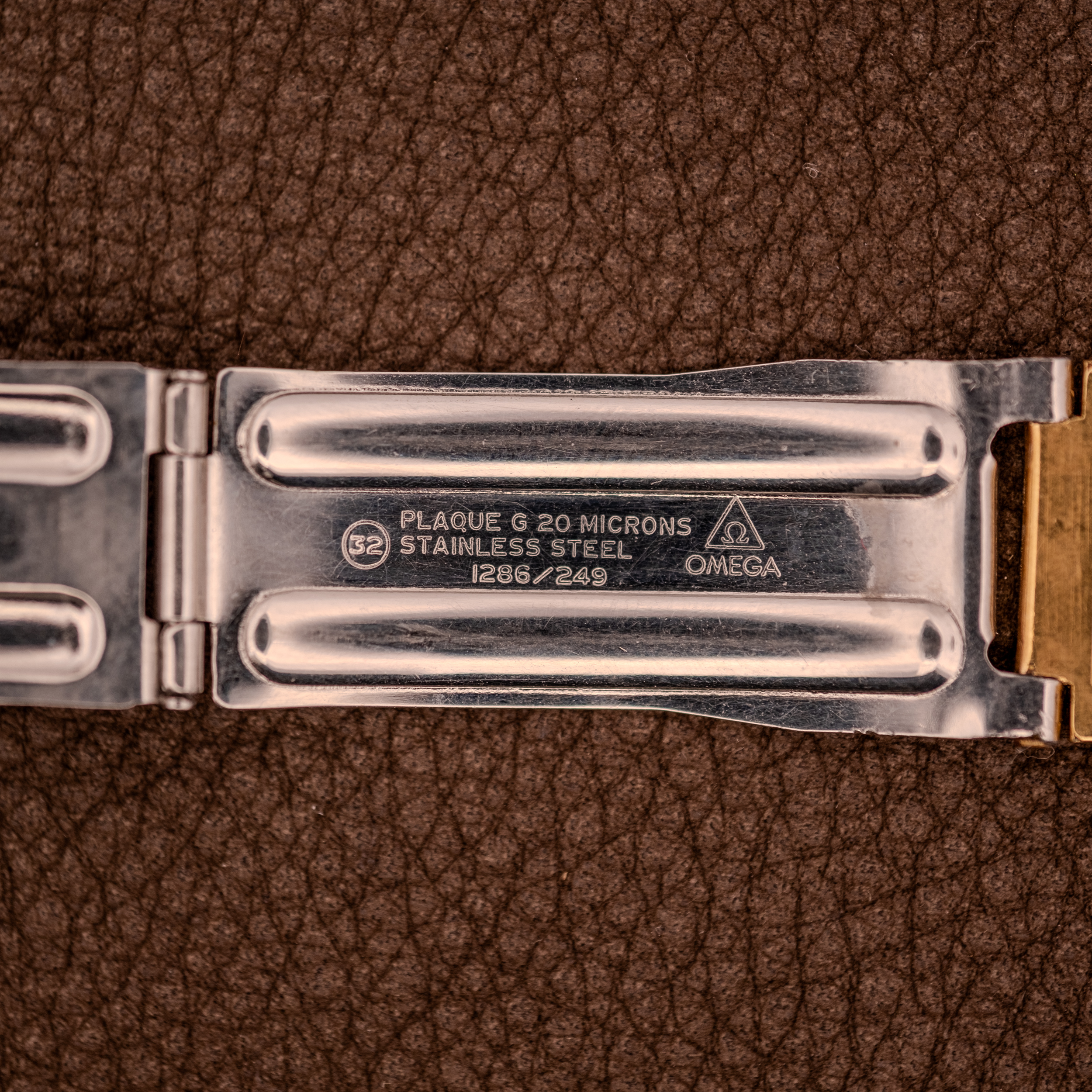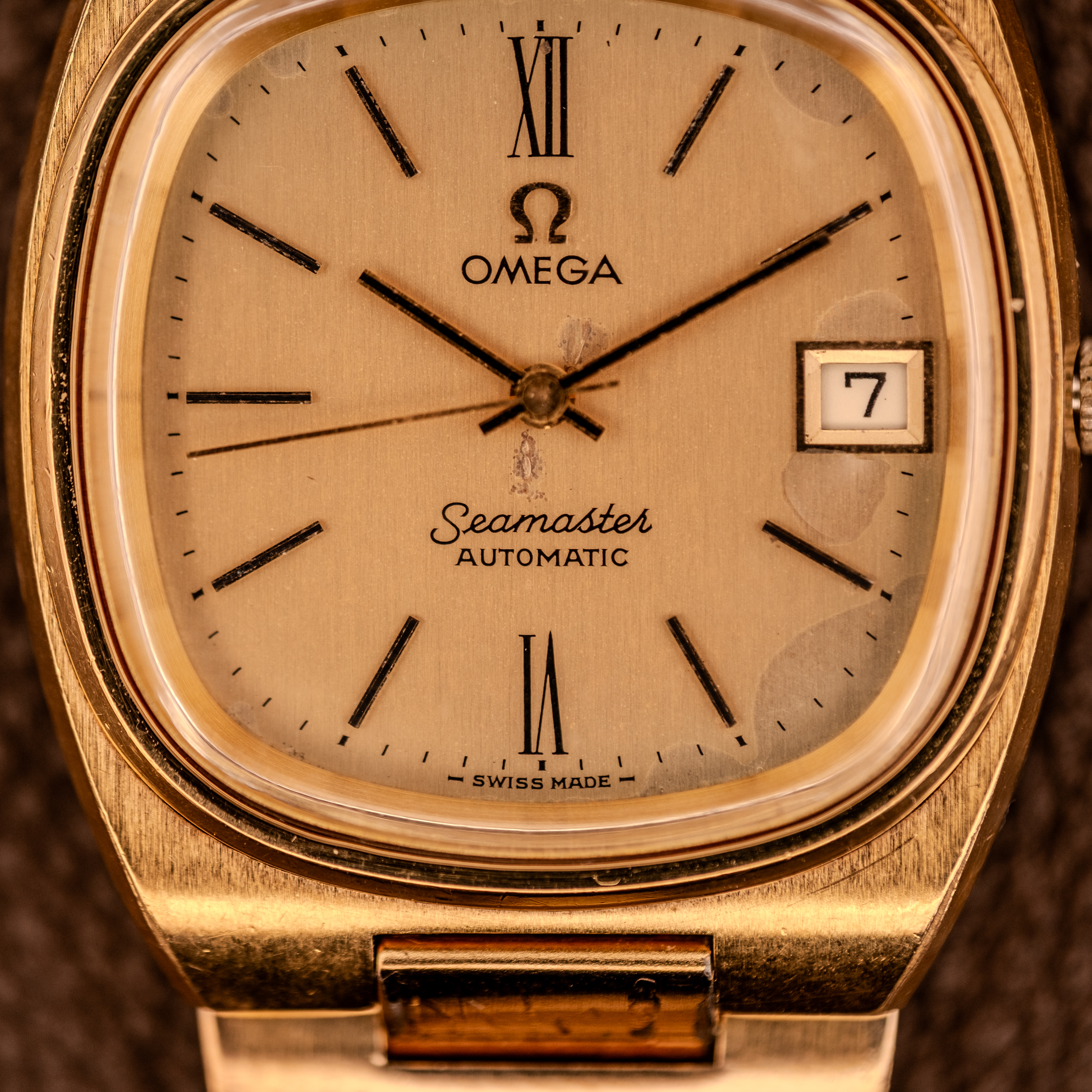 This particular example is a genuinely complete package, which is what makes it special. The original Omega bracelet ref. 1286/249, stamped “Plaque G 20 Microns, Stainless Steel” on the clasp, has survived with the watch. These bracelets almost never stay with the head over the decades. They get swapped, lost, or damaged beyond use, and finding one still mated to its correct case is increasingly rare. The clasp is signed with the Omega logo and the bracelet integrates seamlessly into the cushion lugs, creating the unbroken visual line that makes the TV case design work. The warm champagne dial carries applied stick markers at most hours with applied Roman numerals at XII and VI, the Omega logo, and “Seamaster Automatic” script in the lower half. A date window with cyclops magnifier sits at 3 o’clock. The “Swiss Made” designation appears at 6.