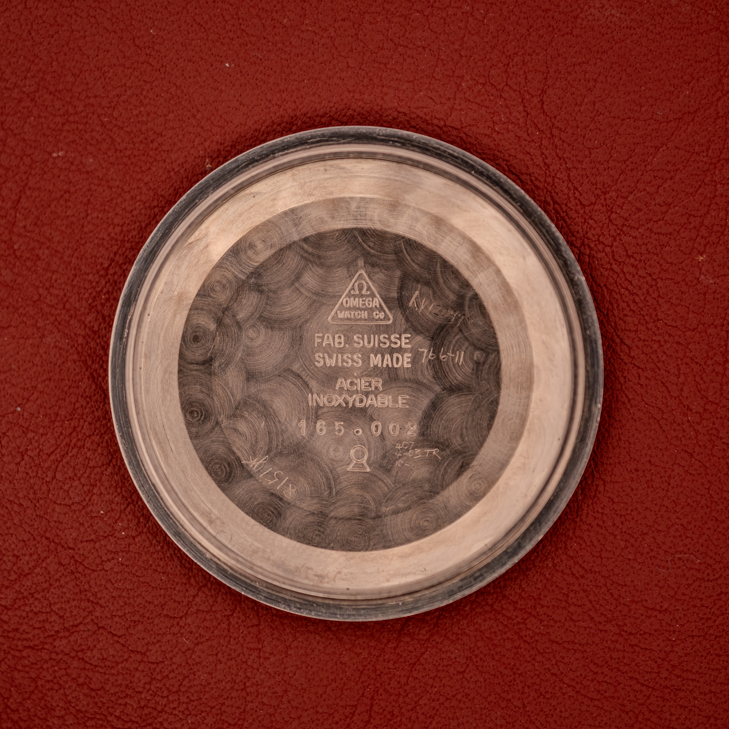 The cal. 552 inside is the fully jeweled, 24-jewel international market version of Omega’s 5xx automatic family, the movement as Biel intended it without the jewel reductions applied to the US-market cal. 550 to avoid import tariffs. Movement serial 24703112 dates this example to approximately 1966 to 1967. The inner caseback is stamped with the ref. 165.002, case number 76641, “Fab. Suisse, Swiss Made, Acier Inoxydable,” along with various watchmaker service marks that confirm this watch has been maintained throughout its life. The copper-toned cal. 552 is visible with the caseback removed, “Omega Watch Co, Swiss” engraved on the rotor, and the movement finishing remains excellent.
