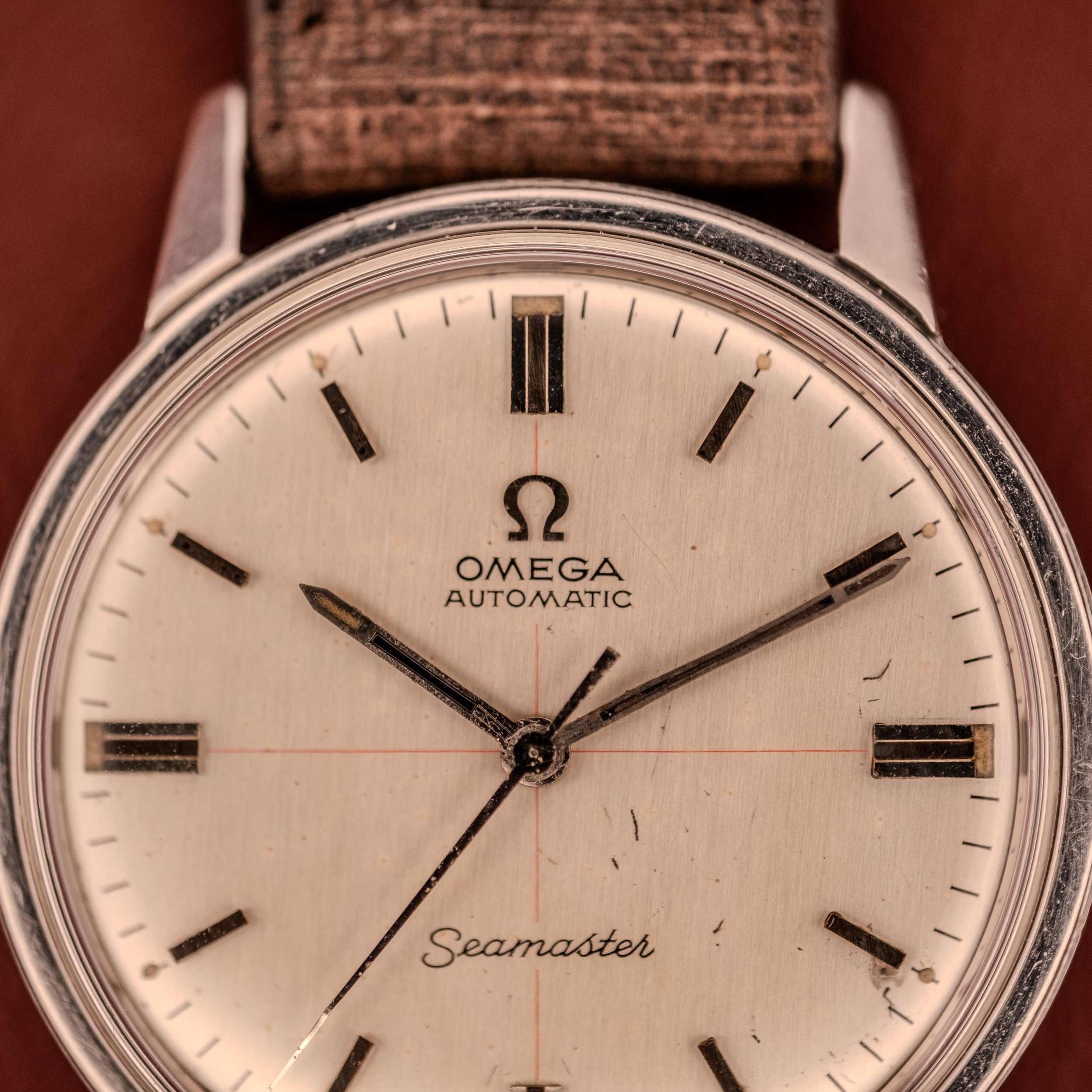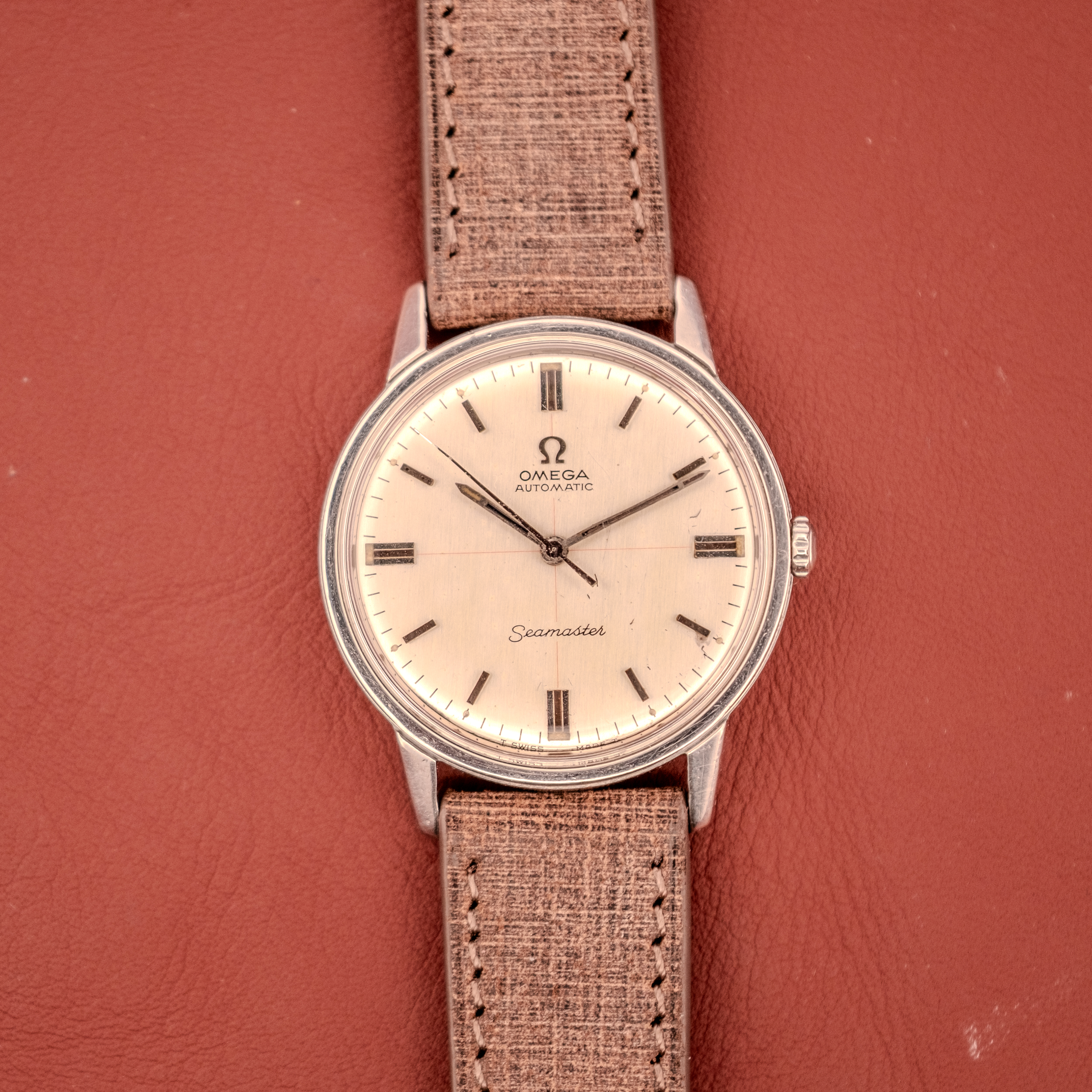 What we have here is a red crosshair dial on the standard Seamaster dress dial layout. Instead of the full “Technic” treatment with its sport-oriented lume plots and white handset, this example retains the elegant applied stick markers, the sword hands, and the classic “Seamaster” script at 4:30, adding only the red crosshair lines that intersect at the dial center. It is a more subtle execution, a quiet nod to the sportier variants rather than a full commitment to them, and in our experience, it is considerably harder to find than either the standard silver sunburst or the black “Technic” configuration. It occupies a fascinating middle ground in the 165.002 production story, and we believe it to be genuinely rare.