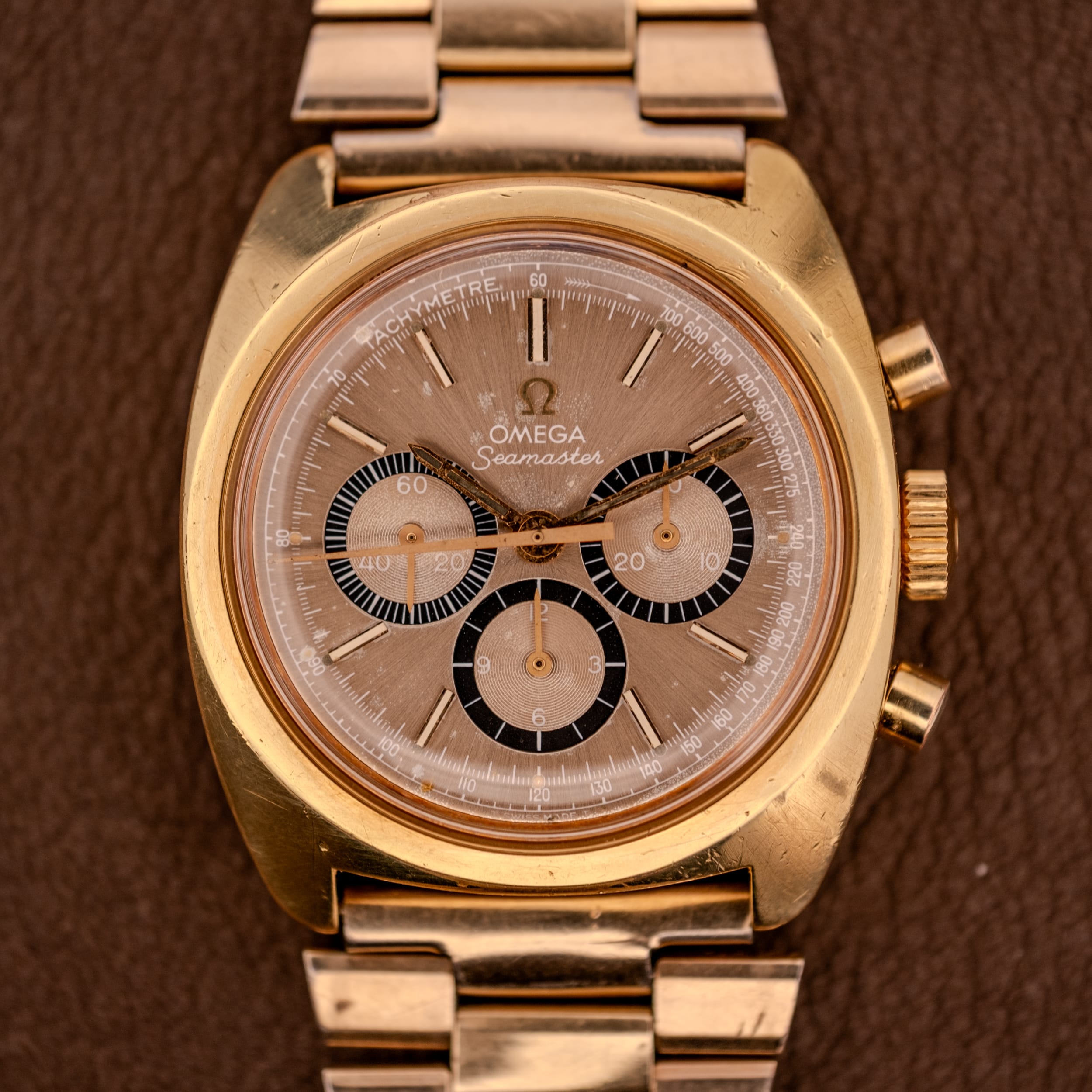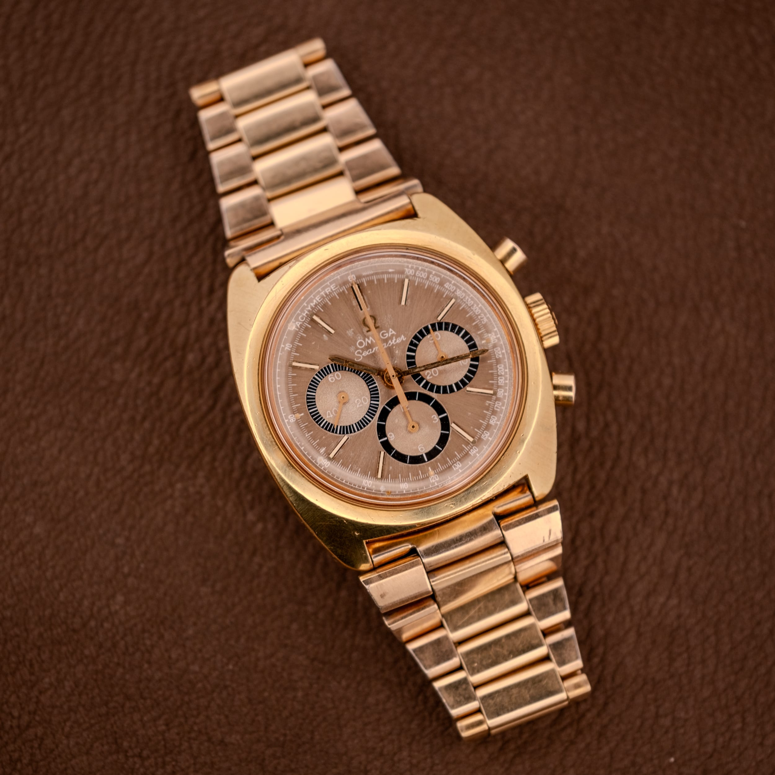 Omega Seamaster Chronograph Ref. 145.029 in a gold-plated (20 microns) tonneau-shaped case with stainless steel caseback. The champagne sunburst dial features three contrasting black subsidiary registers with concentric guilloche detailing at 3, 6, and 9 o’clock, applied gold baton indices, gold dauphine hands, and a tachymetre scale printed along the inner chapter ring. Signed “Omega Seamaster” beneath the applied Omega emblem, with “Swiss Made” at 6 o’clock. The Seamaster seahorse medallion adorns the caseback. Powered by the manual-winding Omega caliber 861 chronograph movement with copper-finished bridges. Presented on its original Omega bracelet in 1/40 10kt gold overlay with stainless steel hinge and signed Omega folding clasp.