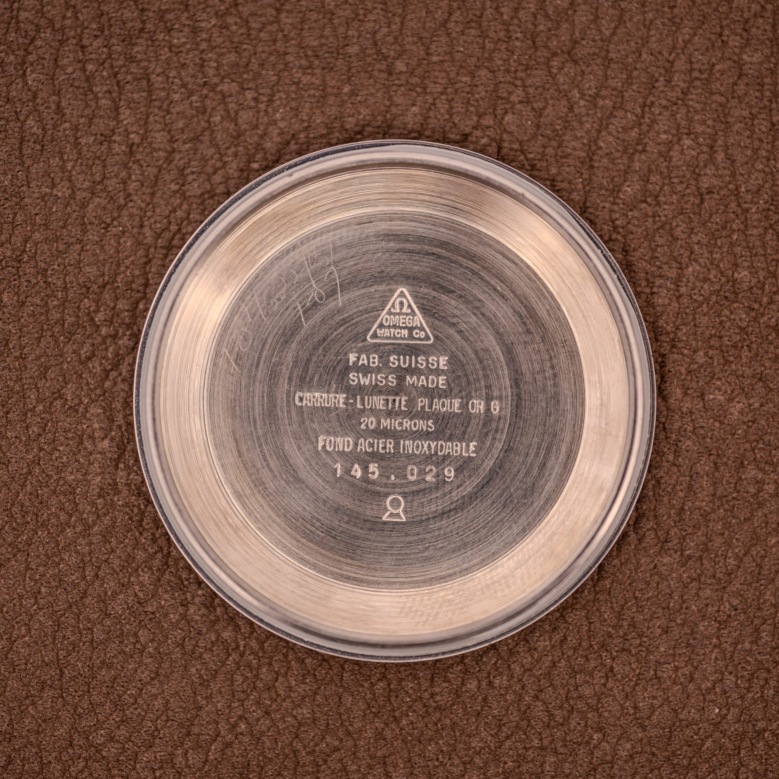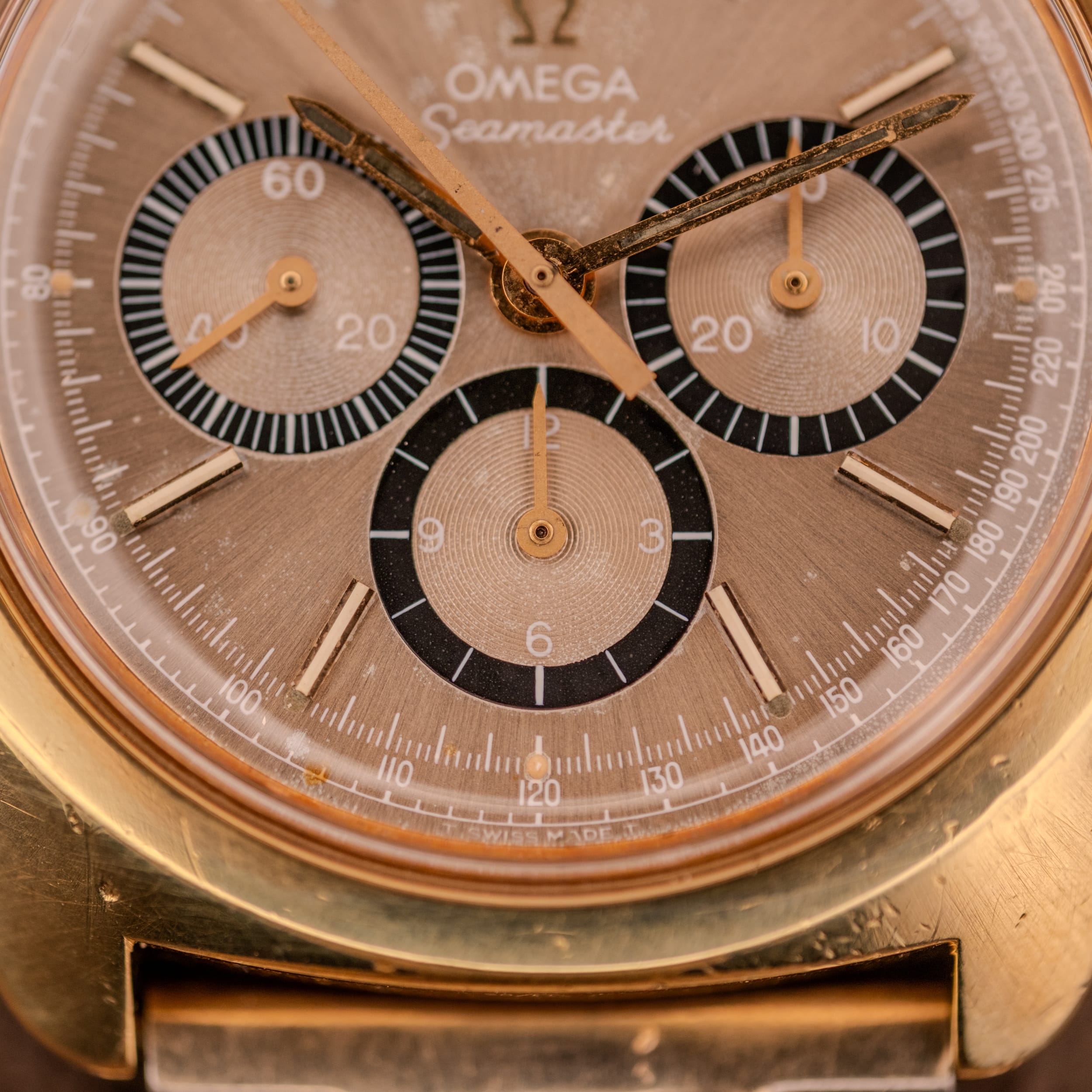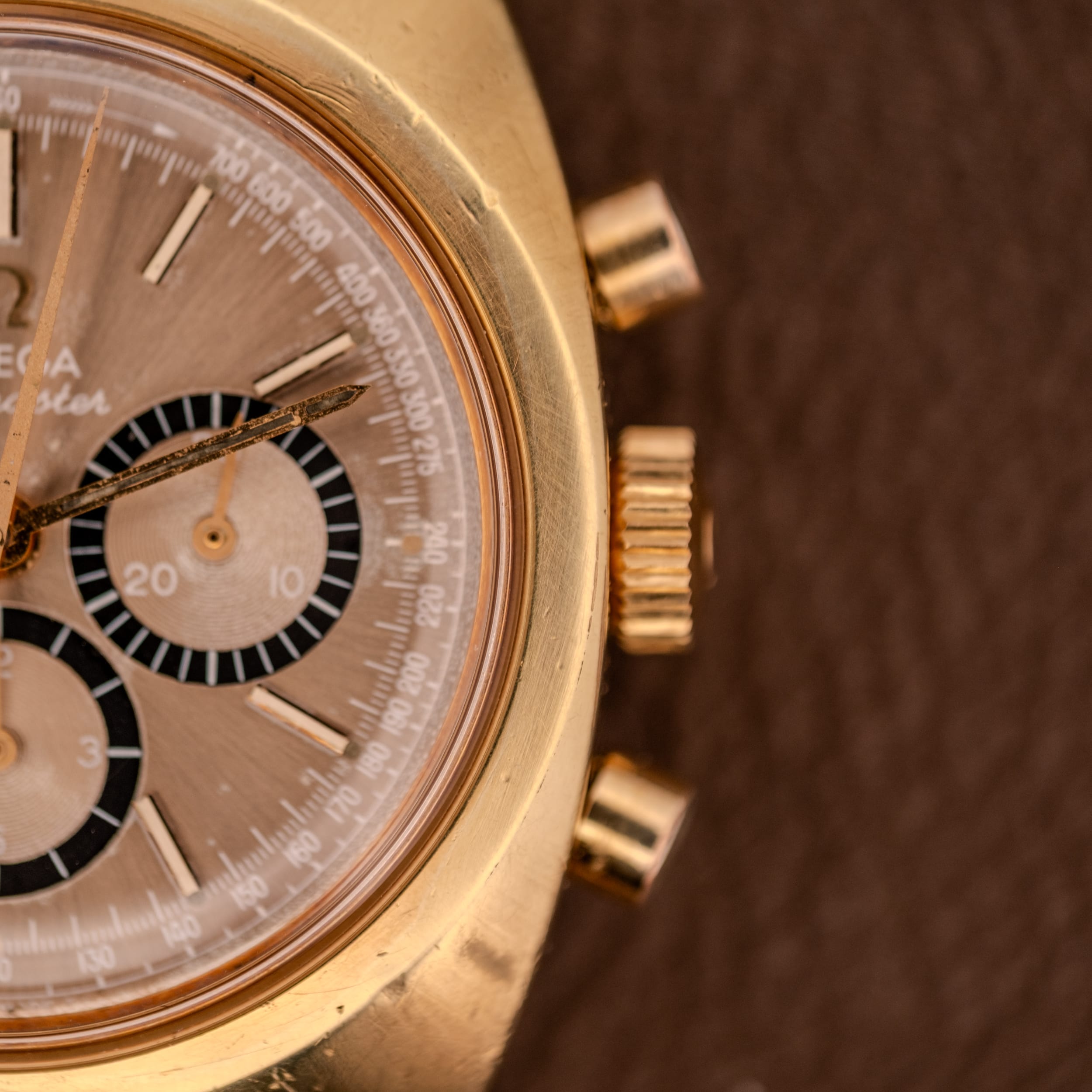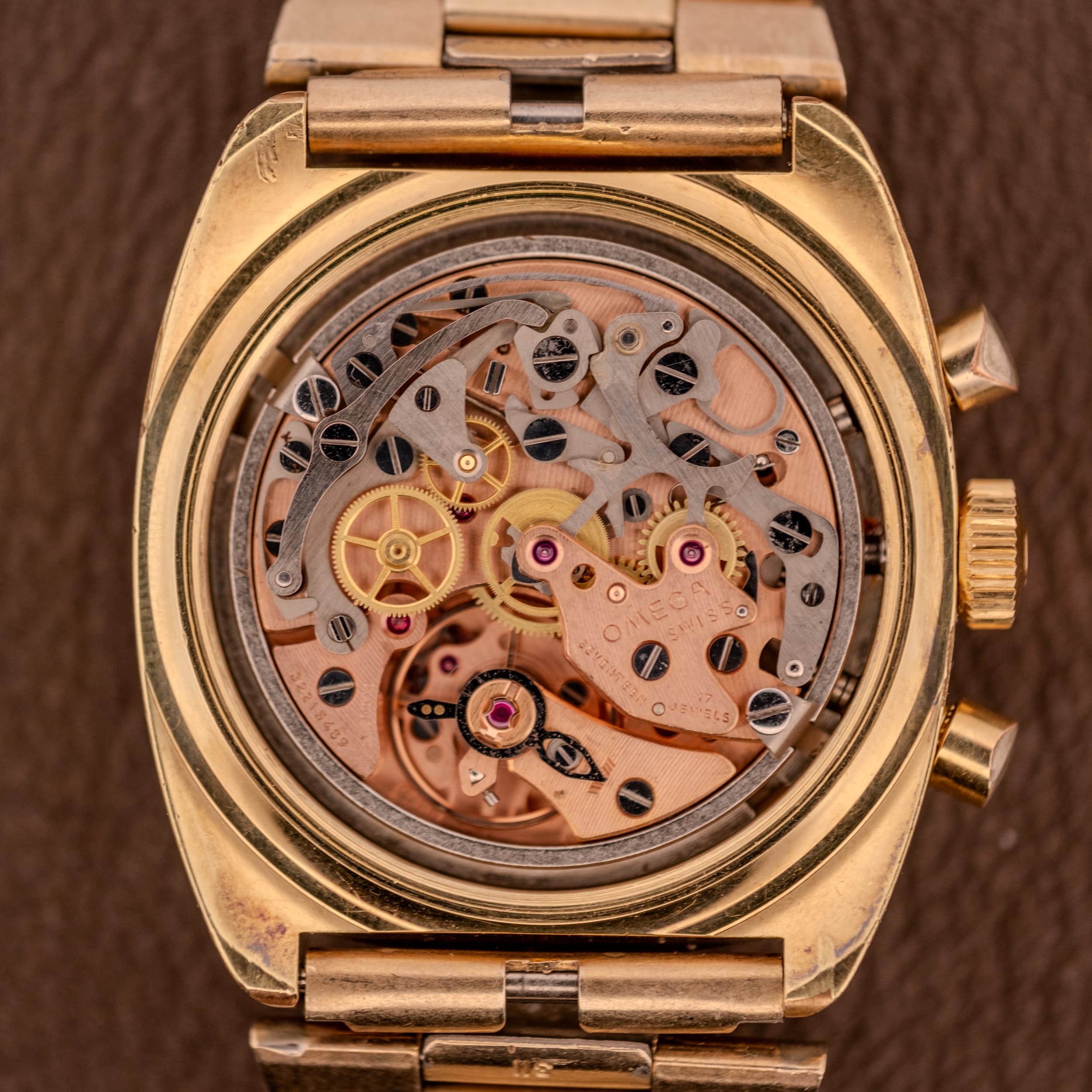 This particular example is the gold-plated variant, and it is a stunner. The case and bezel are finished in 20 microns of gold plating over a stainless steel caseback, as confirmed by the French-language engravings inside: “Carrure-Lunette Plaqué Or G, 20 Microns, Fond Acier Inoxydable.” There is a warmth and a richness to the gold-plated 145.029 that the stainless steel versions simply cannot replicate. The champagne sunburst dial has developed a gorgeous, slightly smoky tone over the decades, giving it an almost tropical quality that shifts in different lighting conditions. The three subsidiary registers, a running seconds at 9, a 30-minute recorder at 3, and a 12-hour totalizer at 6, are executed in jet black with concentric guilloche texturing at their centers, creating a striking three-dimensional contrast against the warm dial surface. The applied gold baton indices remain crisp and well-attached, and the tachymetre scale printed along the chapter ring is fully legible. Opening the caseback reveals the cal. 861 in all its copper-bridged glory, signed “Omega” and looking every bit the serious chronograph caliber it is.