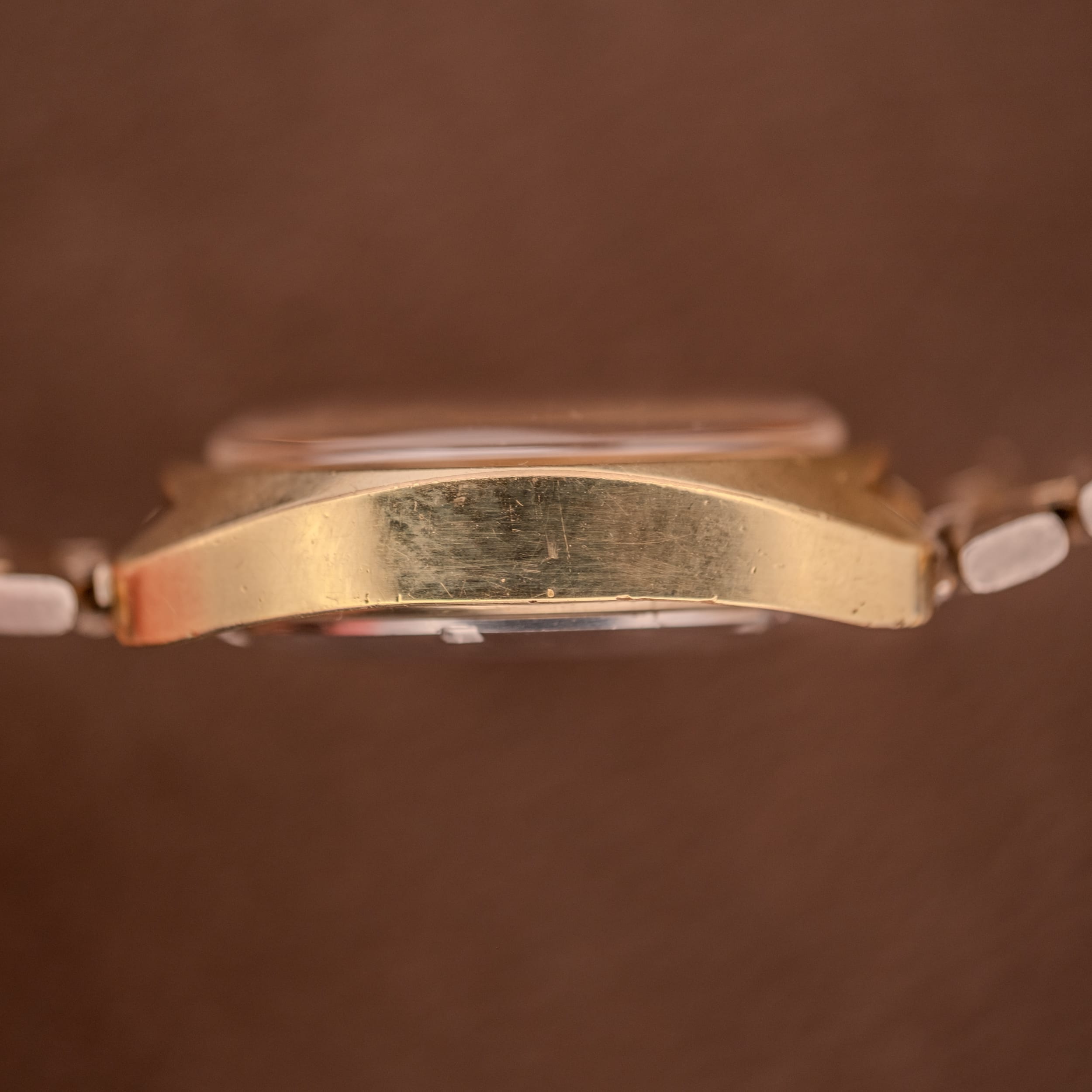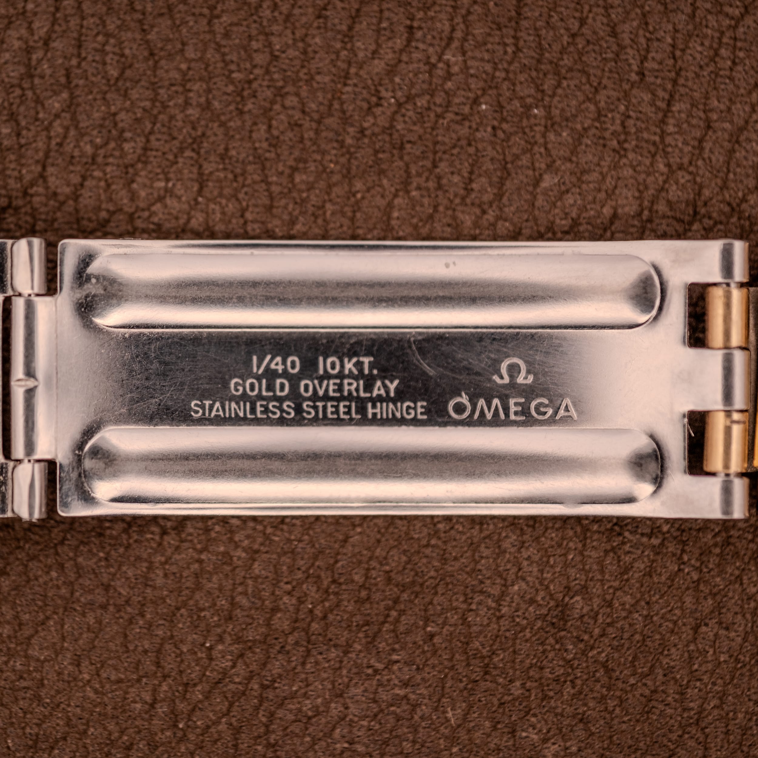 In terms of condition, this is an honest, lived-in example. The gold plating on the case retains its warm luster with surface wear consistent with regular use over several decades, particularly along the case edges and pushers where contact is inevitable. The dial shows some light spotting and moisture tracks, most visible under macro photography but far less noticeable in person, lending the piece a character that tells its story. The Seamaster seahorse medallion on the caseback remains clearly defined. What truly sets this example apart, however, is the original Omega bracelet in 1/40 10kt gold overlay with its signed folding clasp. Finding a gold-plated 145.029 on its matching original gold-tone bracelet is increasingly difficult, and the bracelet here, while showing honest patina, remains solid and functional.
