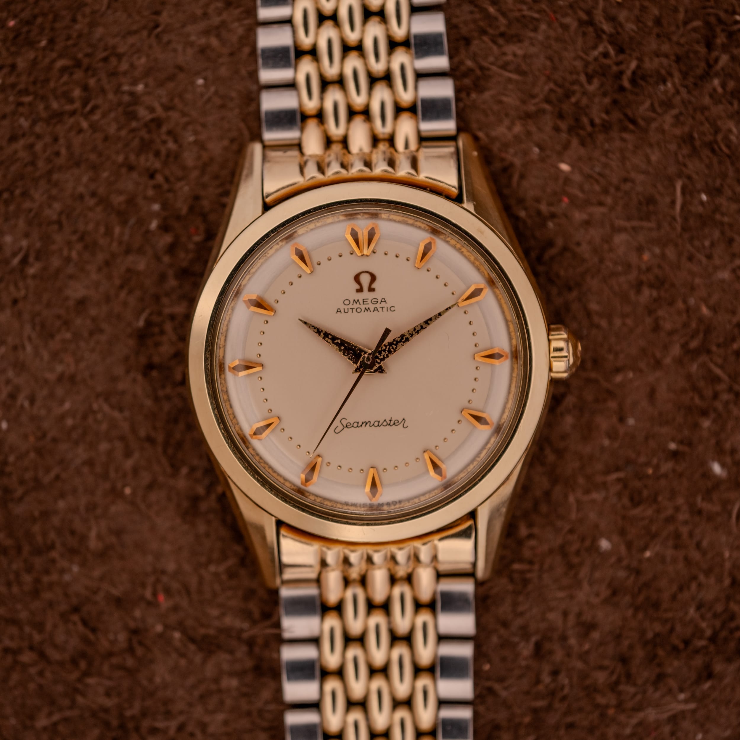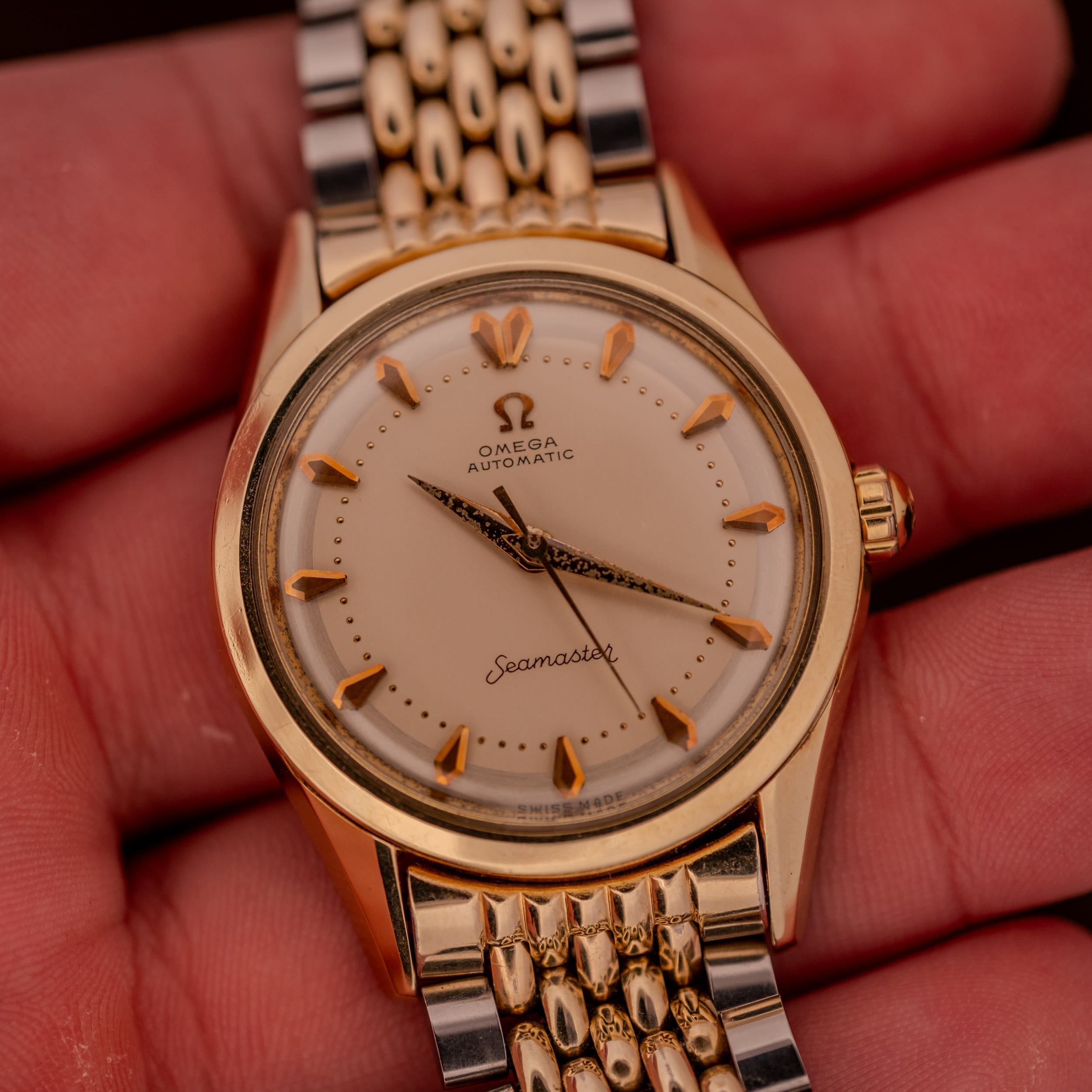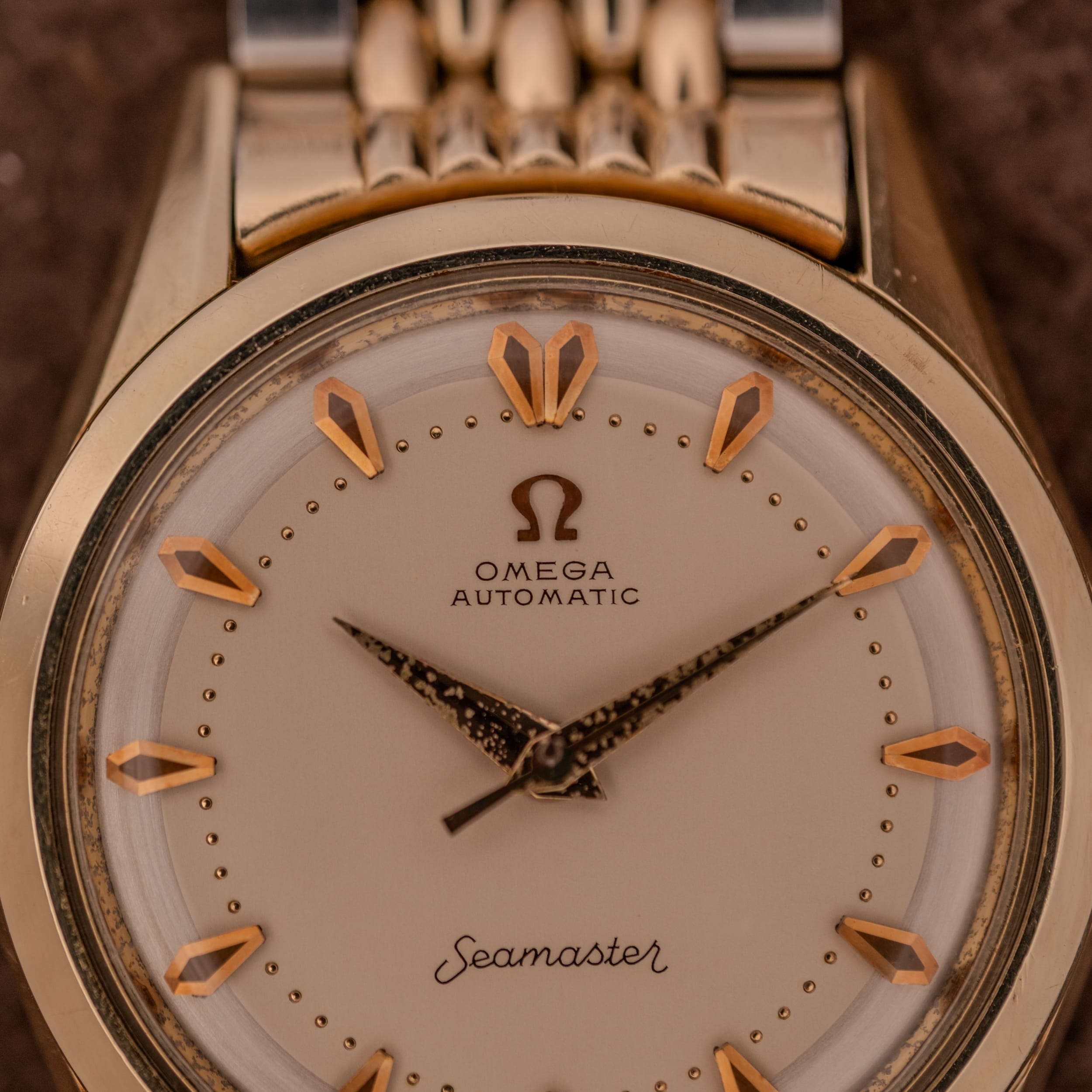 This particular example is, to us, exactly the kind of vintage Omega that makes the hunt worthwhile. The champagne dial has held up beautifully, retaining a warm, creamy tone that feels rich without being ostentatious. The applied faceted arrow markers in gold catch the light with a gorgeous dimensionality that simply cannot be replicated by printed indices, and the fine dot minute track adds a layer of refinement that is quintessentially 1950s Omega. The “Seamaster” script at six o’clock is crisp, and the Omega logo and “Automatic” text at twelve remain fully legible and well-defined. The dauphine hands show their age through the darkened, granular texture of the original radium lume, which has developed a characterful, almost volcanic patina. It’s the kind of honest aging that tells you these hands have never been swapped or refinished.