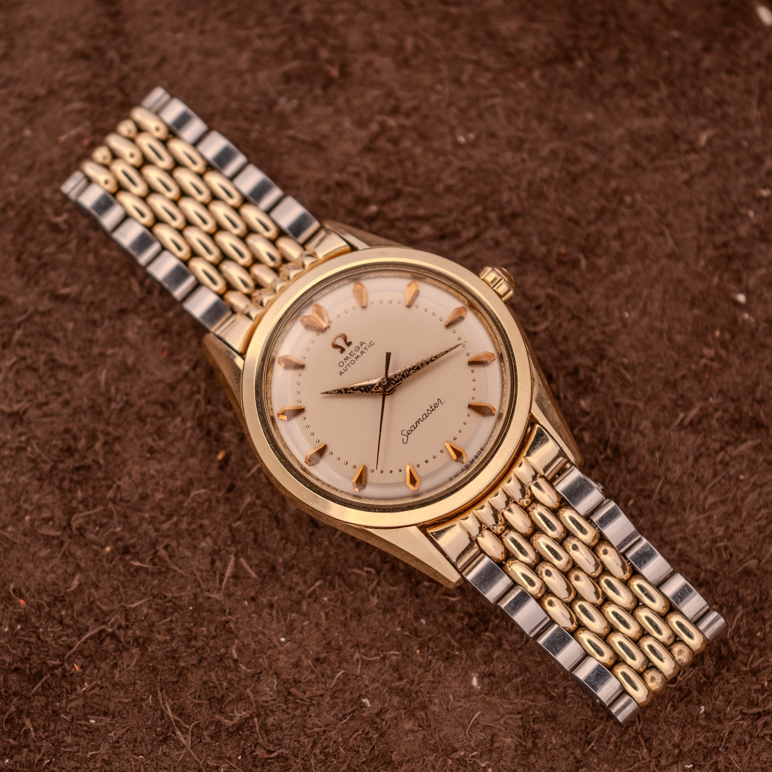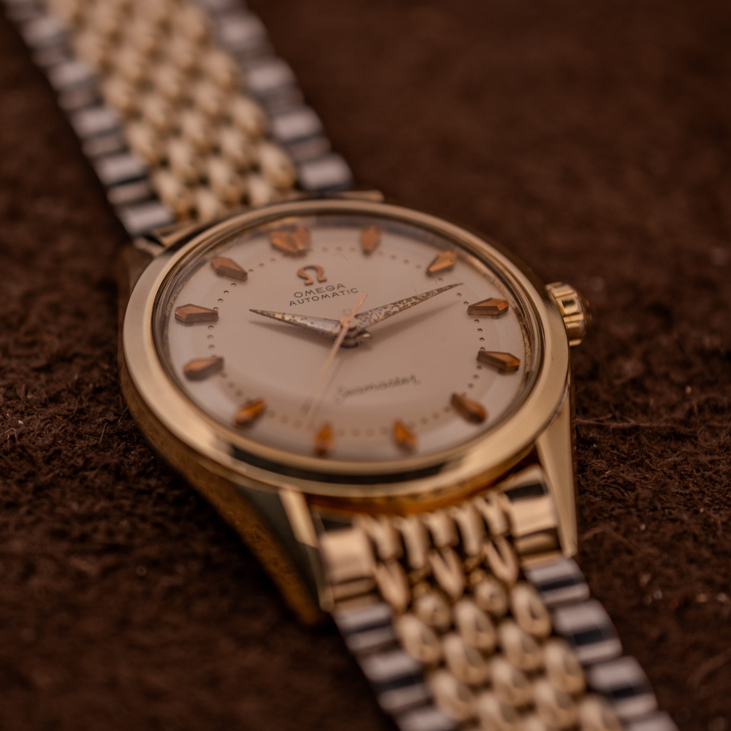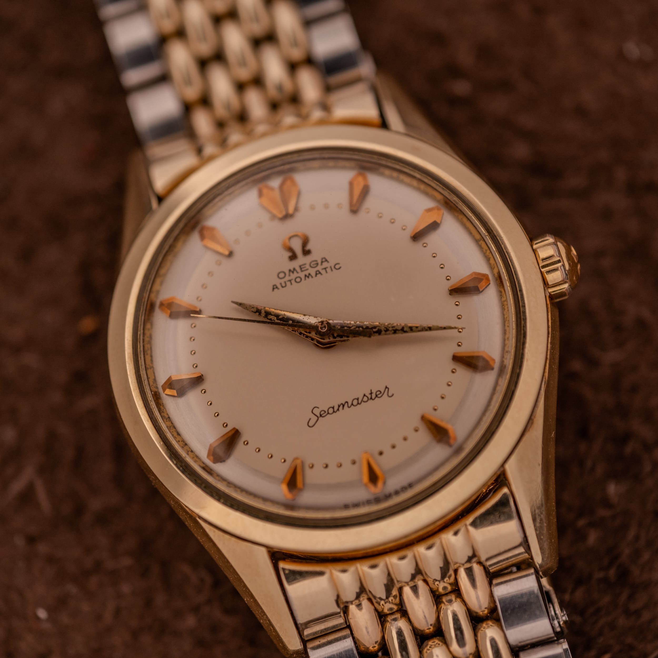 This particular example is, to us, exactly the kind of vintage Omega that makes the hunt worthwhile. The champagne dial has held up beautifully, retaining a warm, creamy tone that feels rich without being ostentatious. The applied faceted arrow markers in gold catch the light with a gorgeous dimensionality that simply cannot be replicated by printed indices, and the fine dot minute track adds a layer of refinement that is quintessentially 1950s Omega. The “Seamaster” script at six o’clock is crisp, and the Omega logo and “Automatic” text at twelve remain fully legible and well-defined. The dauphine hands show their age through the darkened, granular texture of the original radium lume, which has developed a characterful, almost volcanic patina. It’s the kind of honest aging that tells you these hands have never been swapped or refinished.