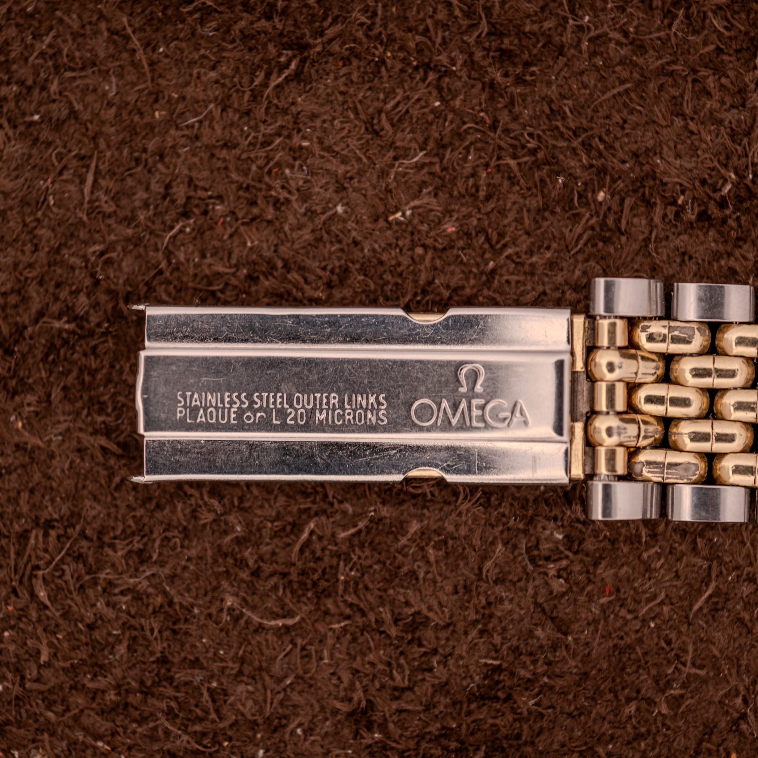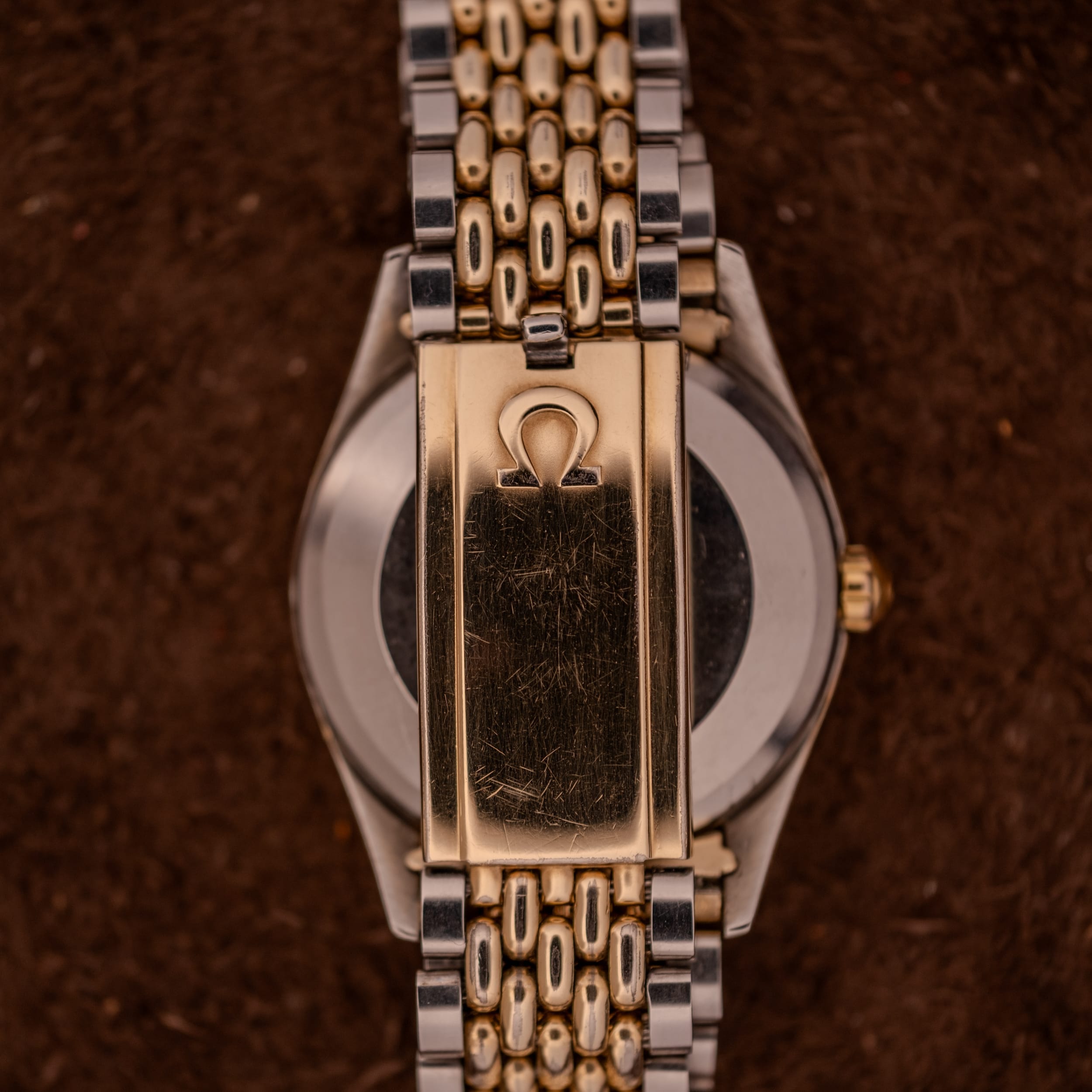 The gold-capped case shows the gentle wear you’d expect from a watch that was genuinely worn and loved. There is some light brassing visible along the bezel edge and around the lugs where the gold has thinned over decades of daily use, lending the piece an authenticity that collectors prize. The caseback, stamped clearly with the 2802 reference and “ACIER INOXYDABLE,” remains in solid condition with its gasket still in place. What really elevates this package, though, is the original Omega beads-of-rice bracelet. Finding these bracelets intact and on the correct watch is increasingly difficult, and this one, with its two-tone gold-plated and stainless steel links and signed clasp reading “PLAQUE OR L 20 MICRONS,” completes the watch in a way that a leather strap simply cannot replicate. The bracelet shows honest wear with some plating loss and stretch consistent with its age, but it remains fully functional and drapes beautifully on the wrist.