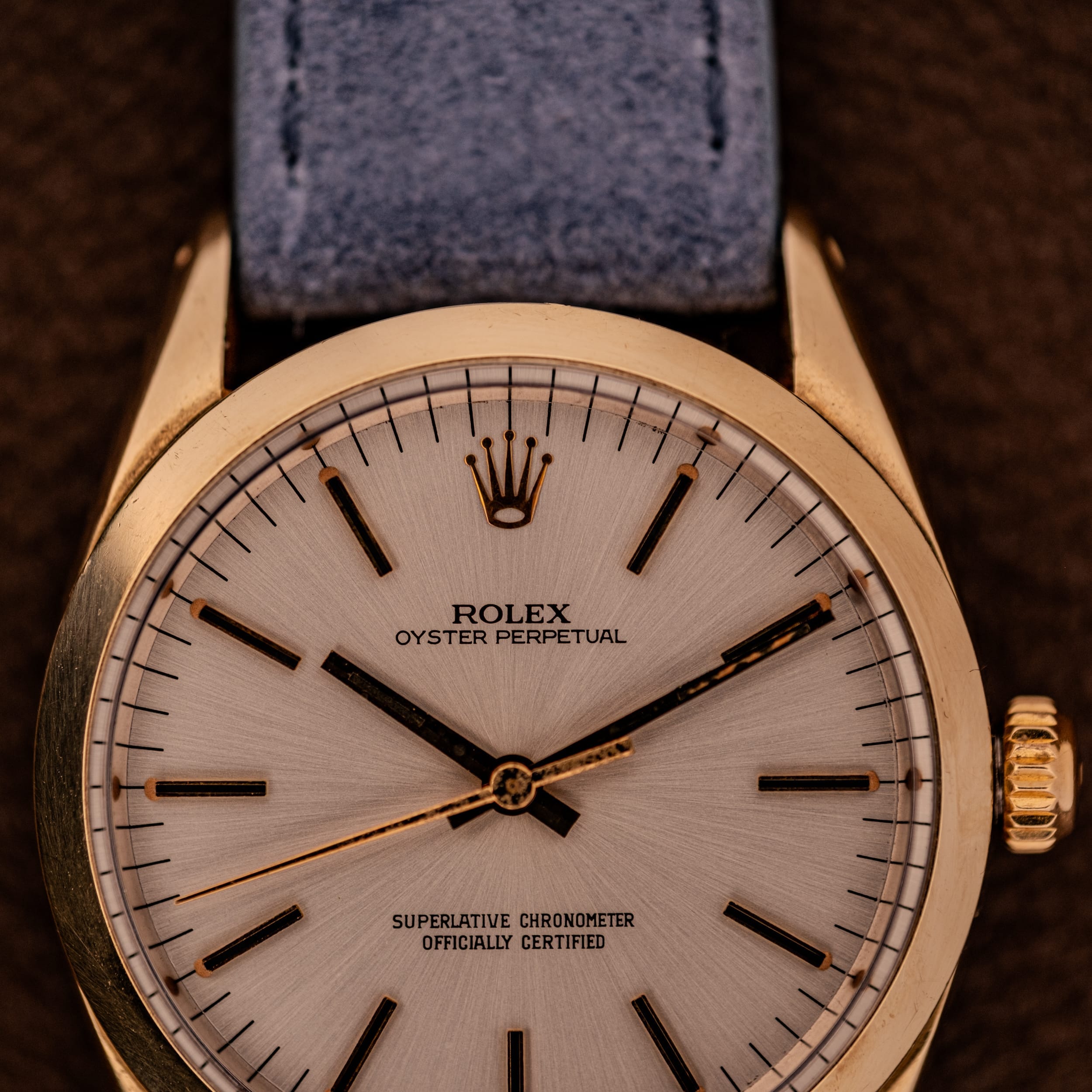 This particular example is a stunner. The silver sunburst dial is in fantastic condition, exhibiting that gorgeous radial brushing that catches and throws light with every movement of the wrist. Applied gold stick indices with black enamel inlays provide sharp contrast and excellent legibility, while the gold dauphine hour and minute hands add a refined, dressy touch. The Rolex coronet sits proudly at twelve in applied gold, and the four lines of text, “ROLEX,” “OYSTER PERPETUAL,” and the two-line “SUPERLATIVE CHRONOMETER OFFICIALLY CERTIFIED” designation, are all cleanly printed. The “T SWISS T” marking at six o’clock confirms tritium luminous material. It’s a dial that has been well cared for and presents beautifully, with the kind of clean, balanced layout that Rolex has always excelled at.