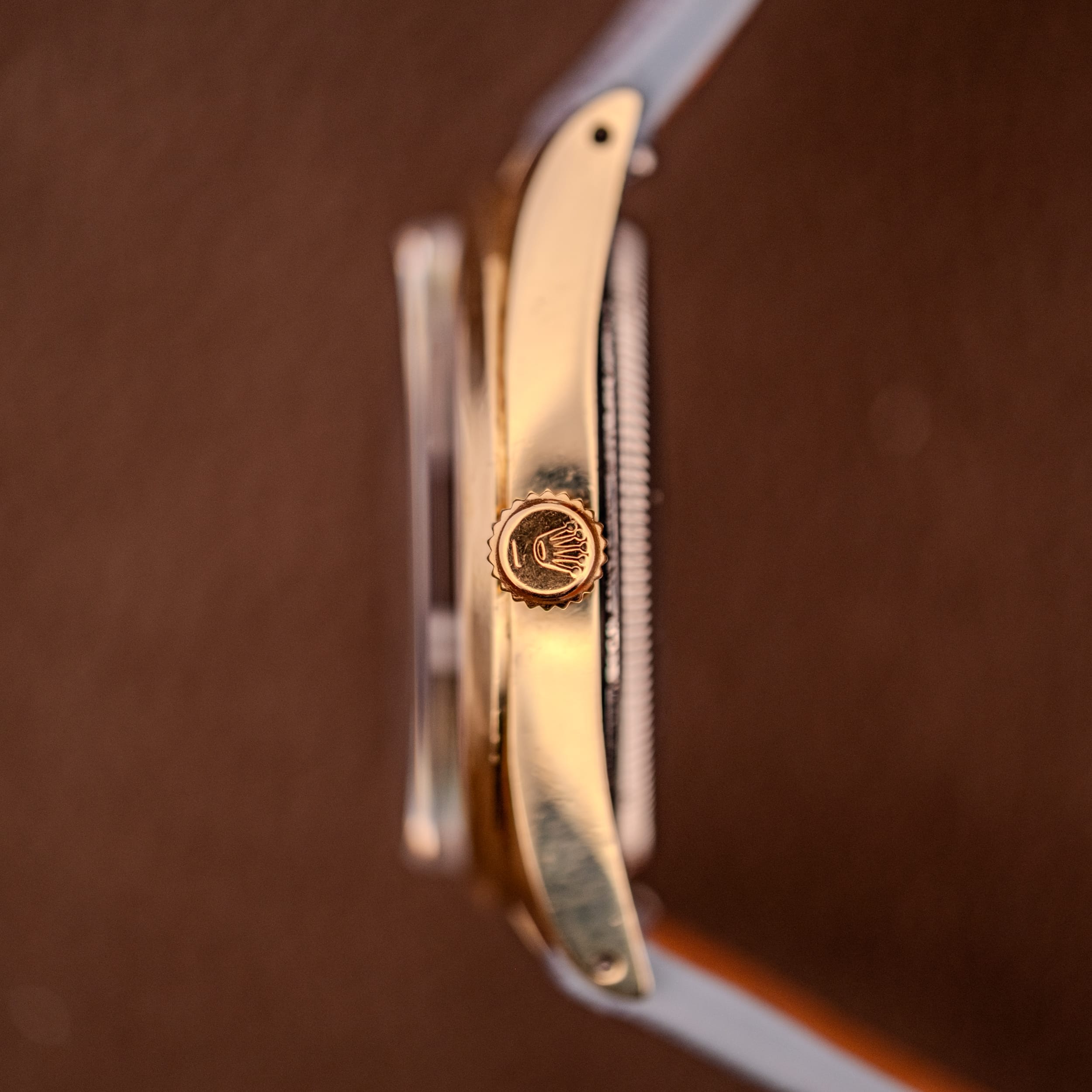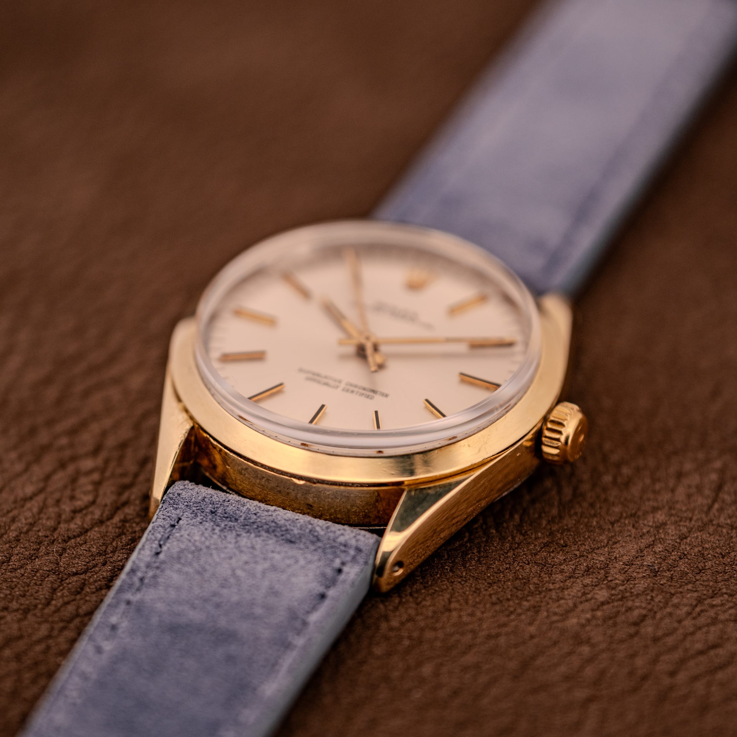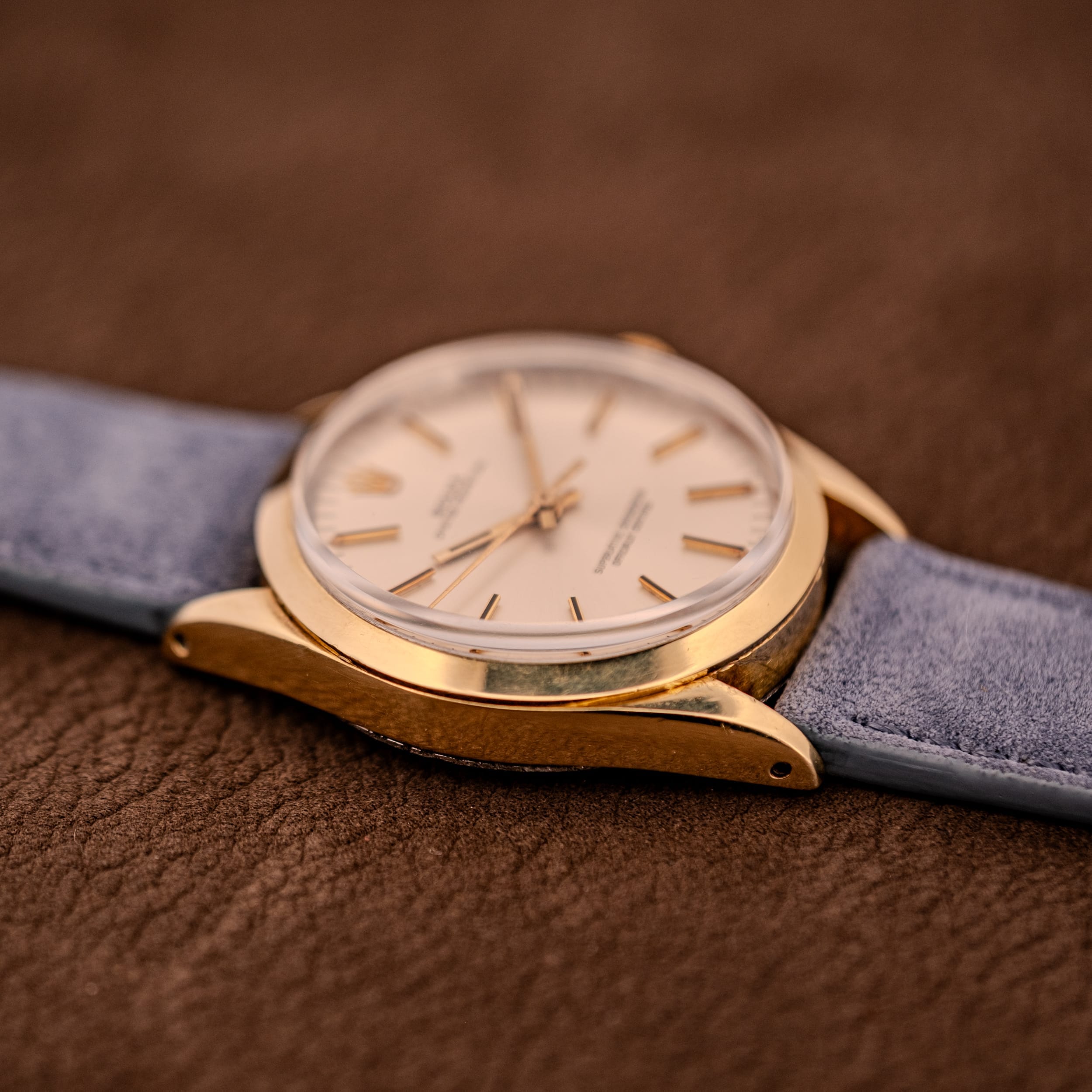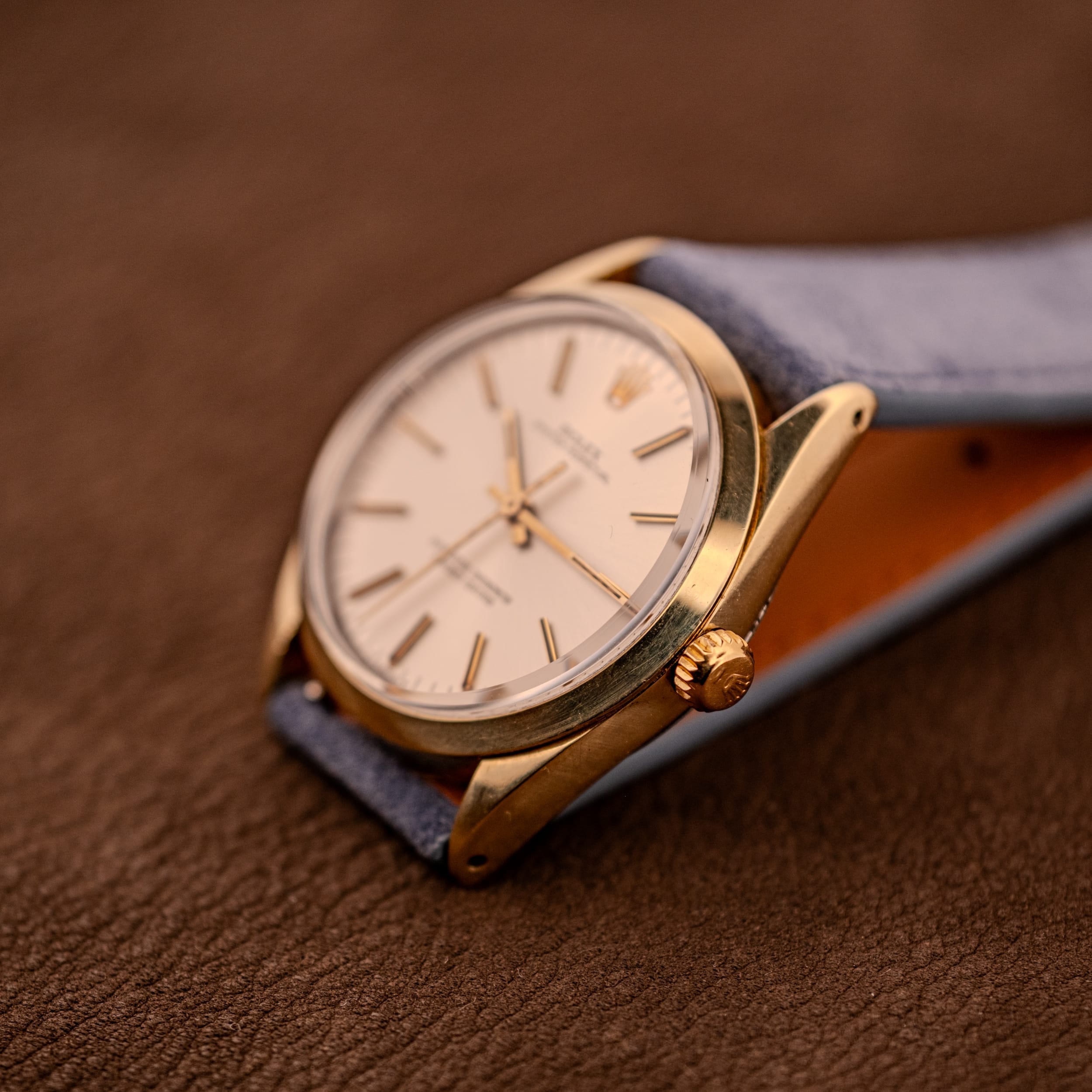 The Rolex Oyster Perpetual is where the entire Rolex mythology begins. Strip away the bezels, the complications, and the sub-dial clutter, and what you’re left with is the purest expression of what Rolex does best: a superlatively accurate, hermetically sealed, self-winding wristwatch in a beautifully proportioned case. The Reference 1024 occupies a particularly sweet spot in the Oyster Perpetual lineage. Produced through the 1960s and into the 1970s, it offered the full Rolex experience, chronometer-certified automatic movement, the legendary Oyster case, and that unmistakable crown on the dial, in a size and configuration that remains remarkably contemporary today. At 34mm, the 1024 fits squarely in the classic dress-watch sweet spot that modern collectors are increasingly gravitating back toward, and in its gold-capped configuration, it delivers a warmth and richness on the wrist that stainless steel simply cannot match.