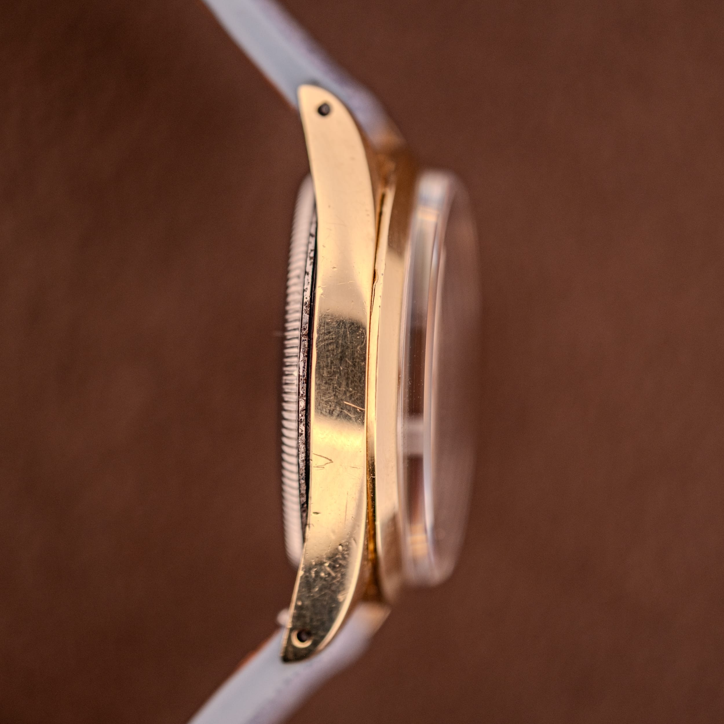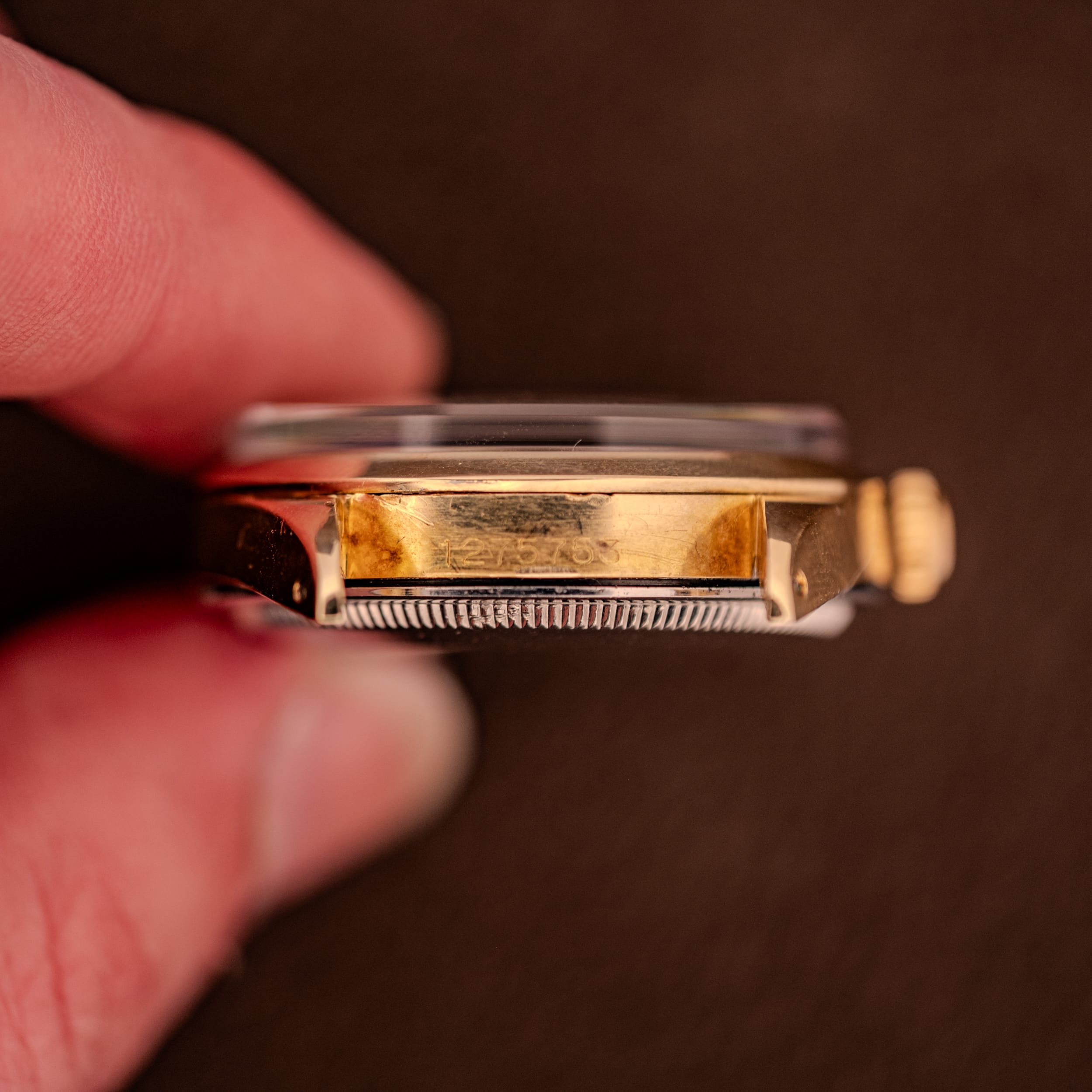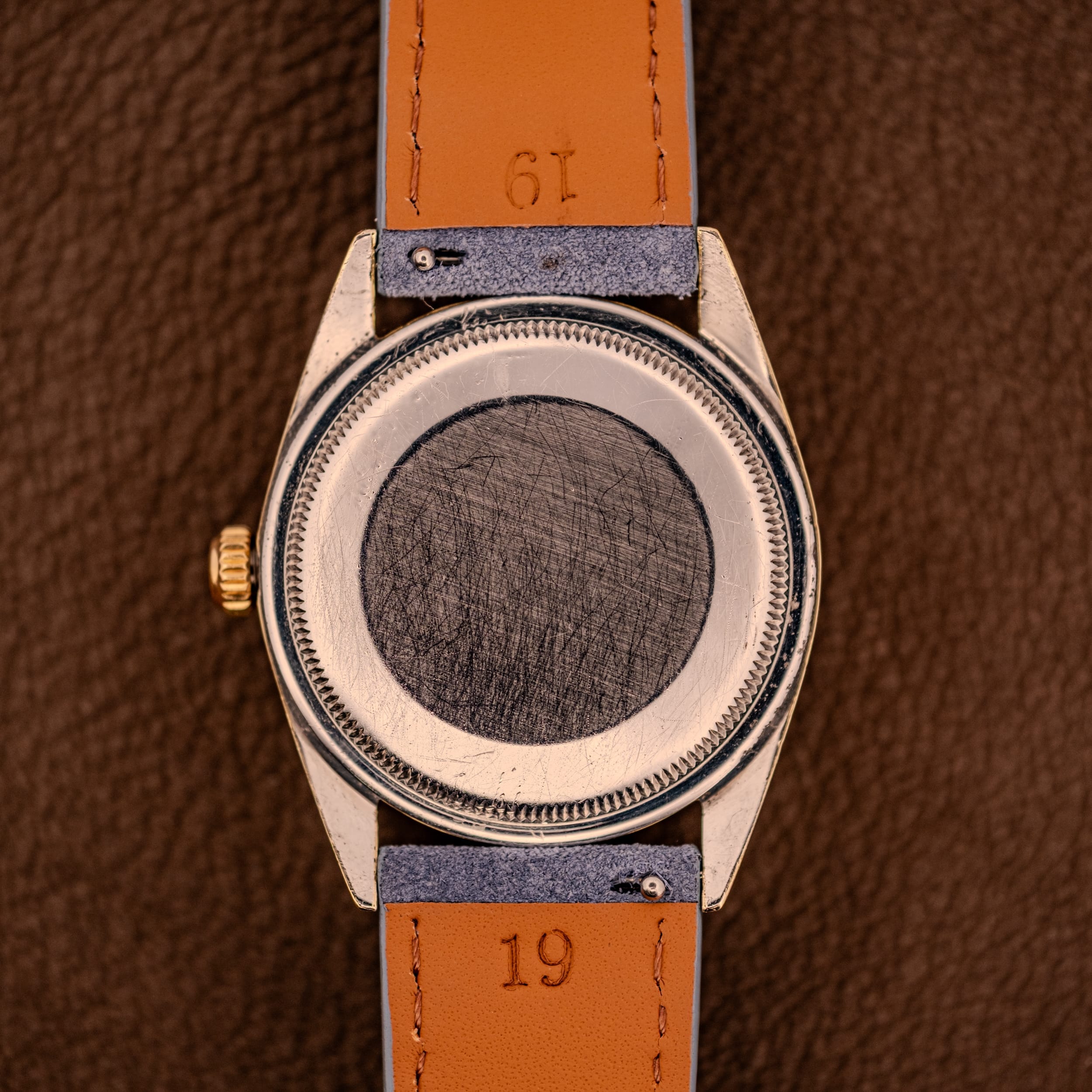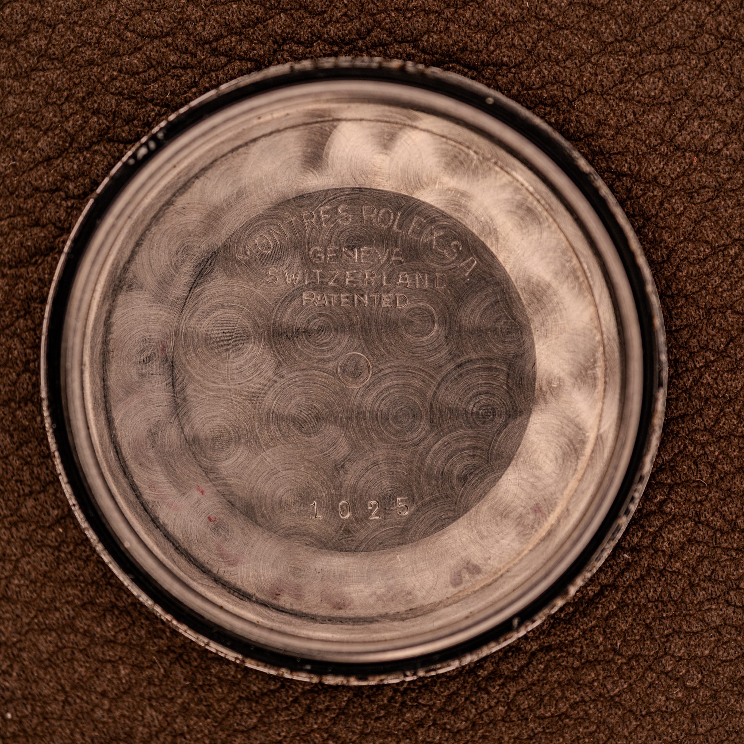 The 14K gold-capped case is in honest condition, showing the signs of a watch that’s been worn and enjoyed. The lugs retain their original shape and the polished surfaces still gleam warmly, though there is some expected wear and light surface marks consistent with decades of use, which is perfectly appropriate for a vintage piece with this kind of warmth. The signed Rolex crown is original and the case flanks reveal the “REGISTERED DESIGN” stamp on one side and the serial number on the other. The stainless steel screw-down caseback is stamped “MONTRES ROLEX S.A. GENEVA SWITZERLAND PATENTED” with the 1025 case number, and pops open to reveal the workhorse within: the Caliber 1560, a 26-jewel automatic movement adjusted to five positions and temperature. This is one of Rolex’s most robust and reliable movements from the era, a proven engine that has earned its reputation for accuracy and longevity across countless examples worldwide. The “MONTRES ROLEX S.A.” signed rotor sweeps beautifully across the movement, and everything here looks healthy and well-maintained.