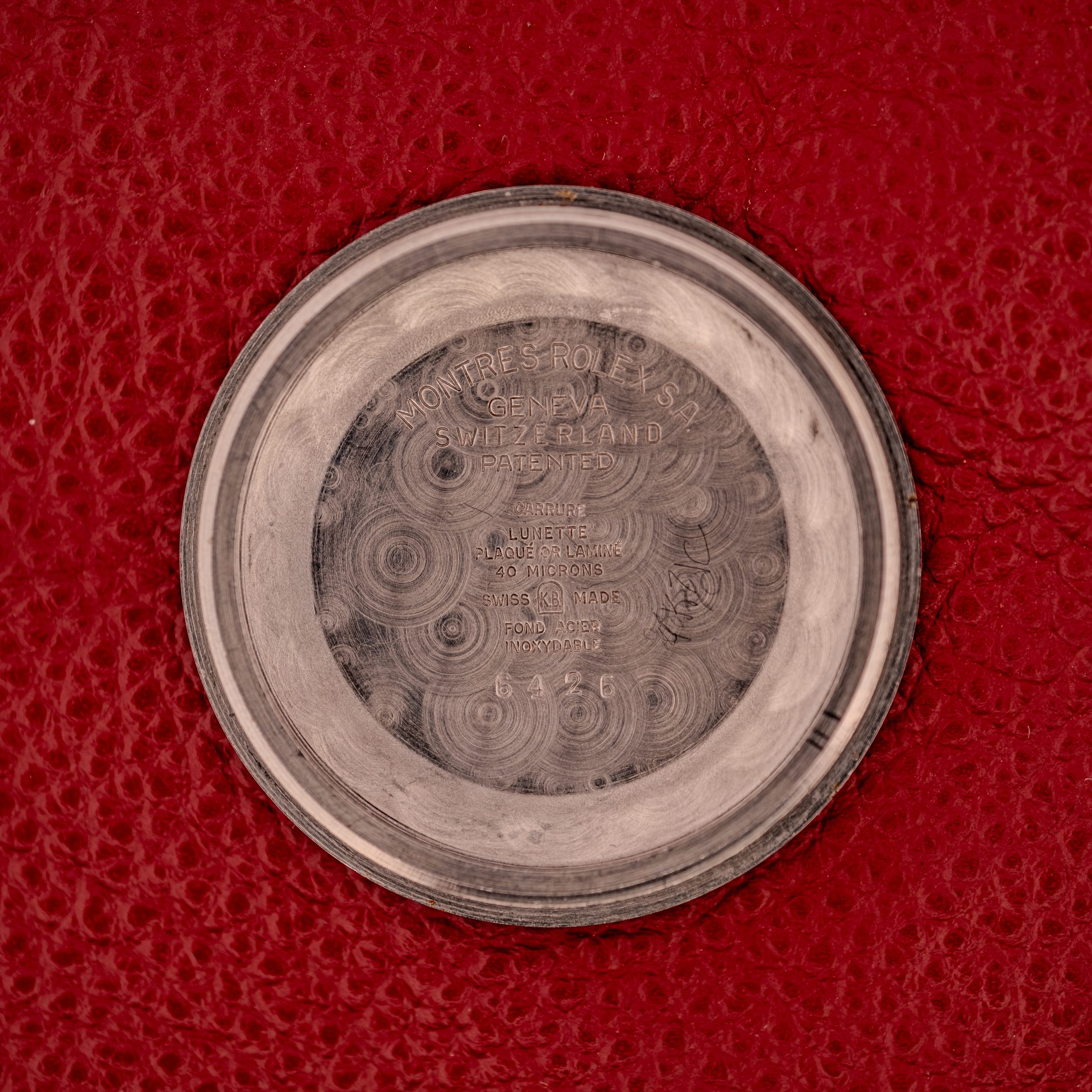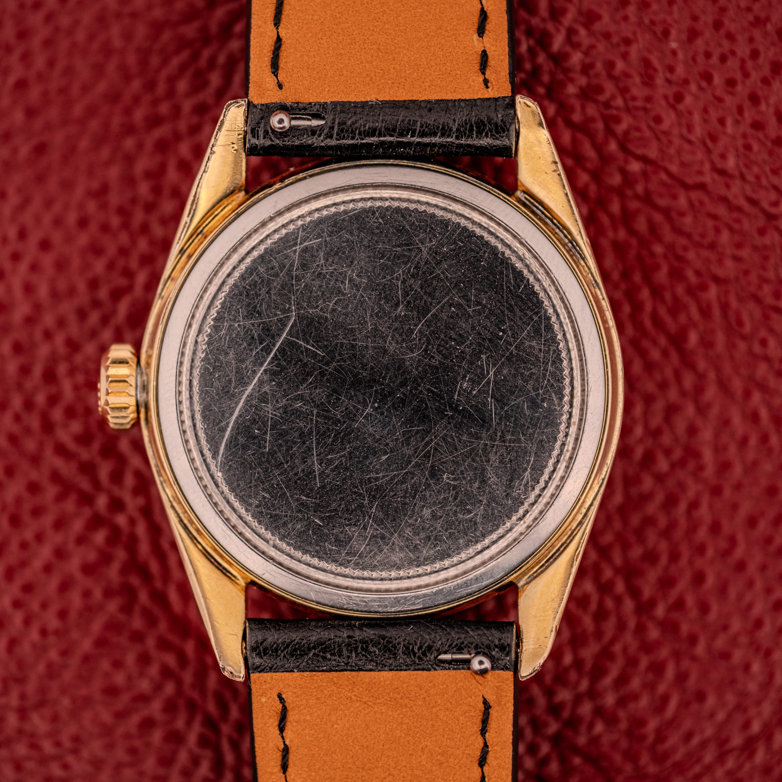 The case is a two-tone construction with a gold-plated carrure and bezel at a generous 40-micron thickness over a stainless steel caseback. The inside of the caseback is stamped with the full Rolex markings: “MONTRES ROLEX S.A. / GENEVA / SWITZERLAND / PATENTED,” along with “CARRURE / LUNETTE / PLAQUE OR LAMINE / 40 MICRONS,” “SWISS KB MADE,” “FOND ACIER INOXYDABLE,” and the reference 6426. The caseback shows typical wear scratches consistent with decades of use, and the gold plating on the case sides and between the lugs shows some wear-through, which is entirely normal for a gold plated case of this vintage. The crown is Rolex-signed and correct for the reference. Overall, the case retains a warm, rich golden tone that pairs beautifully with the dial.