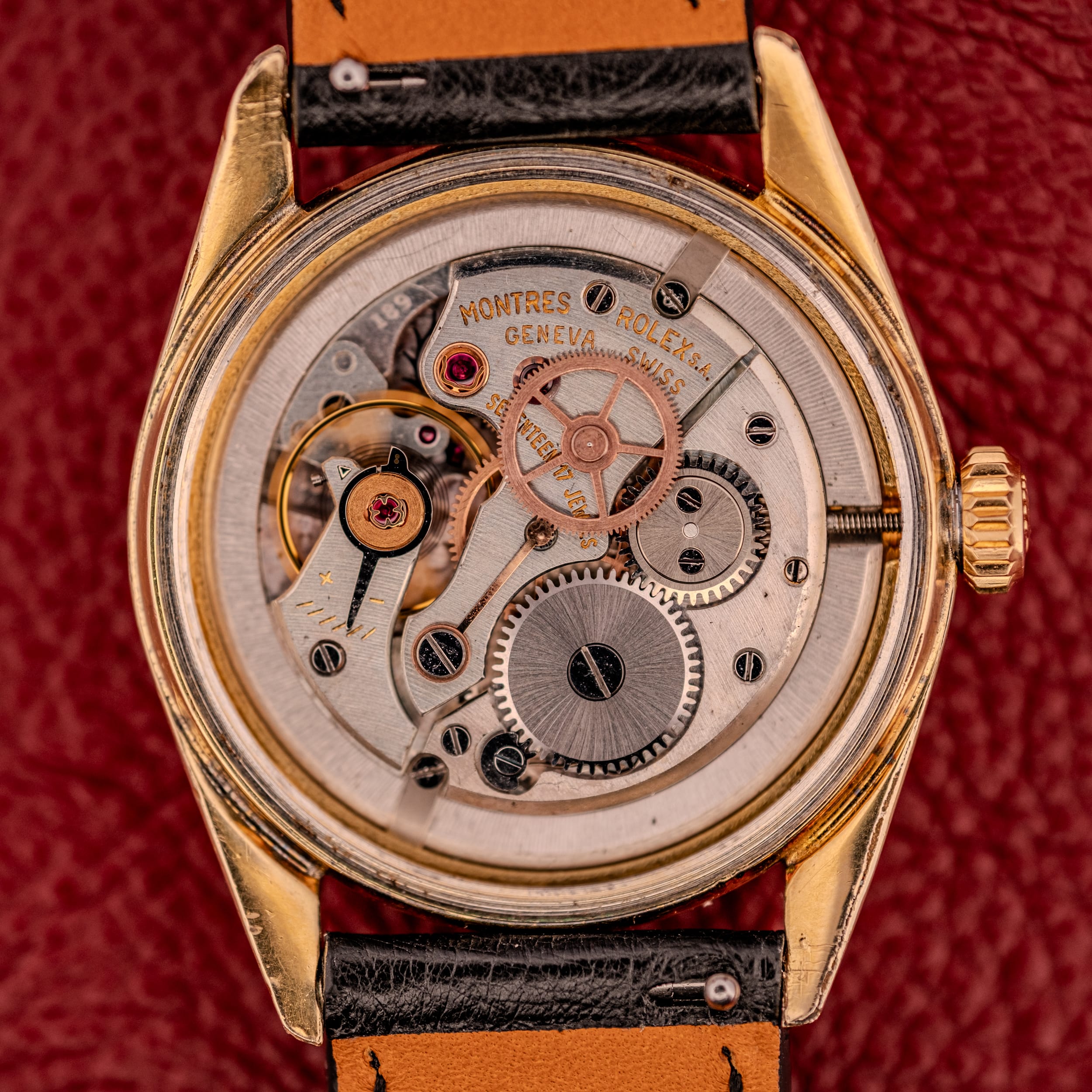 Inside beats the Rolex caliber 1225, a hand-wound movement with 17 jewels that represents the workhorse engineering Rolex built its reputation on. The movement, visible in our photographs with the caseback removed, is signed “MONTRES ROLEX S.A. / GENEVA SWISS / SEVENTEEN 17 JEWELS” and displays the clean, workmanlike architecture that defines Rolex’s approach to manual-wind calibers. There is no rotor, no date mechanism, no unnecessary complexity. What you get instead is a movement that winds smoothly, keeps reliable time, and sits thin enough in the case to make the watch feel almost weightless on the wrist. That slimness is one of the great unsung virtues of the 6426, and it is something you notice the moment you put it on.