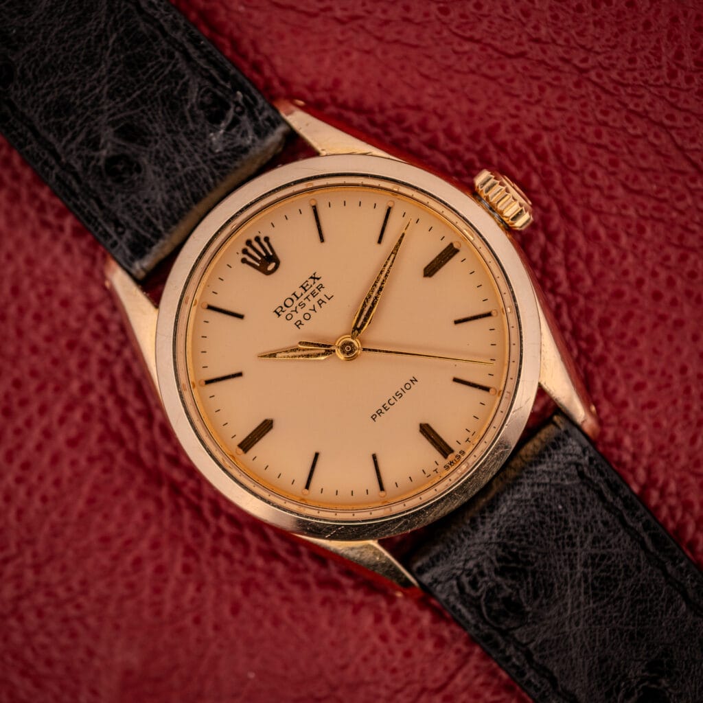 If you wanted to distill the Rolex Oyster concept down to its most essential form, you would arrive at something very close to the reference 6426. No date, no automatic winding, no complications of any kind. Just a hand-wound Rolex movement in a waterproof Oyster case with a screw-down crown and caseback. This was the entry point to the Rolex universe for decades, and it remains one of the longest-running references in the brand’s history, produced from the mid-1950s all the way through the late 1980s. But within the broader 6426 family, not all examples are created equal. This particular watch carries the “Royal” designation on its dial, a distinction that placed it a step above the standard Oyster Precision in Rolex’s mid-century hierarchy and one that collectors have increasingly come to appreciate. The dial reads “ROLEX / Oyster / ROYAL” above center and “PRECISION” below, a combination of names that speaks to a very specific moment in Rolex’s history when the brand still offered a clear, tiered lineup of manual-wind Oyster models.