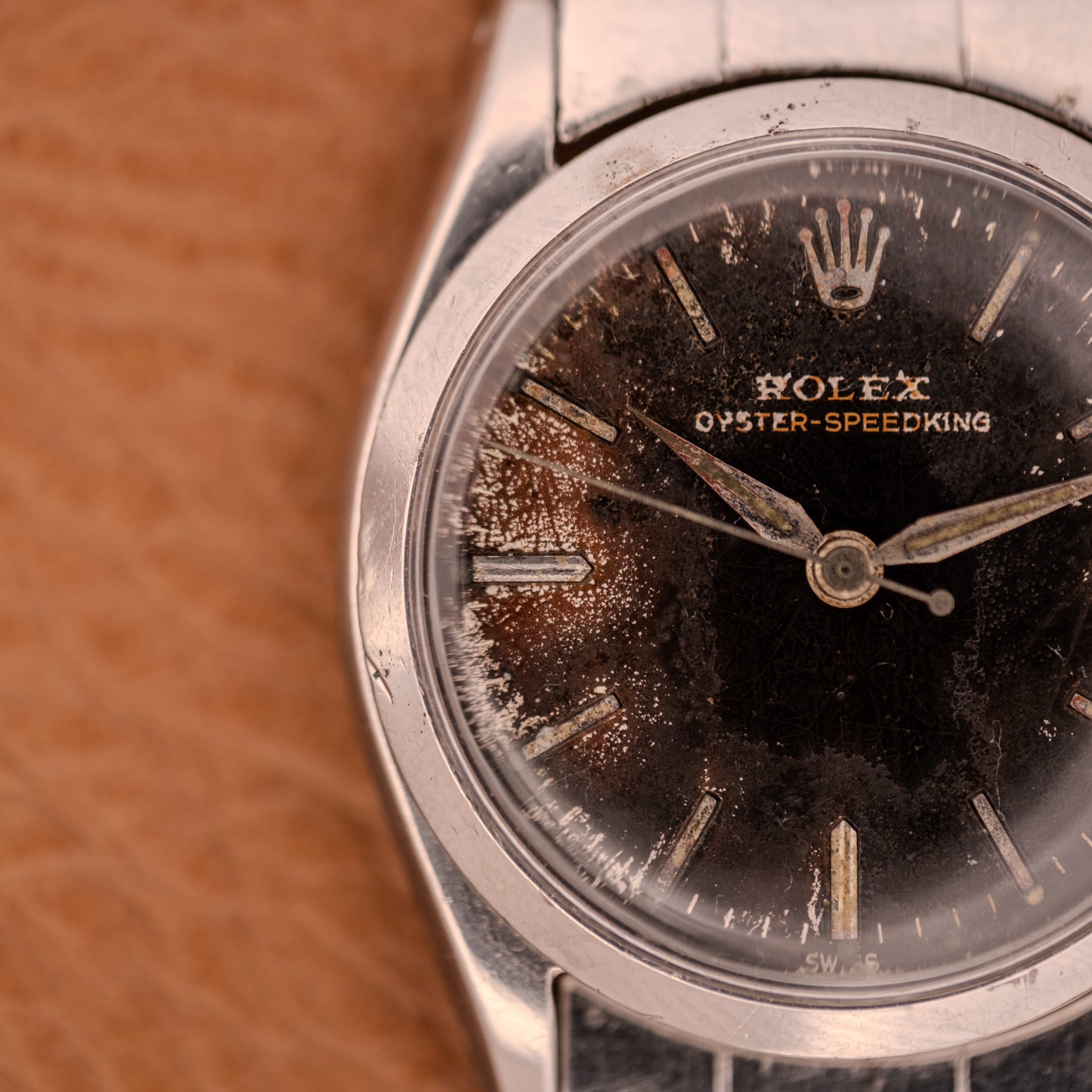 This particular example, however, is not a watch you buy for its movement alone. It’s the dial that commands attention. What was once a crisp, glossy black lacquer surface has undergone decades of extraordinary tropical aging, transforming into something that looks less like a watch dial and more like an abstract expressionist painting. Deep copper and burnt sienna tones bleed outward from the lower quadrant, while the upper portions retain darker, more charcoal-toned areas with scattered white speckles where the lacquer has continued to evolve. The gilt “ROLEX” and “OYSTER-SPEEDKING” text still reads clearly in warm gold against this dramatic backdrop, and the applied steel stick indices stand in sharp relief. The dauphine hands carry their original lume, now darkened with age. To be transparent, this is a dial with significant character, well beyond a gentle patina. There is moisture damage visible, and some lacquer degradation around the dial’s periphery. This is not a watch for the collector seeking pristine preservation. This is a watch for someone who looks at a dial like this and sees beauty in the chaos, who understands that no two tropical dials are alike and that this particular canvas can never be replicated.