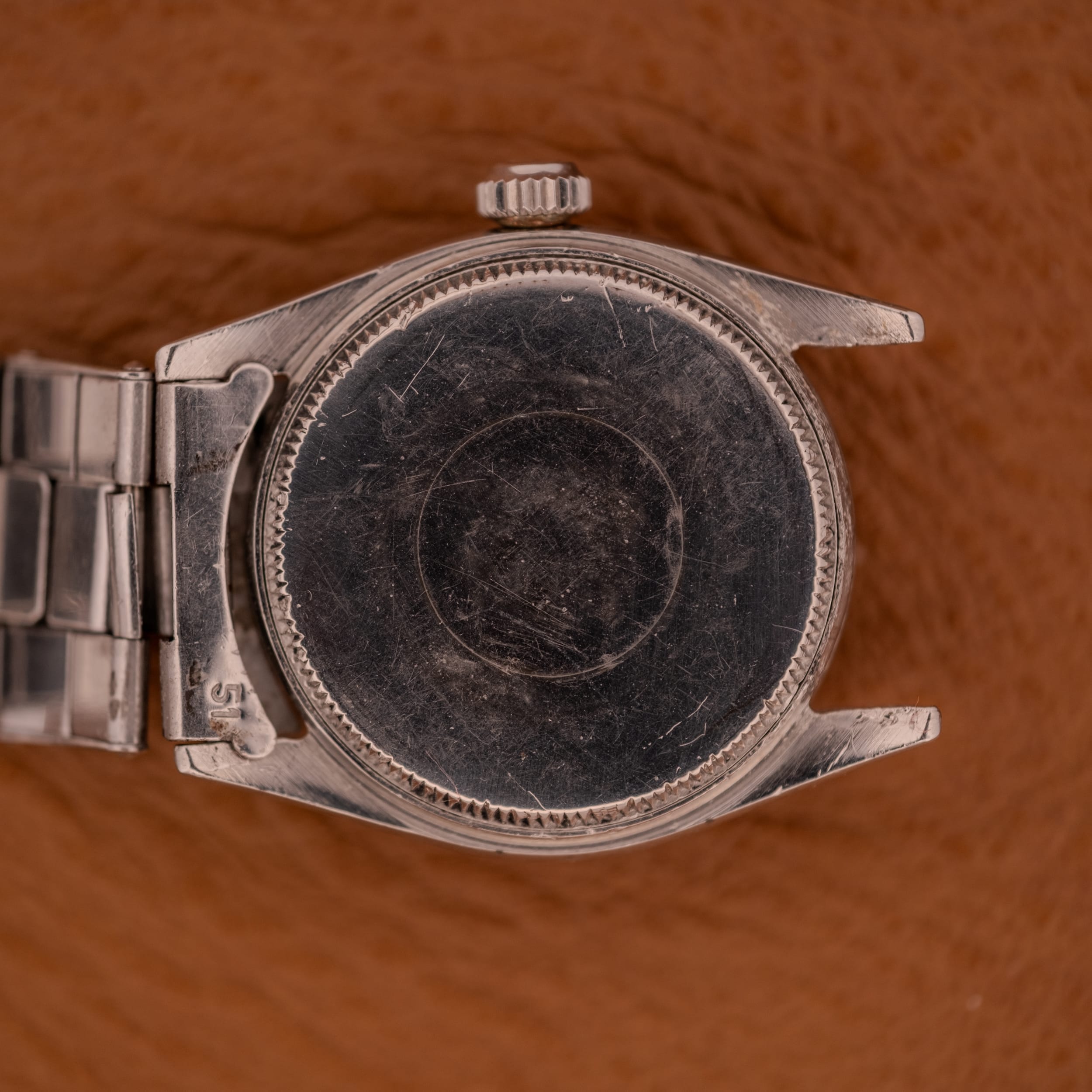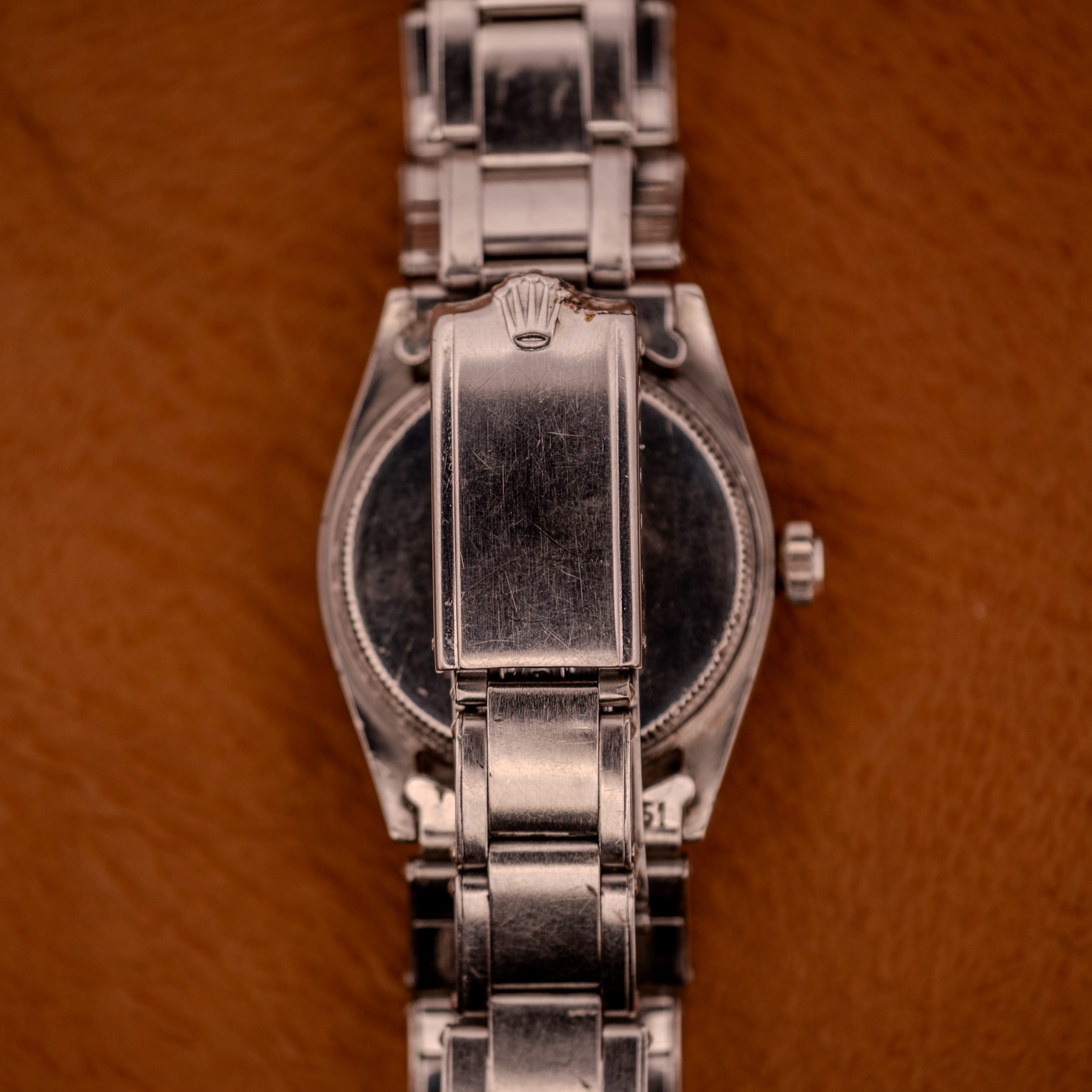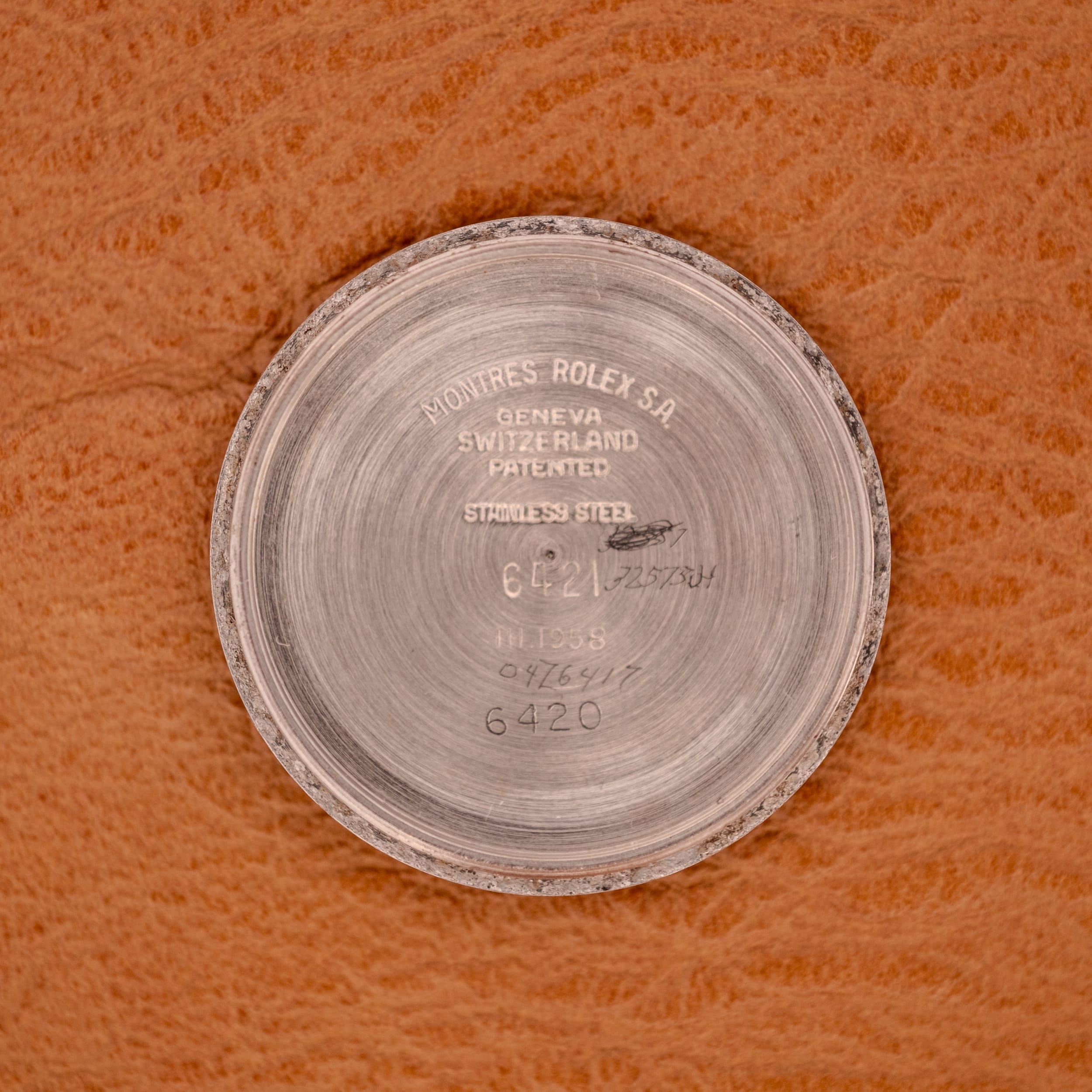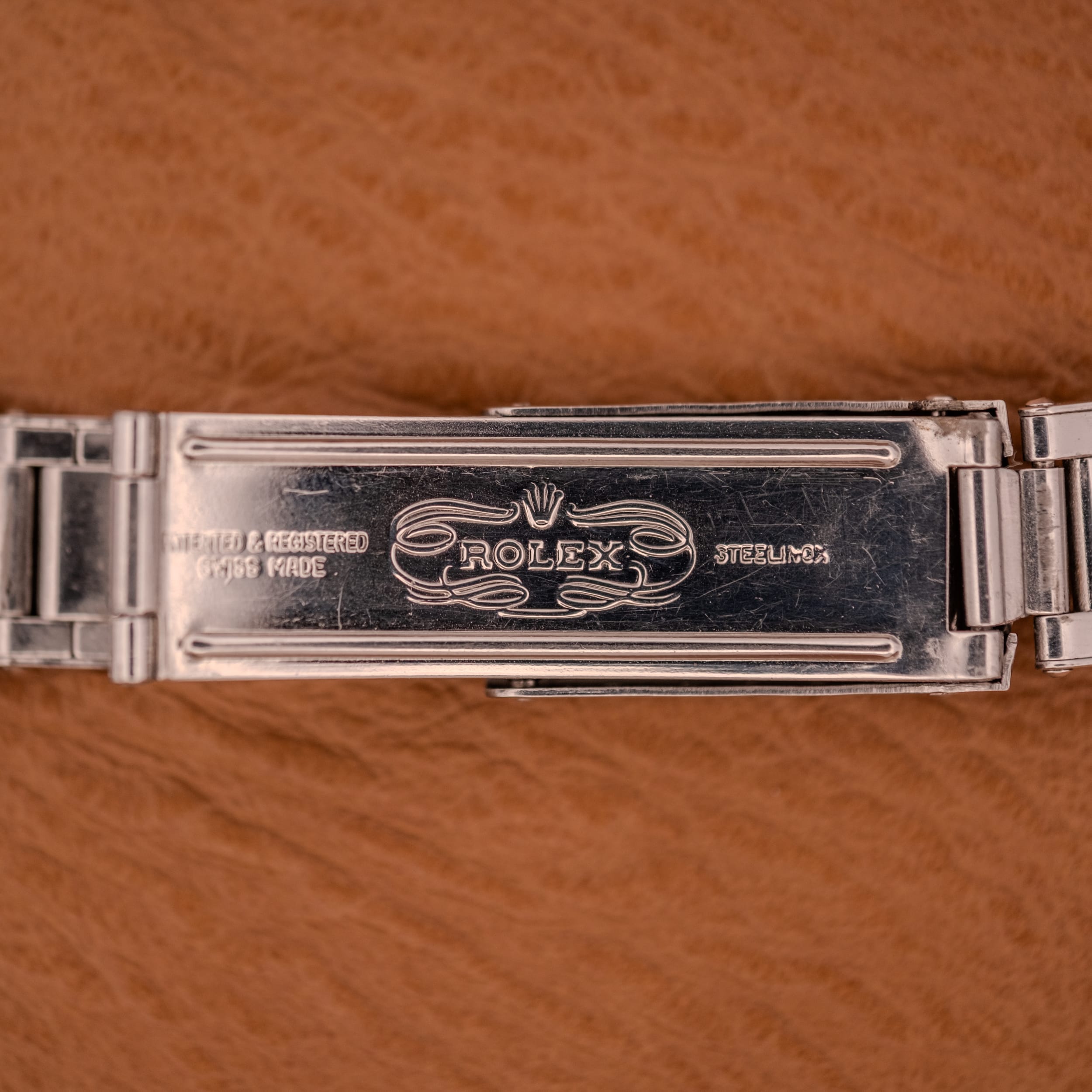 The stainless steel Oyster case shows the honest wear of a watch that spent decades on someone’s wrist, with surface scratches on the caseback and case sides consistent with real daily use. The lugs retain good definition, and the signed Rolex crown is original with the Coronet logo clearly visible. The caseback interior reveals a wonderful piece of provenance: the reference number 6421 has been crossed out and replaced with 6420, alongside a date stamp of III.1958, placing this watch firmly in the late 1950s. The riveted Oyster bracelet is a fantastic companion to this watch, with its signed “STEELINOX” clasp bearing the beautifully ornate vintage Rolex logo and “PATENTED & REGISTERED SWISS MADE” text. The bracelet shows wear and stretch consistent with its age, but it remains functional and adds tremendous period-correct appeal.
