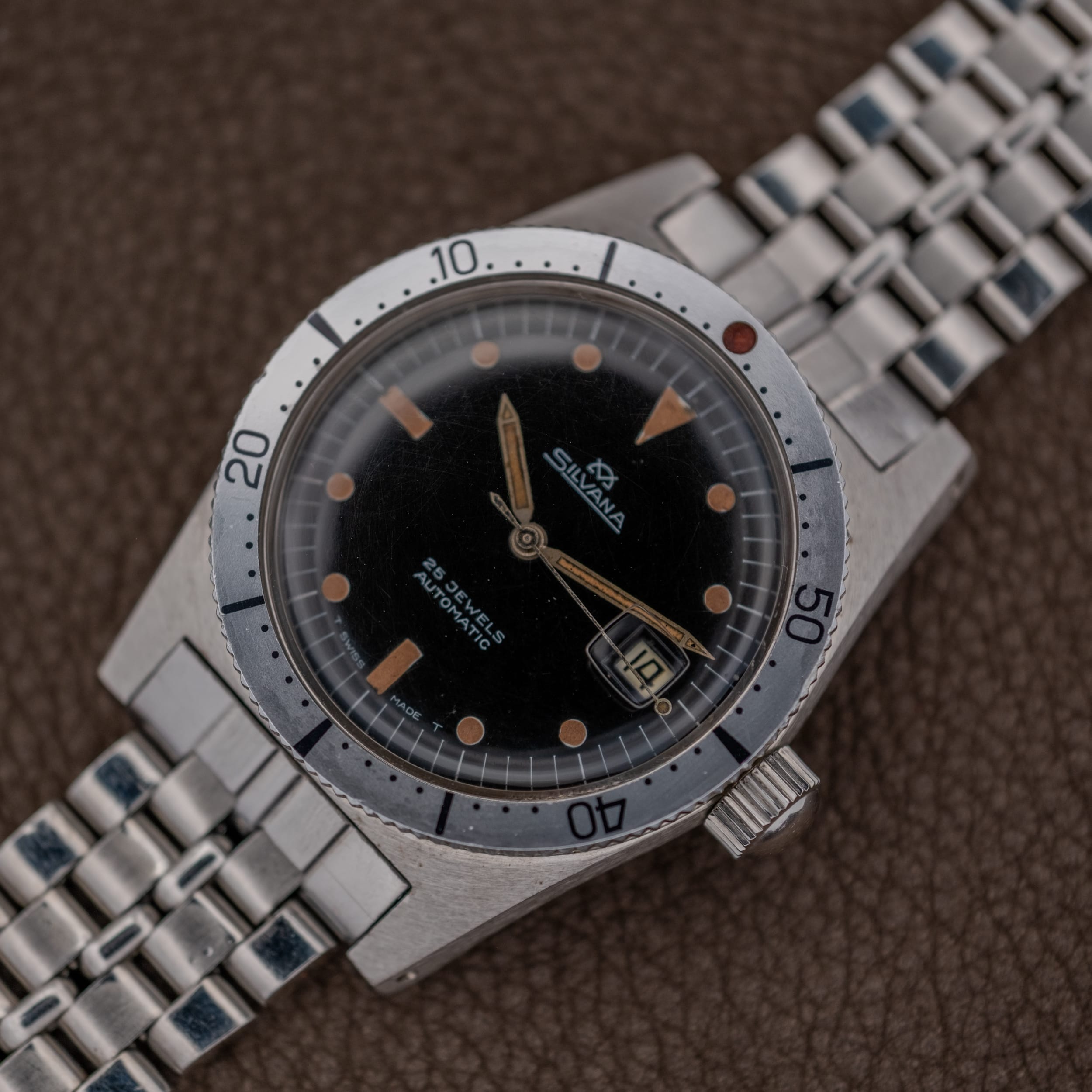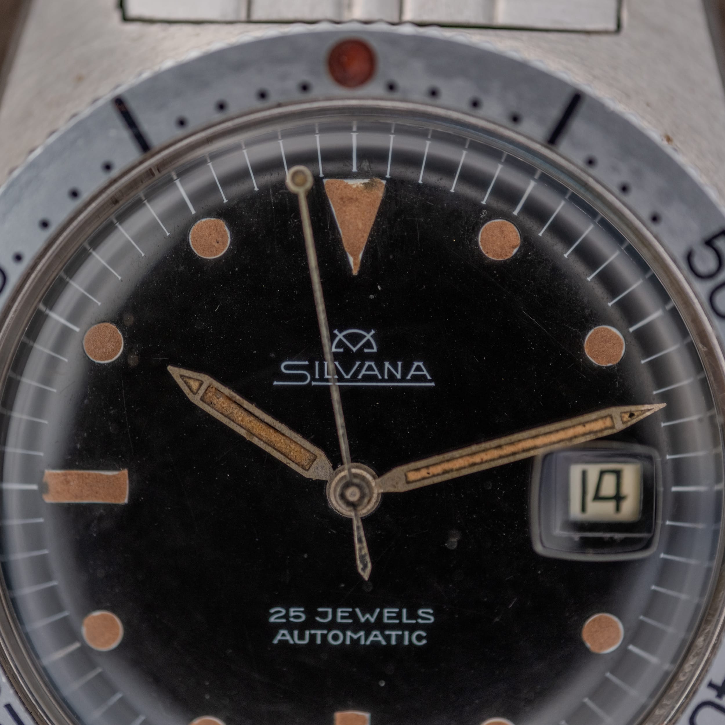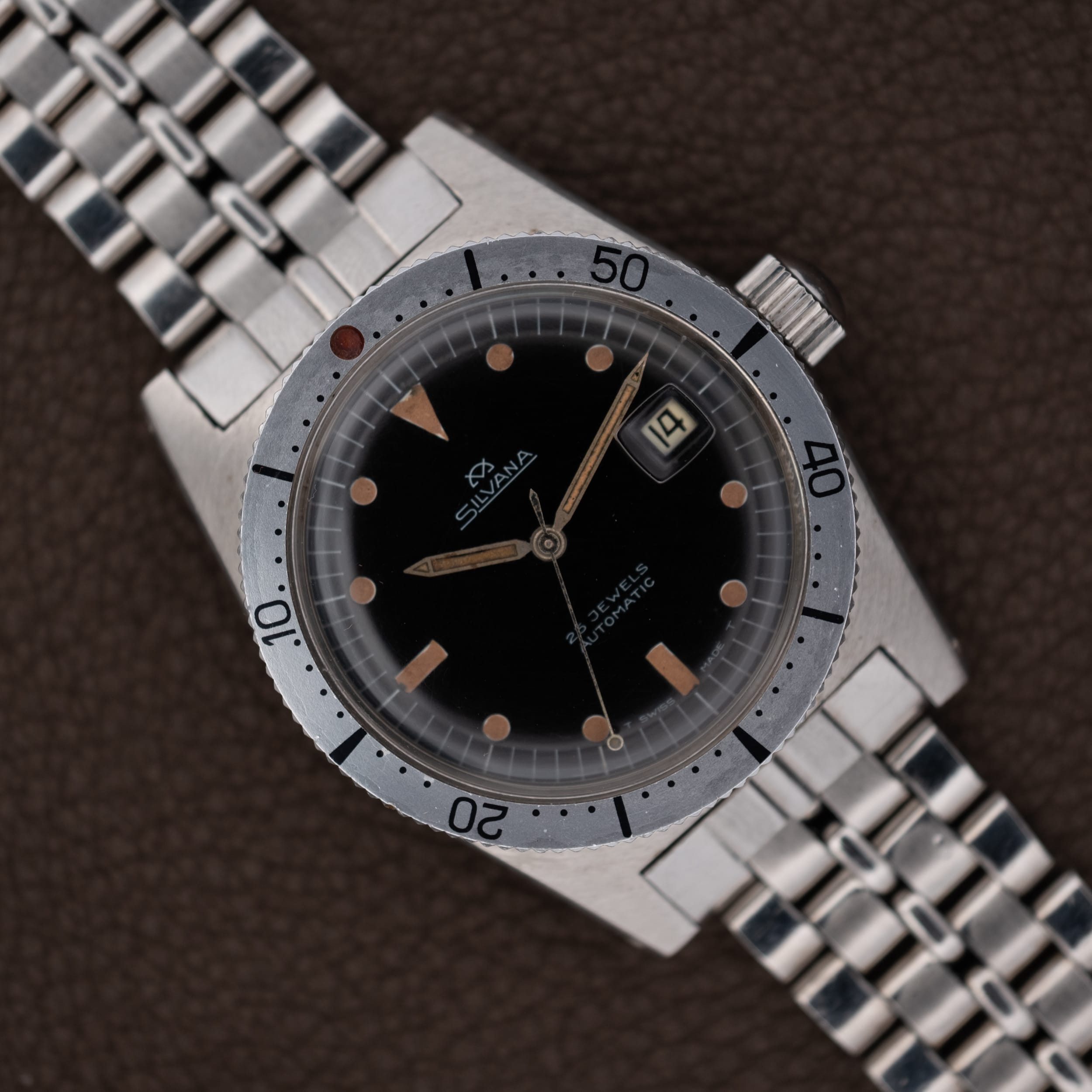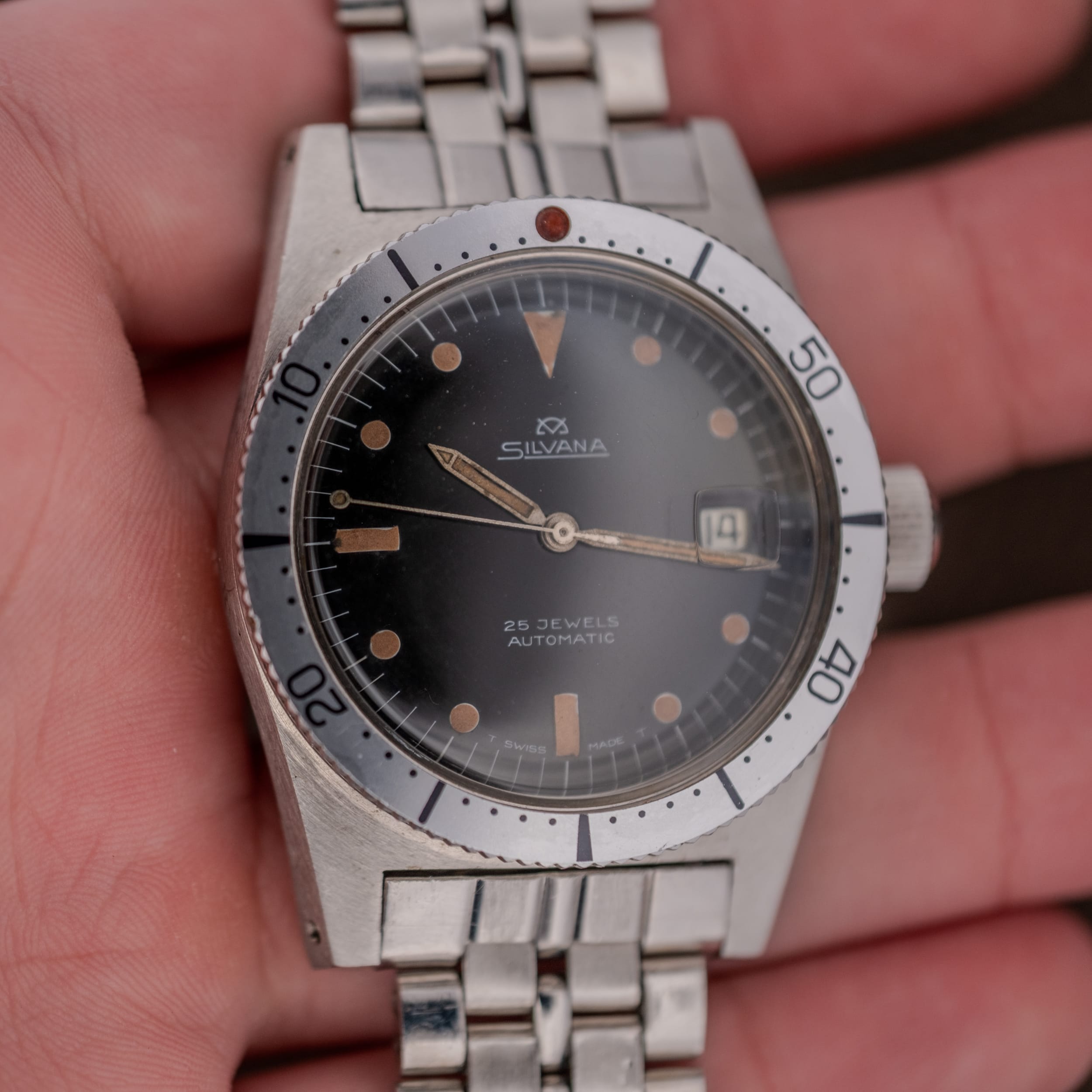 Silvana 25 Jewels Automatic skin diver in stainless steel featuring a glossy black dial with warm, caramel-aged tritium hour markers and matching sword handset. The dial is signed “Silvana” with the brand’s distinctive crosshair emblem, “25 Jewels,” and “Automatic,” with “T Swiss Made T” along the lower edge. A date window with framed aperture sits at 3 o’clock. The stainless steel case features angular, faceted lugs and a coin-edge bidirectional dive bezel with faded grey insert and red pearl pip at 12. Powered by the Swiss ETA caliber 2472 automatic movement, with a solid caseback. Presented on its original signed Silvana jubilee-style bracelet with branded folding clasp.
