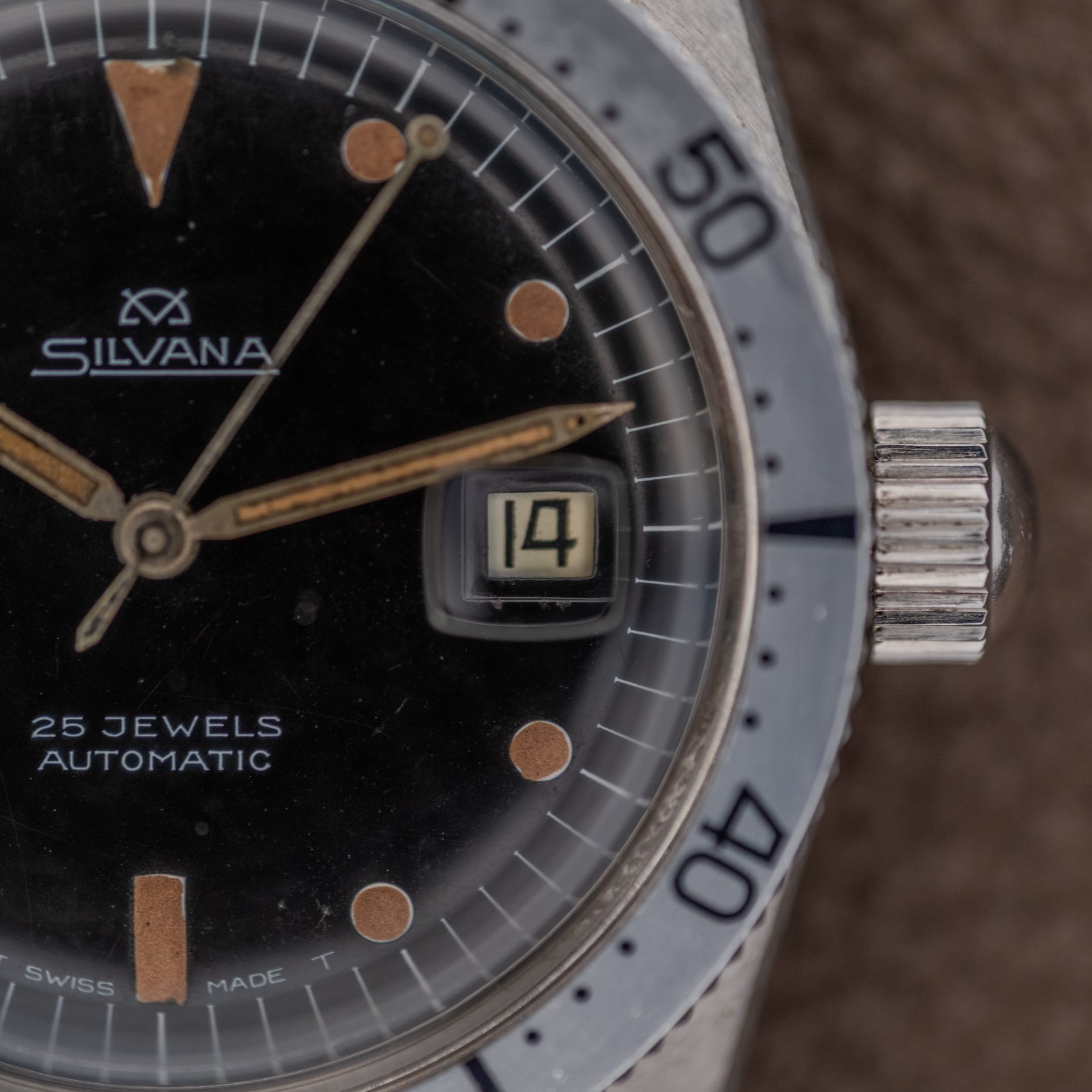 This particular example is a stunning time capsule of 1960s skin diver design. At its core beats the ETA caliber 2472, a robust 25-jewel automatic workhorse that powered countless Swiss sport watches of the era. It’s a movement that was chosen for its reliability and proven engineering, and it remains eminently serviceable today. The glossy black dial is wonderfully preserved, with its original tritium lume plots and sword hands having aged to a gorgeous, uniform caramel tone that practically glows against the jet-black surface. That kind of even, consistent patina is what collectors dream about; it cannot be faked, and it cannot be rushed. The Silvana crosshair logo and crisp white printing remain sharp and legible. A date window at 3 o’clock, framed by a polished surround, adds everyday functionality without disrupting the dial’s clean, purposeful layout.