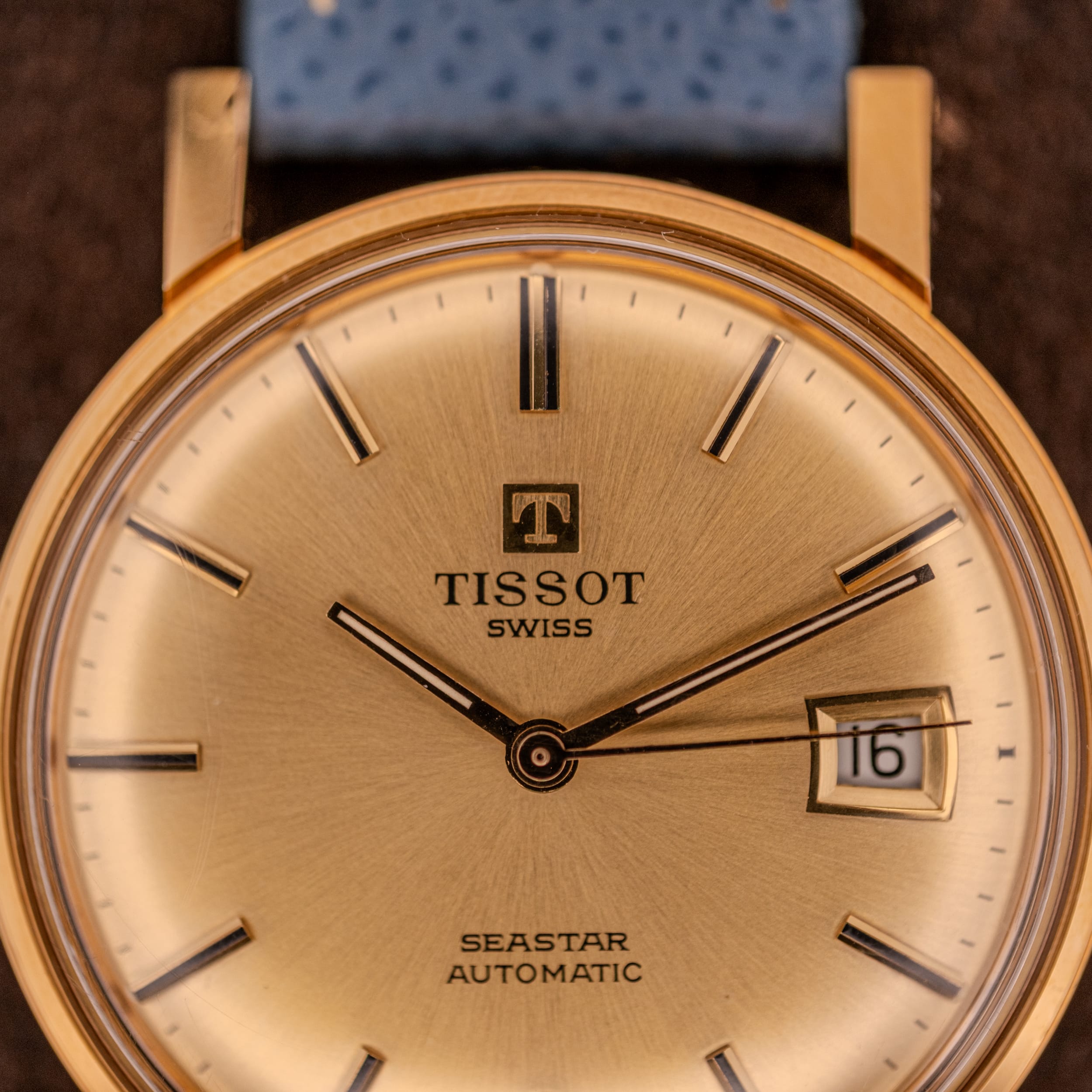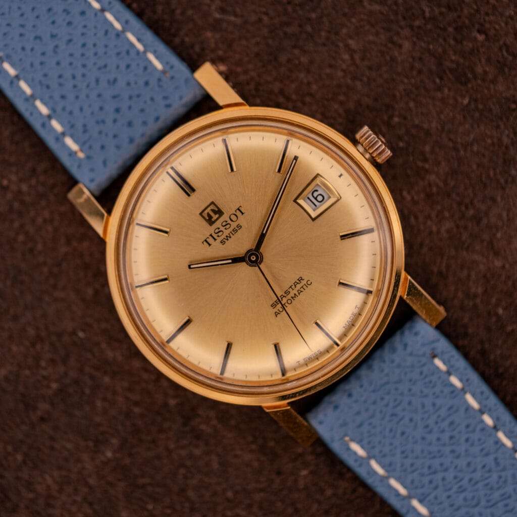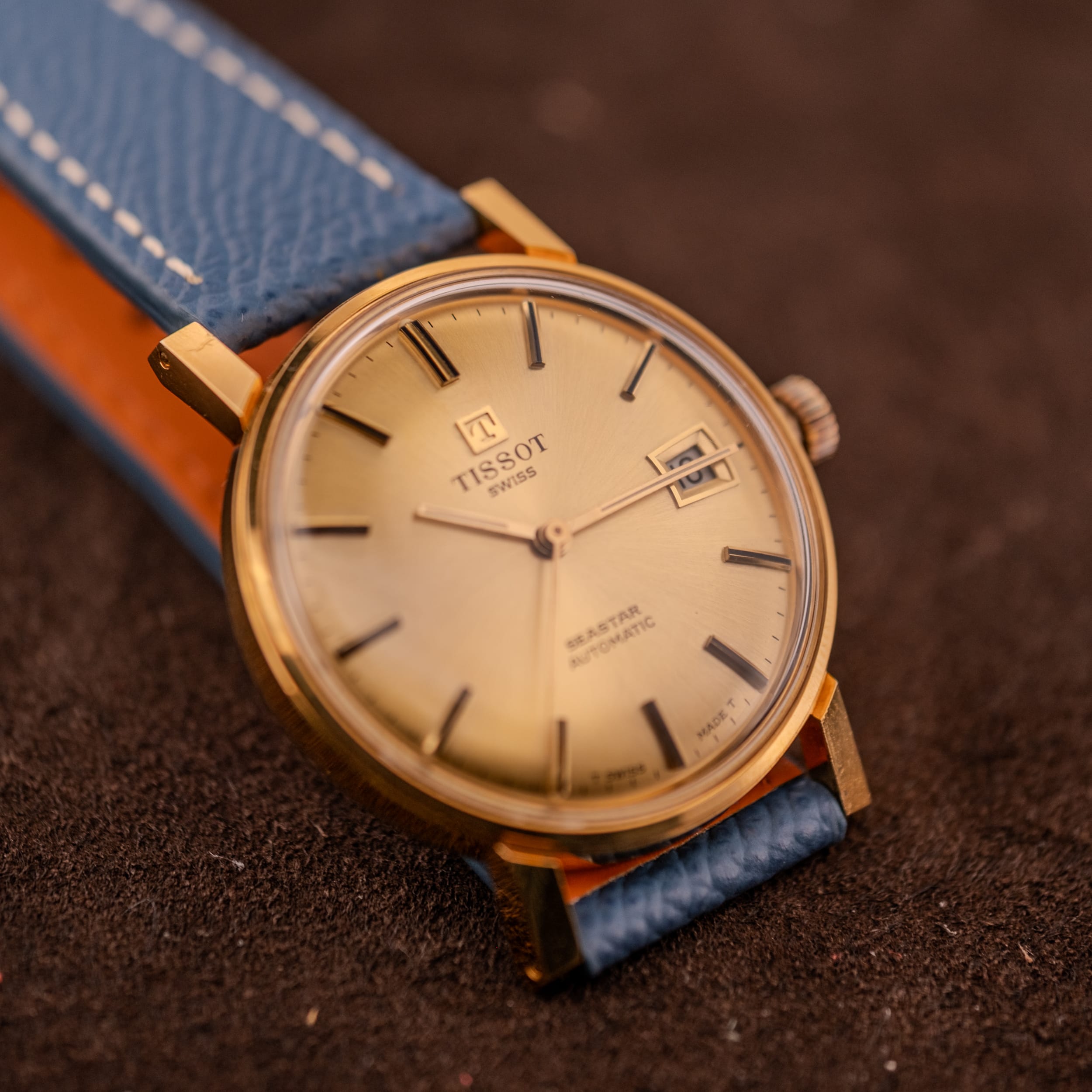 For collectors and enthusiasts who appreciate the Tissot-Omega connection, this Seastar represents a wonderful opportunity to own a piece of SSIH history with genuine provenance and outstanding preservation. The 25-year service award engraving is not a detraction; it is a story, a marker of a life’s work, and the likely reason this watch survived in such lovely condition. Paired here on an OTTUHR ostrich leather strap in blue, this golden Seastar feels equal parts refined and playful, a vintage dress watch with just enough personality to stand out from the crowd.