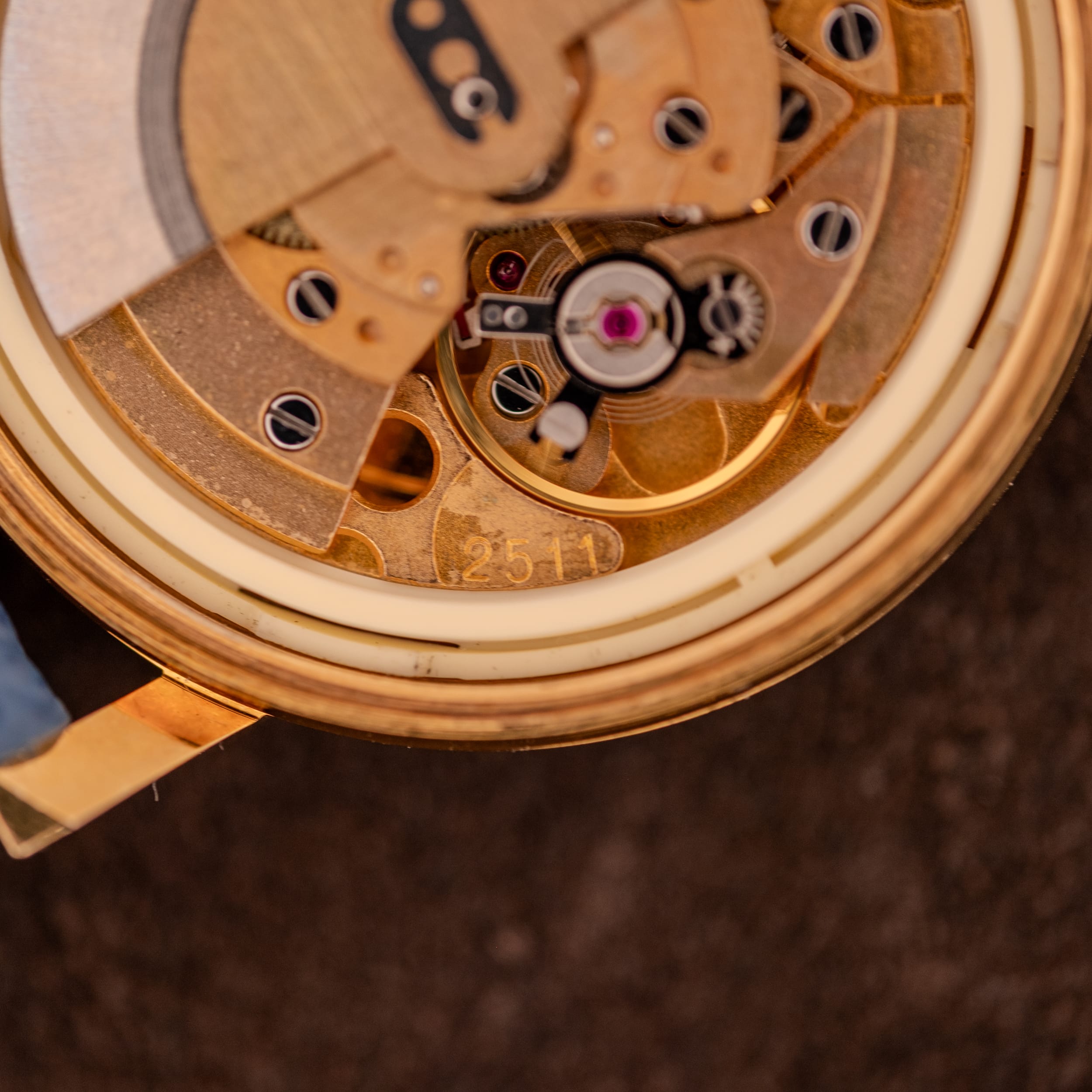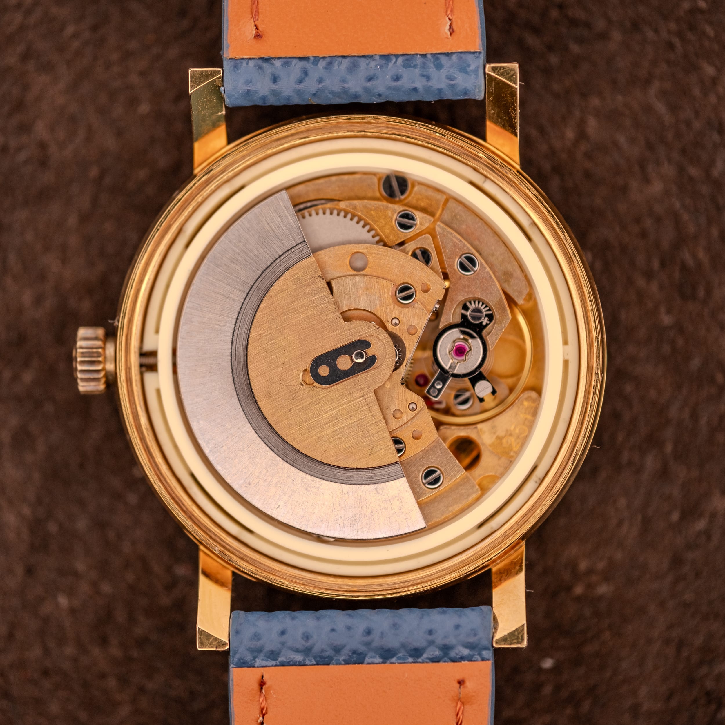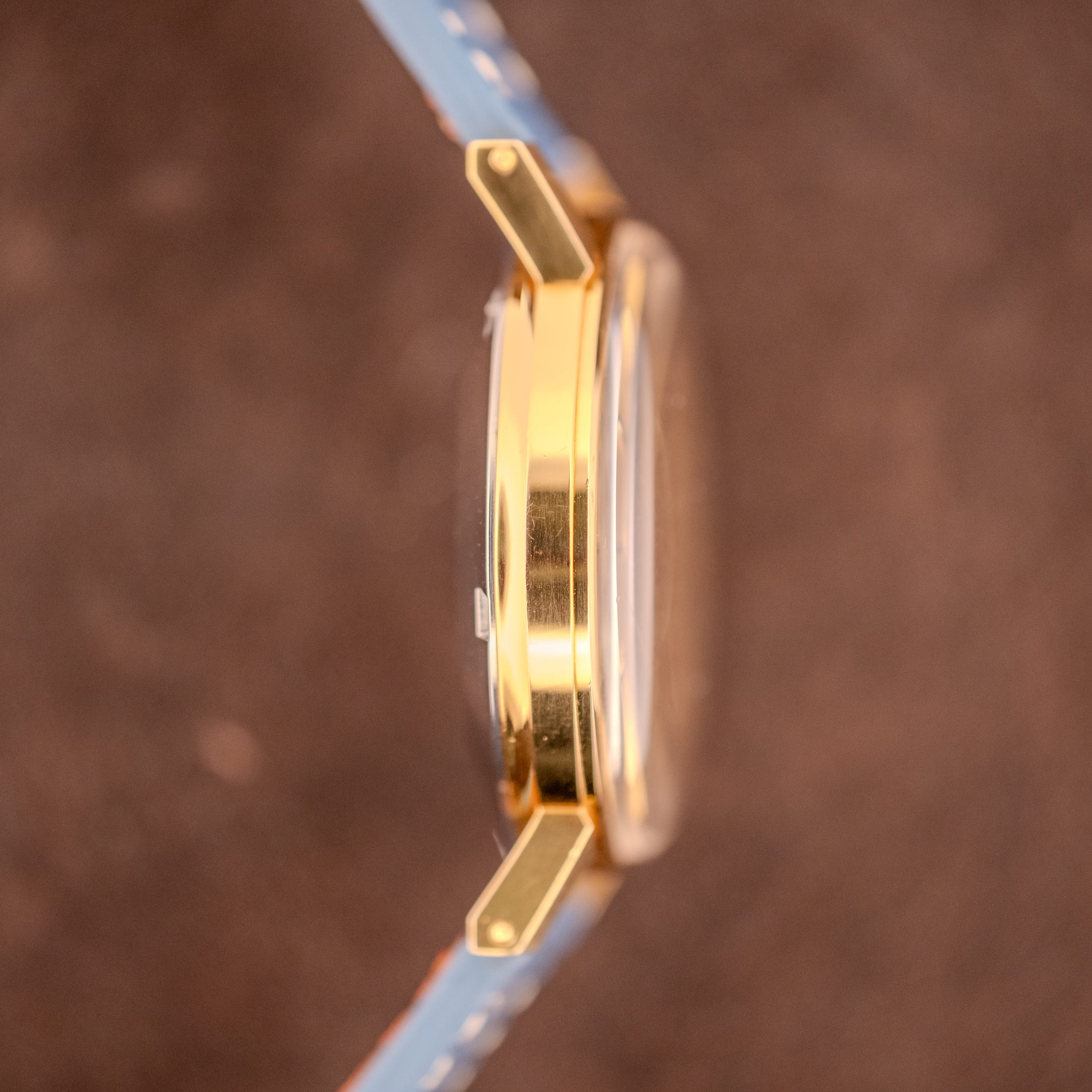For collectors and enthusiasts who appreciate the Tissot-Omega connection, this Seastar represents a wonderful opportunity to own a piece of SSIH history with genuine provenance and outstanding preservation. The 25-year service award engraving is not a detraction; it is a story, a marker of a life’s work, and the likely reason this watch survived in such lovely condition. Paired here on an OTTUHR ostrich leather strap in blue, this golden Seastar feels equal parts refined and playful, a vintage dress watch with just enough personality to stand out from the crowd.
