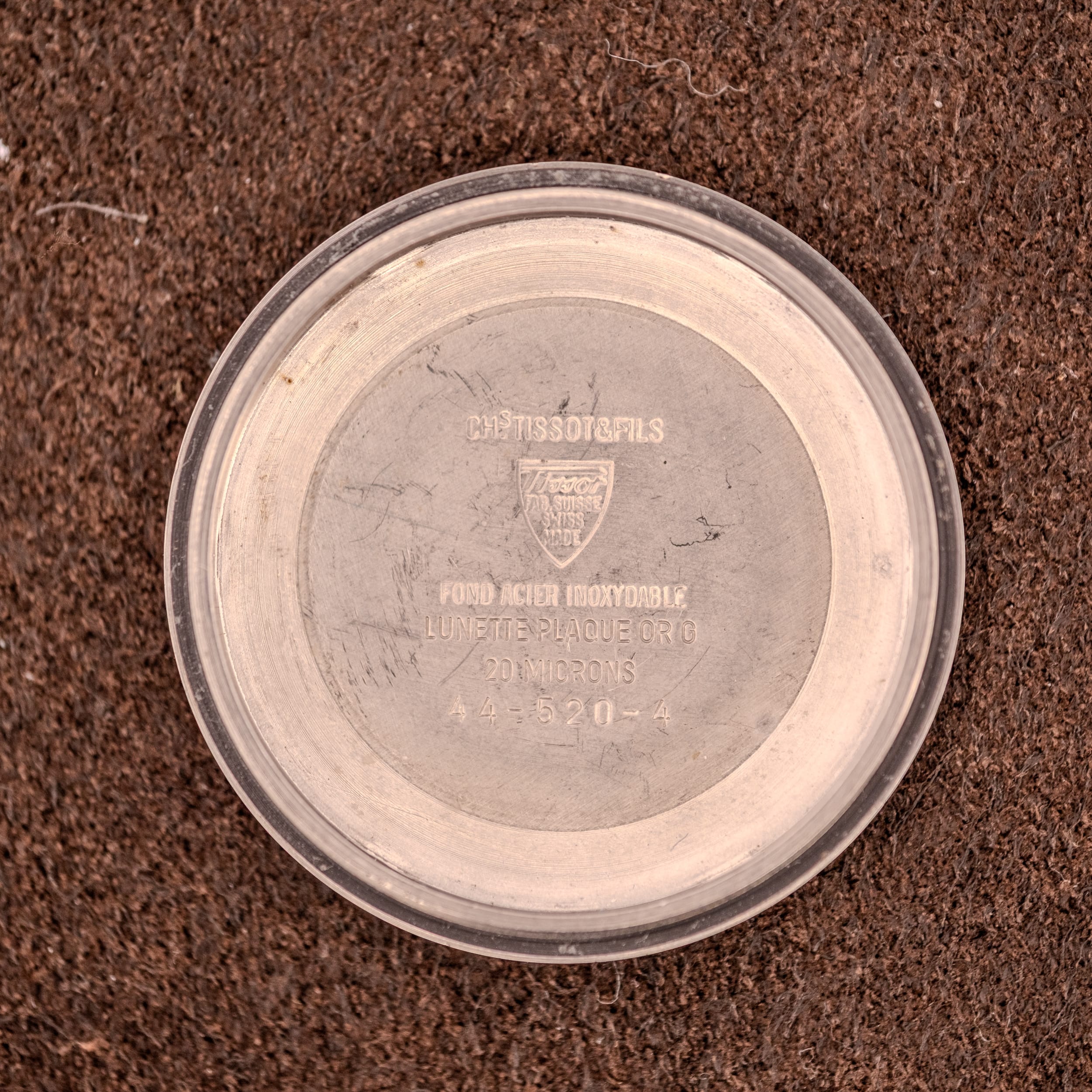 The case is a round, classically proportioned dress watch housing with a stainless steel caseback and a 20-micron gold-plated bezel and body, as confirmed by the interior caseback markings: “CHS TISSOT & FILS,” the Tissot shield logo, “FAB SUISSE SWISS MADE,” “FOND ACIER INOXYDABLE,” “LUNETTE PLAQUE OR G,” “20 MICRONS,” and the reference number 44-520-4. What is immediately striking about this case is just how well preserved the gold plating is. The side profile reveals sharp, clean edges and a beautifully polished surface with minimal signs of age, suggesting a watch that saw limited wrist time over its life. The Tissot-signed crown, bearing the iconic “T” logo, is also in excellent condition. The outer caseback carries a presentation engraving: “NSP / WM. E. HAAS / 25 YEARS,” identifying this as a 25-year service award given to one William E. Haas. In our experience, service award watches are among the most compelling provenance stories you can find on a vintage piece. They were typically purchased new, presented with ceremony, and then, more often than not, tucked into a drawer or a safe, worn sparingly if at all. The result is often a watch that has survived decades in near-original condition, and that is exactly what we see here.