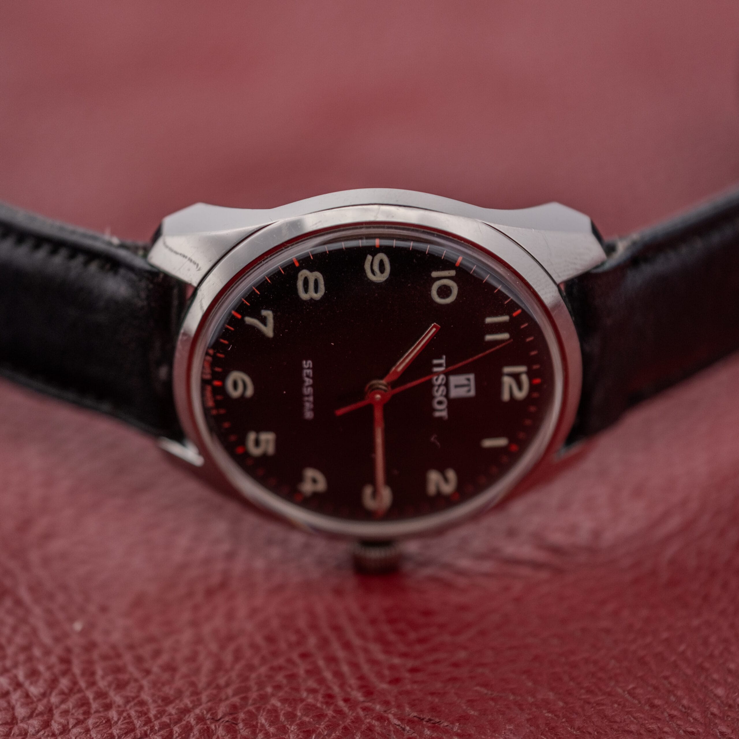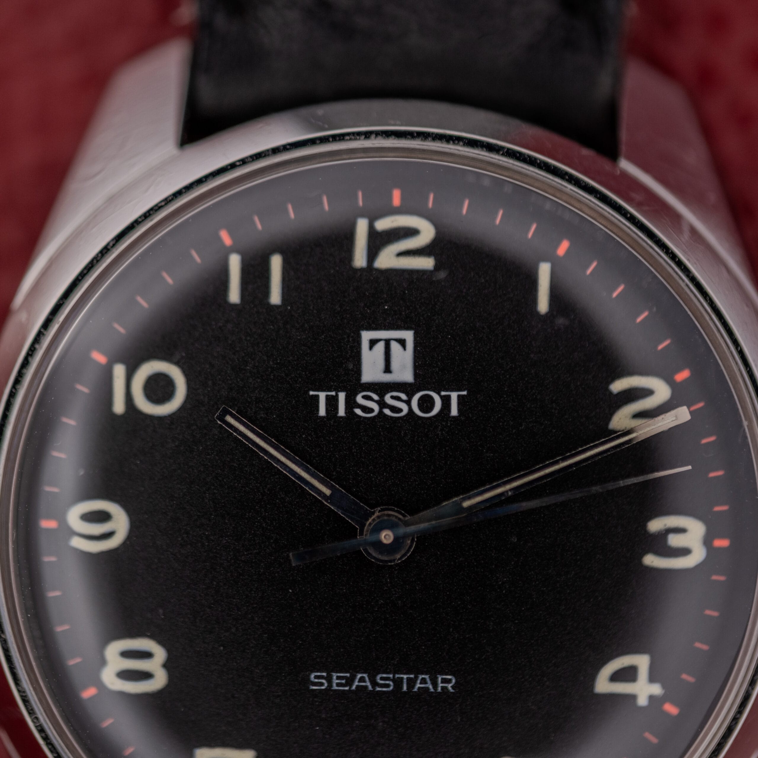 This particular example is, in our opinion, one of the most visually striking Seastar configurations we’ve come across. The matte black dial is absolutely gorgeous, deep and velvety with a fine grain texture that absorbs light beautifully. Against that dark canvas, the full set of white Arabic numerals pops with fantastic legibility, rendered in Tissot’s characteristically rounded, friendly typeface. But the real design flourish here is the red minute track, a series of vivid red hash marks around the outer dial edge that gives the whole watch a subtle but unmistakable sporting energy. It’s a detail that transforms what could be a straightforward dress watch into something with genuine personality and visual punch. The blued steel handset is original and in excellent shape, and the tritium markers flanking the “T Swiss Made T” designation at 6 o’clock confirm the watch’s period authenticity.