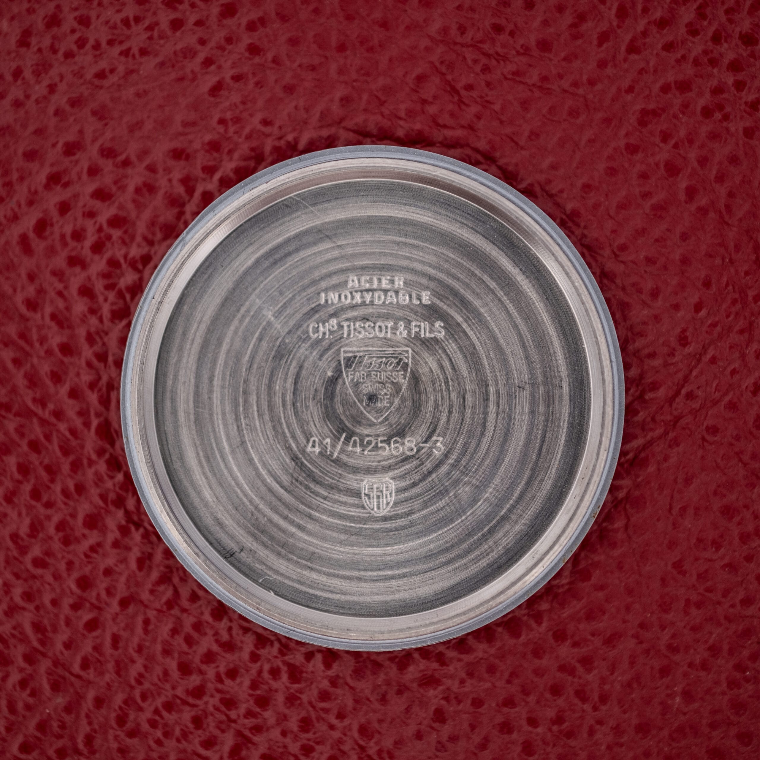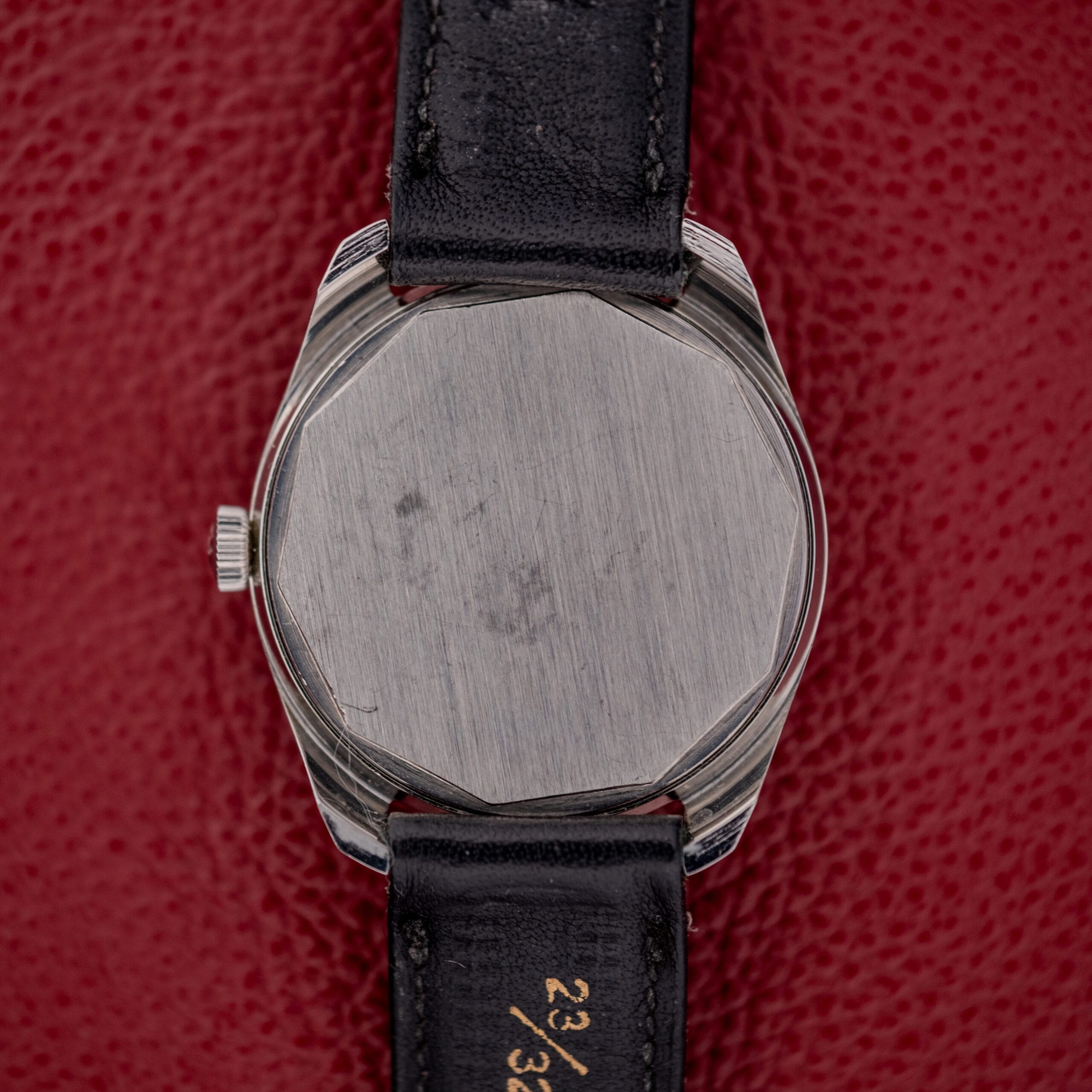 The stainless steel case is in fantastic condition, and the design is worth pausing on. The lugs are sharply faceted with clean, angular chamfers that catch light in a way that feels almost architectural. In profile, the case is slim and purposeful, and the polished and brushed surfaces remain well-defined with only minor surface wear. The caseback features a distinctive faceted octagonal shape with a fine brushed finish, stamped “Acier Inoxydable” (stainless steel), “Chs Tissot & Fils,” and the reference number 41/42568-3. The signed Tissot crown is original. And here’s a lovely bonus: this watch comes on its original Tissot-signed black leather strap, still marked “23/32 Tissot” on the underside, paired with an original signed Tissot buckle. Finding a watch from this era with its complete, original strap and buckle set is increasingly uncommon and adds a wonderful sense of completeness.