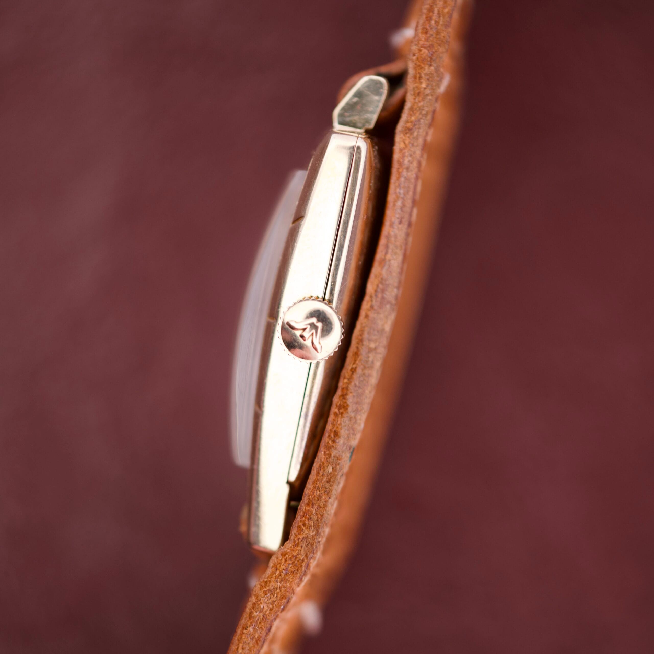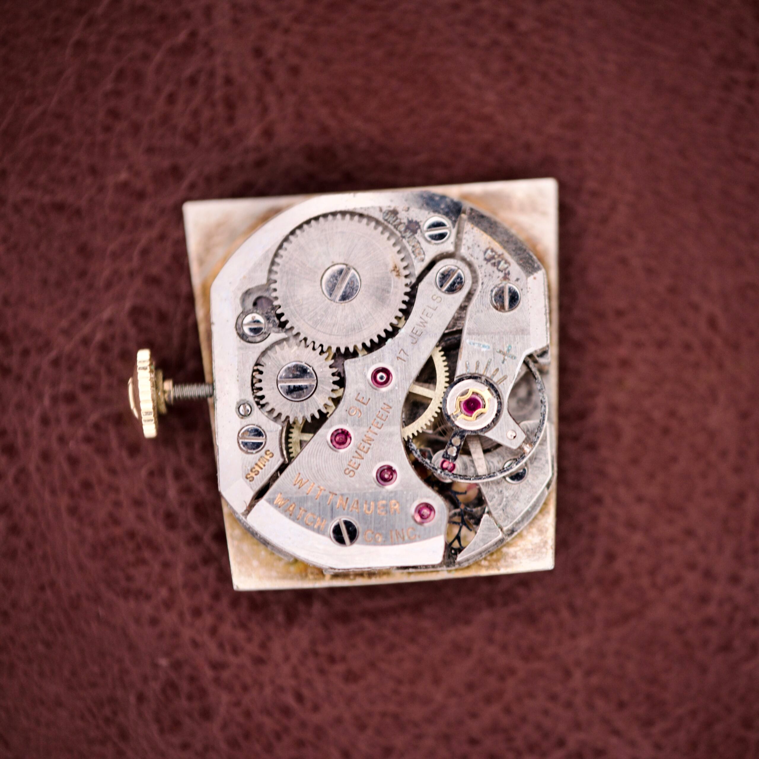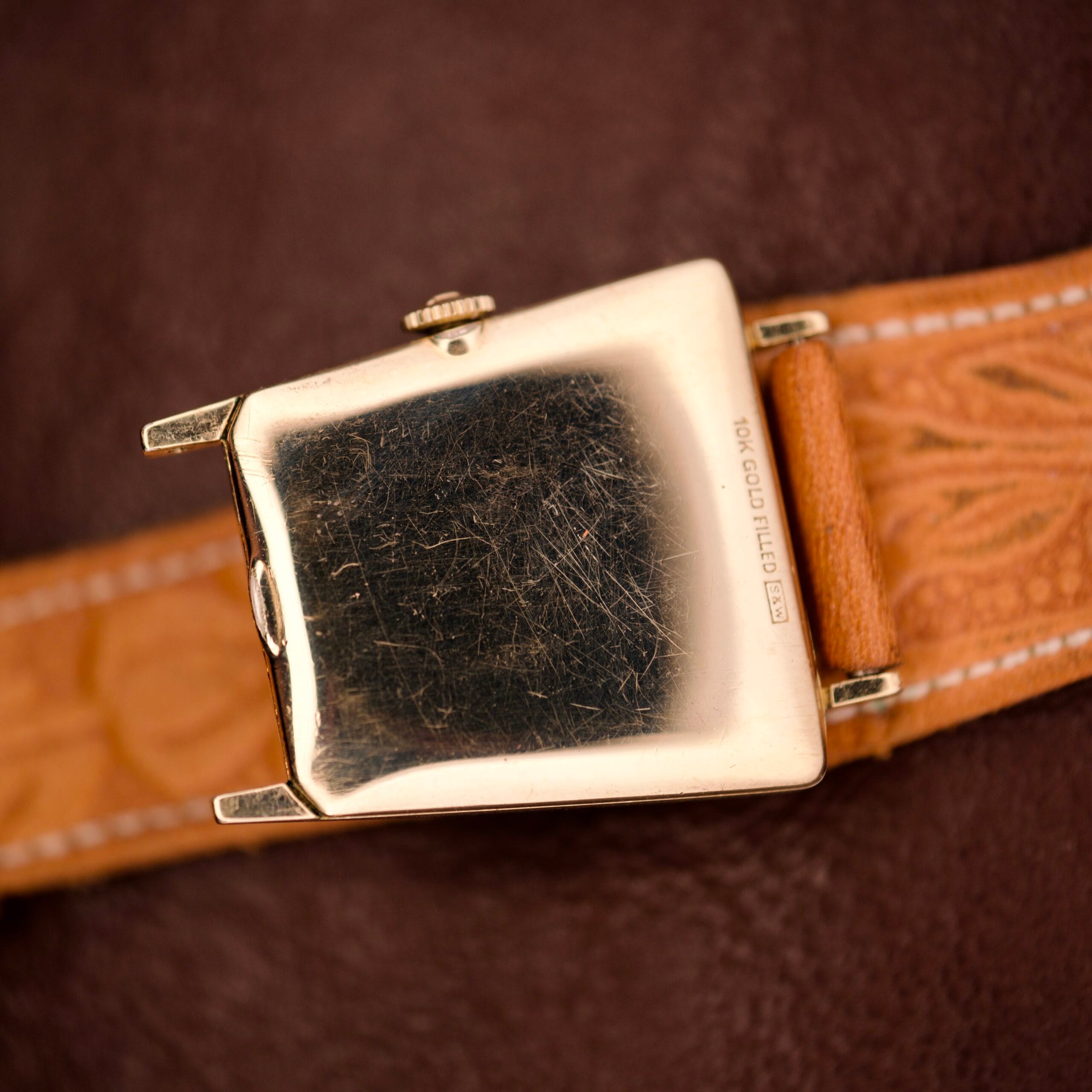 This particular example, the Reference 2025, is pure, unadulterated Art Deco revival. The 10k gold-filled case isn’t just a simple rectangle; it’s a flared, asymmetrical, sculptural piece of architecture. The faceted lugs are sharp and bold, creating a presence on the wrist that is just fantastic. The engine inside is the Wittnauer Caliber 9E, a high-quality, 17-jewel manual-wind form movement, specifically shaped to fit this rectangular case.