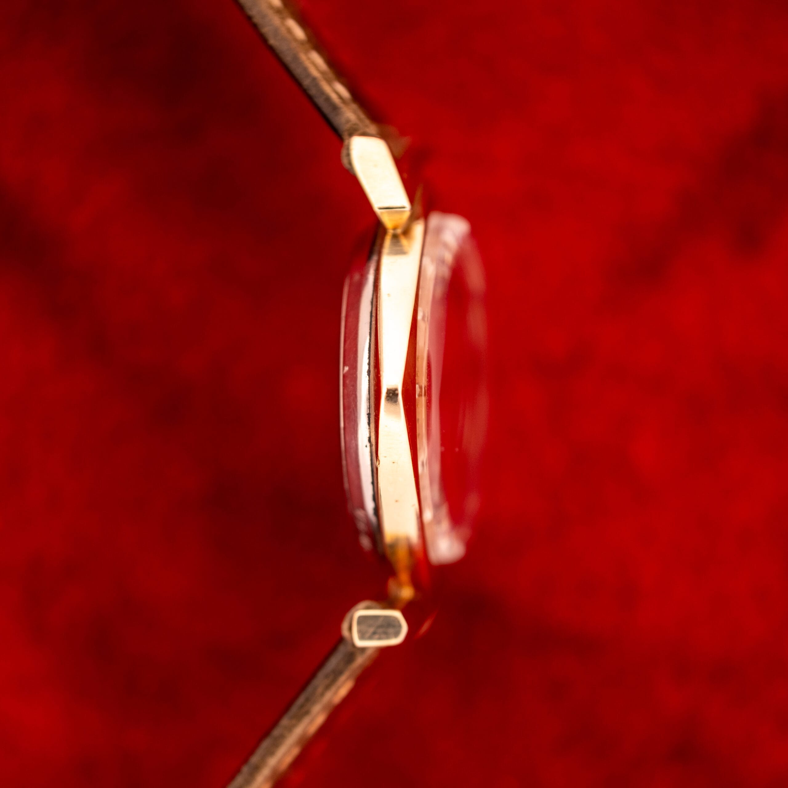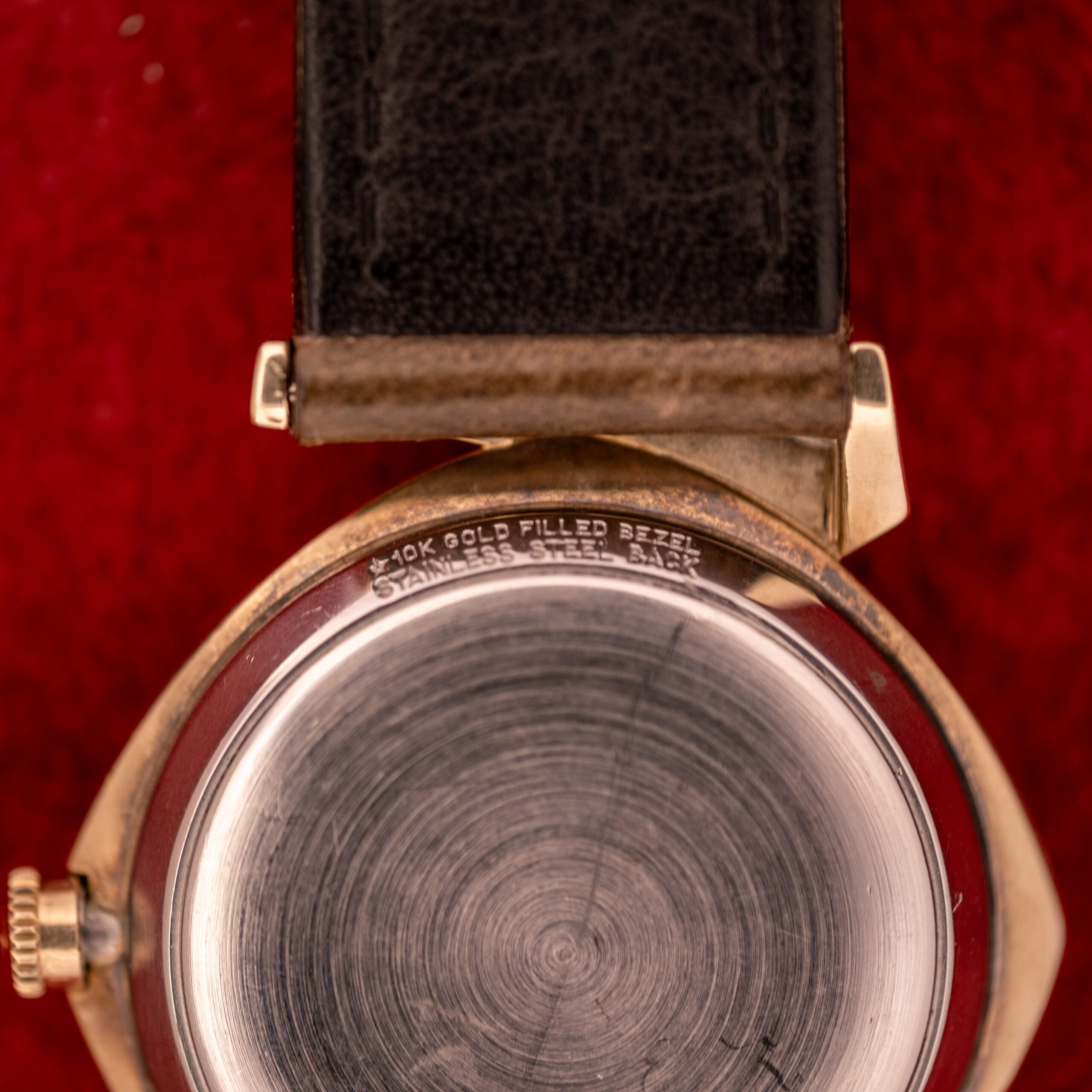 The 10K gold-filled case retains its warm luster beautifully. The bezel and lugs show only the lightest of surface wear consistent with occasional use, and the sharp faceted edges of the lugs remain well-defined. The stainless steel caseback is clean with only minor marks, stamped “10K Gold Filled Bezel, Stainless Steel Back” along with “All Proof” and wrench specifications. The overall condition suggests this watch spent much of its life carefully stored, emerging only for special occasions.
