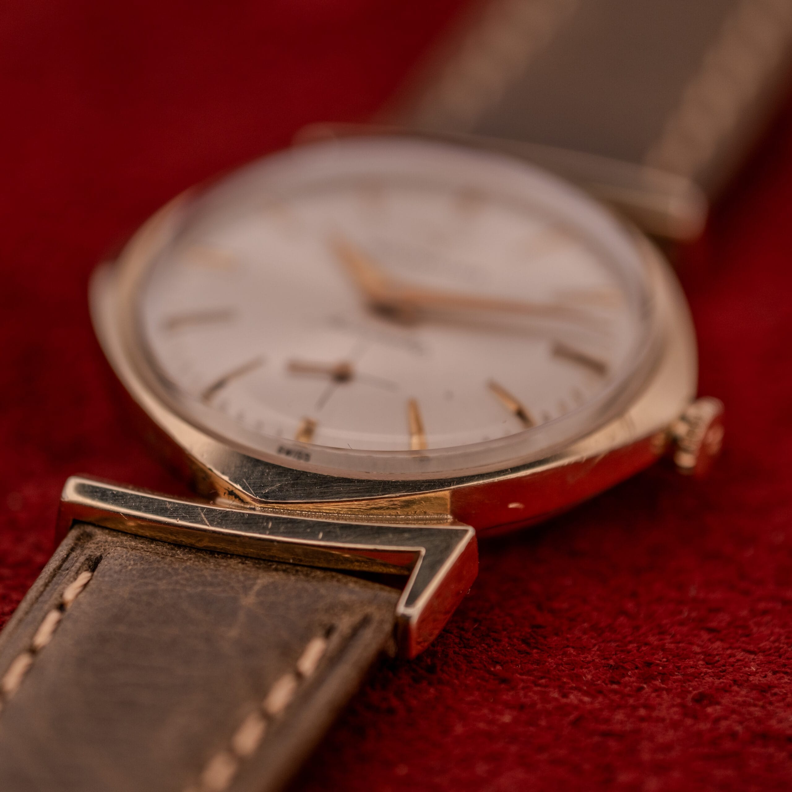The dial on this particular example is in stunning condition. The silvered sunburst finish radiates cleanly from the center, and the applied gold stick indices, with double bars marking the cardinal hours, remain sharply attached and beautifully polished. The gold dauphine hands are crisp and free of damage, and the small seconds subdial at 6 o’clock, with its delicate crosshair detail, adds a classical finishing touch to an otherwise thoroughly modern design. The “Automatic” script below center has a wonderful period flourish to it, and the fine dot minute track provides just enough functional detail without interrupting the dial’s open, airy feel. It’s a remarkably clean and well-preserved dial for a watch of this era.