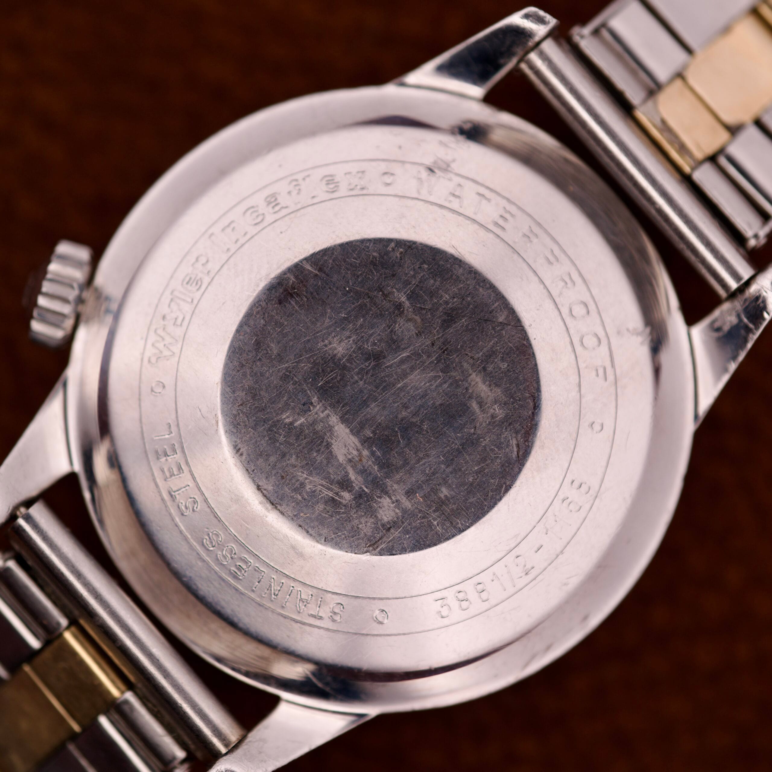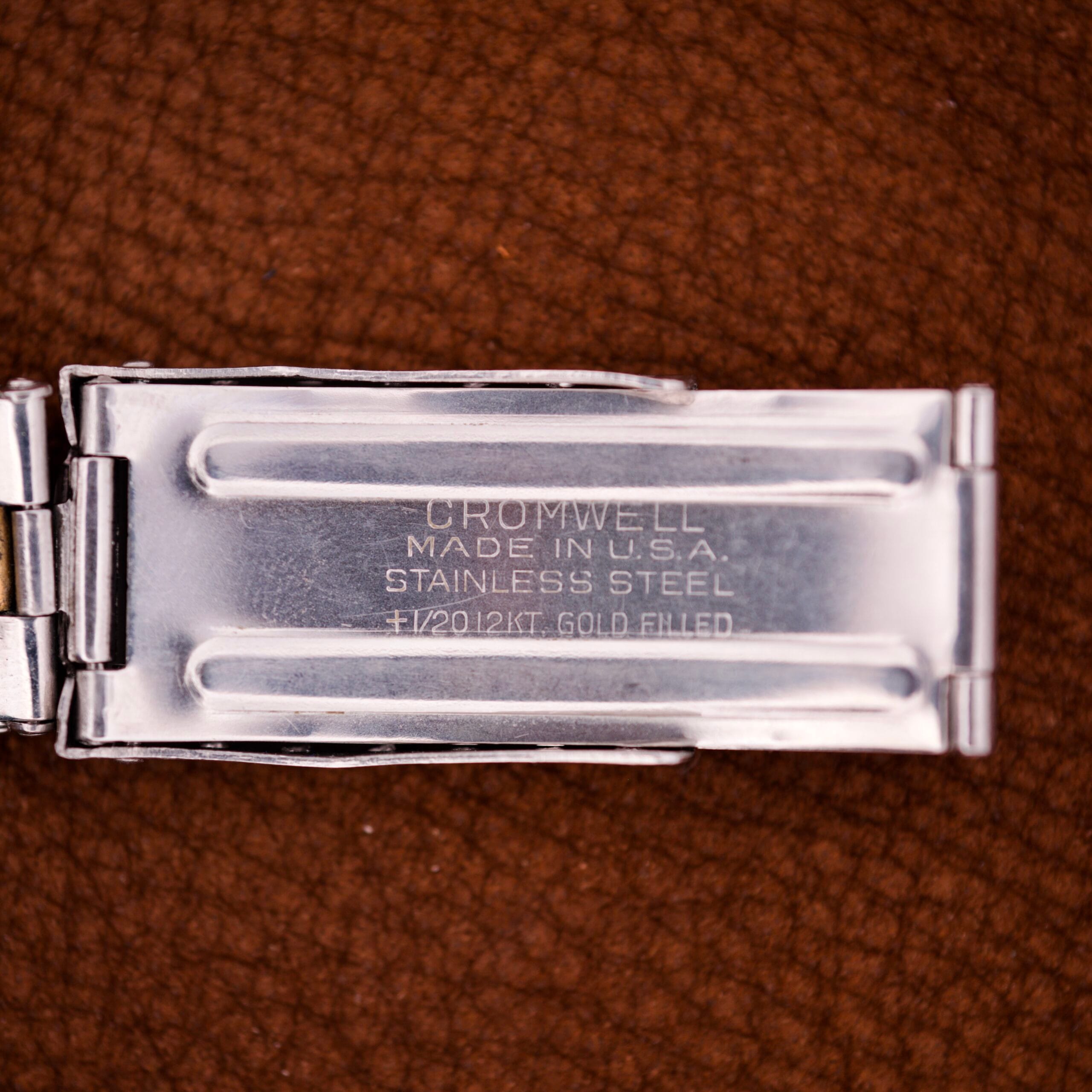 The watch is in beautiful, honest condition. The silver, vertically brushed dial is clean, with sharp, applied gold indices. The original dauphine hands are intact, and their luminous plots have aged to a lovely, pale mint-green. It comes paired on a period-correct, two-tone Cromwell link bracelet that perfectly completes the watch’s confident 1970s look.