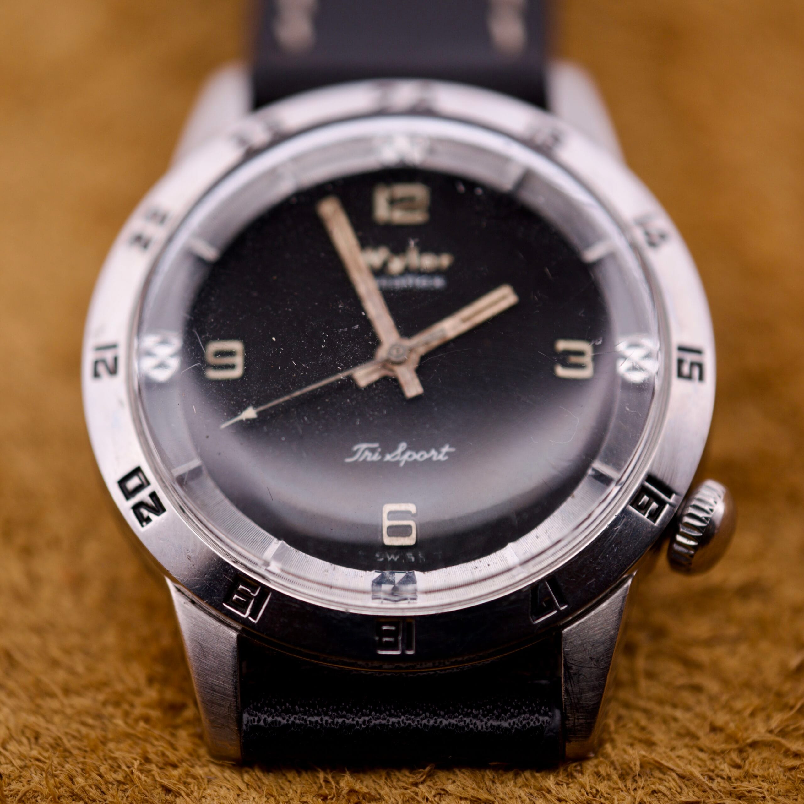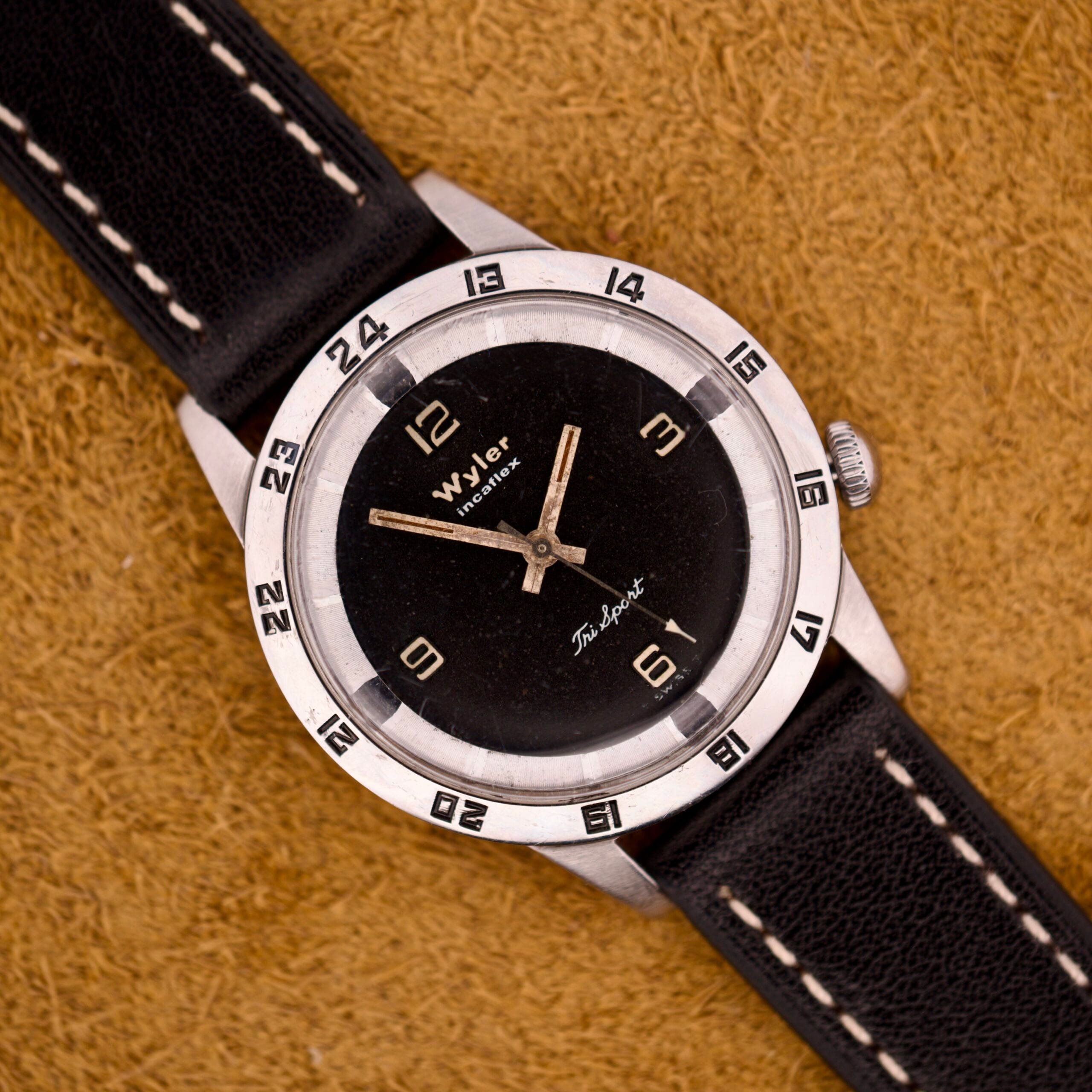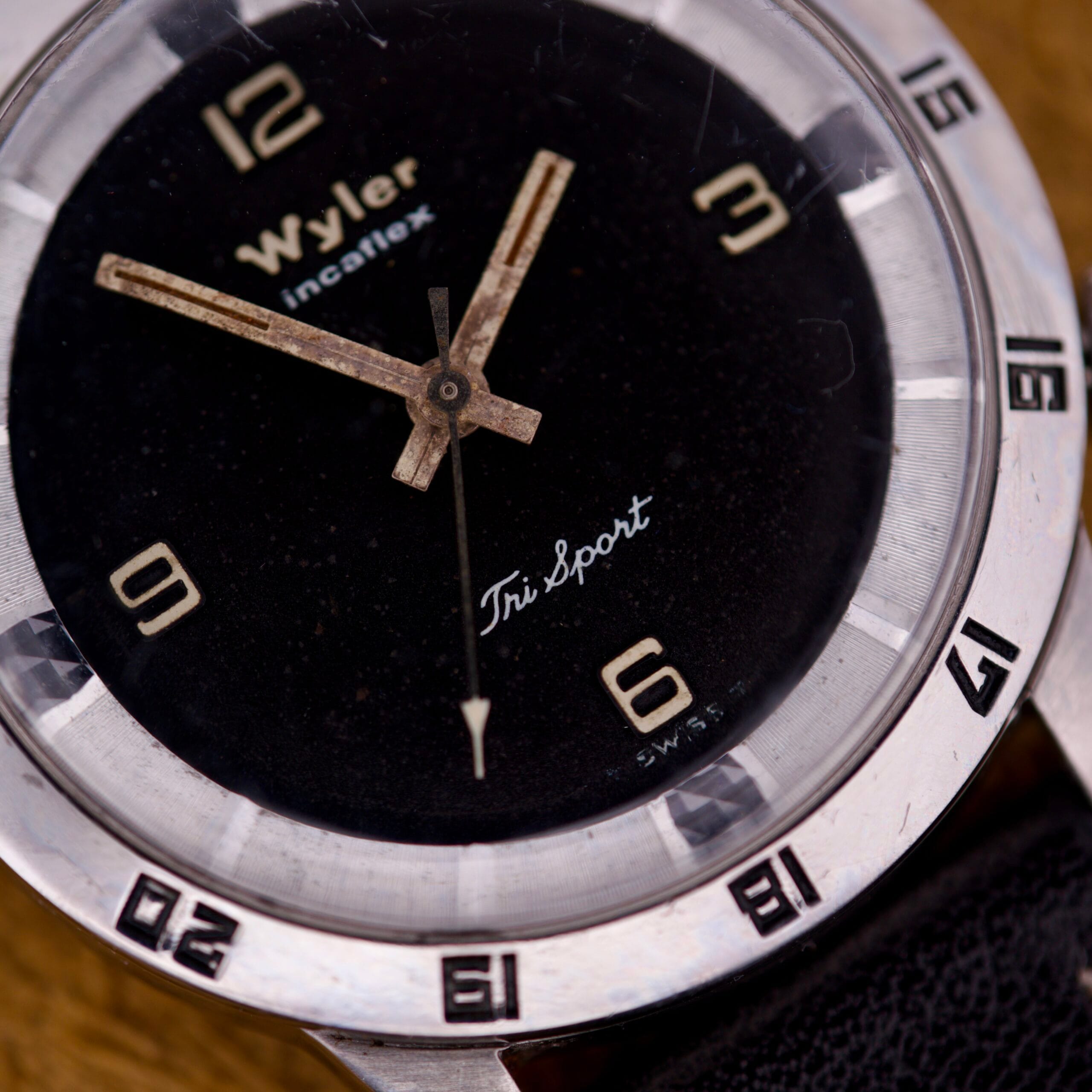 Wyler is one of those brands that, once discovered, becomes an instant favorite for collectors who value genuine innovation over marketing fluff. Founded in 1924, Wyler built its reputation on durability. Their “Incaflex” balance wheel, introduced in 1927, was a revolution: its flexible, spiral arms could absorb shocks that would shatter the balance staff of lesser watches. They famously proved this by dropping their watches off the Eiffel Tower and the Seattle Space Needle, stunts that cemented their status as the ultimate “tough guy” watch of the mid-century. The Tri-Sport line was their answer to the growing demand for versatile tool watches, designed for the active man who might go from the office to the field to the mountains.