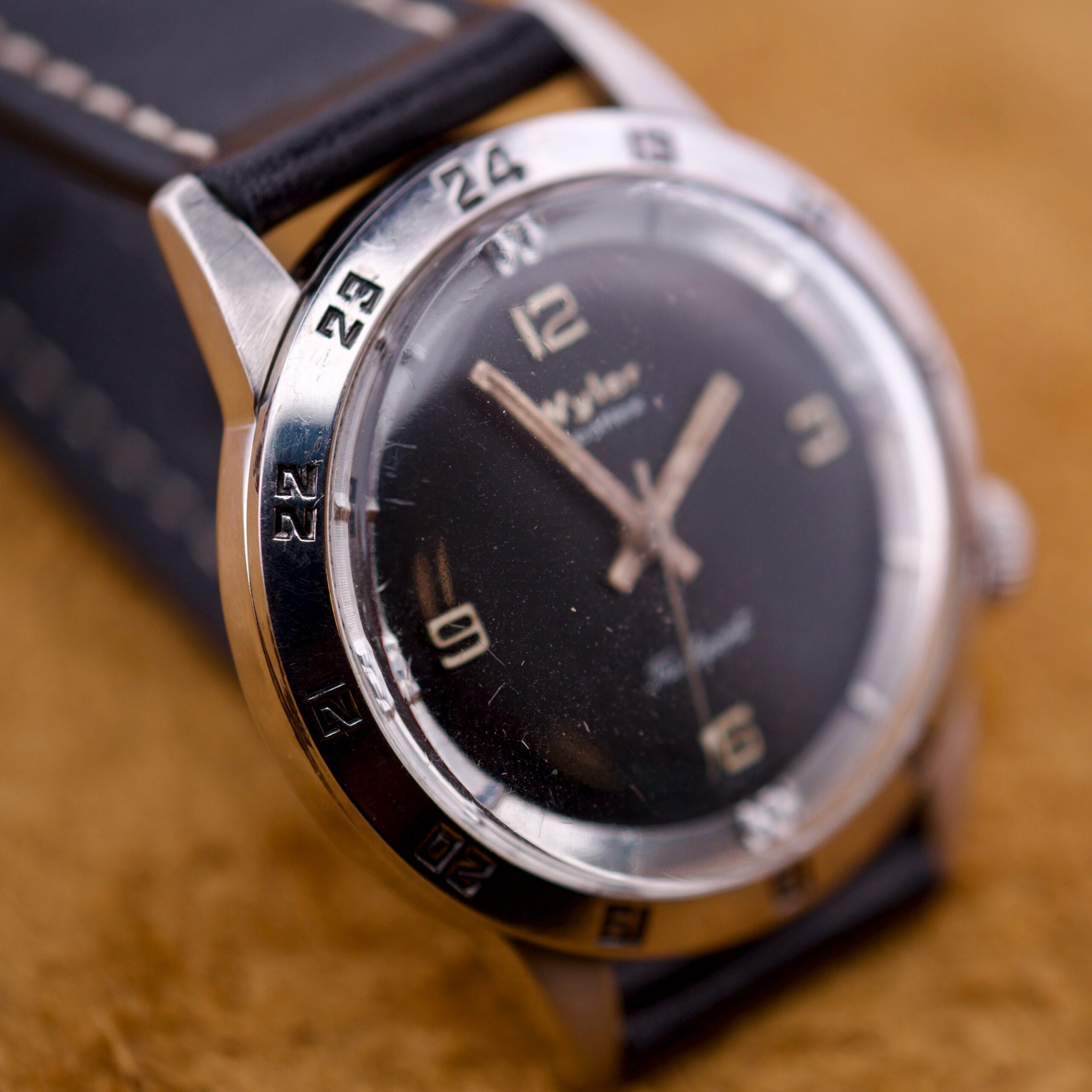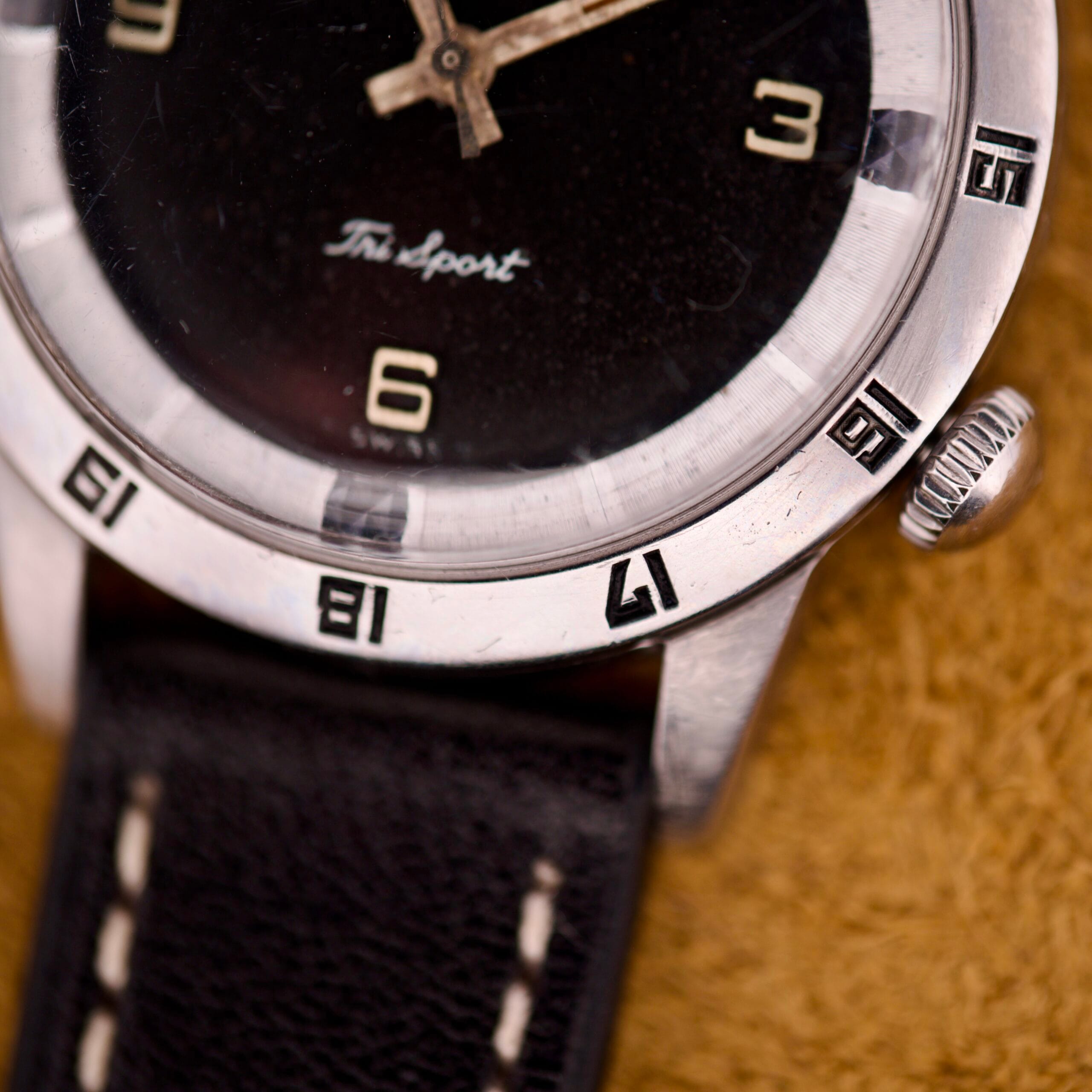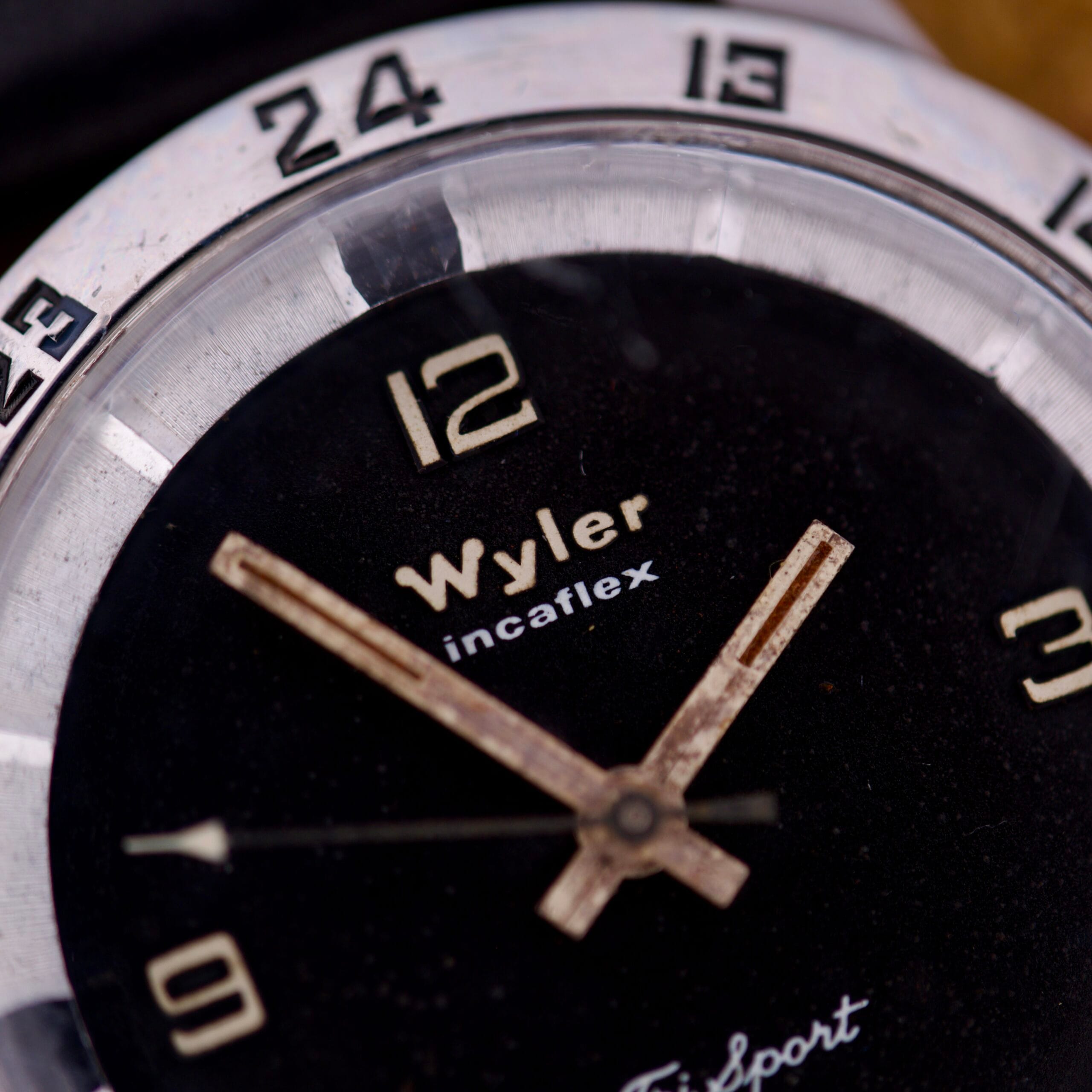 Wyler is one of those brands that, once discovered, becomes an instant favorite for collectors who value genuine innovation over marketing fluff. Founded in 1924, Wyler built its reputation on durability. Their “Incaflex” balance wheel, introduced in 1927, was a revolution: its flexible, spiral arms could absorb shocks that would shatter the balance staff of lesser watches. They famously proved this by dropping their watches off the Eiffel Tower and the Seattle Space Needle, stunts that cemented their status as the ultimate “tough guy” watch of the mid-century. The Tri-Sport line was their answer to the growing demand for versatile tool watches, designed for the active man who might go from the office to the field to the mountains.