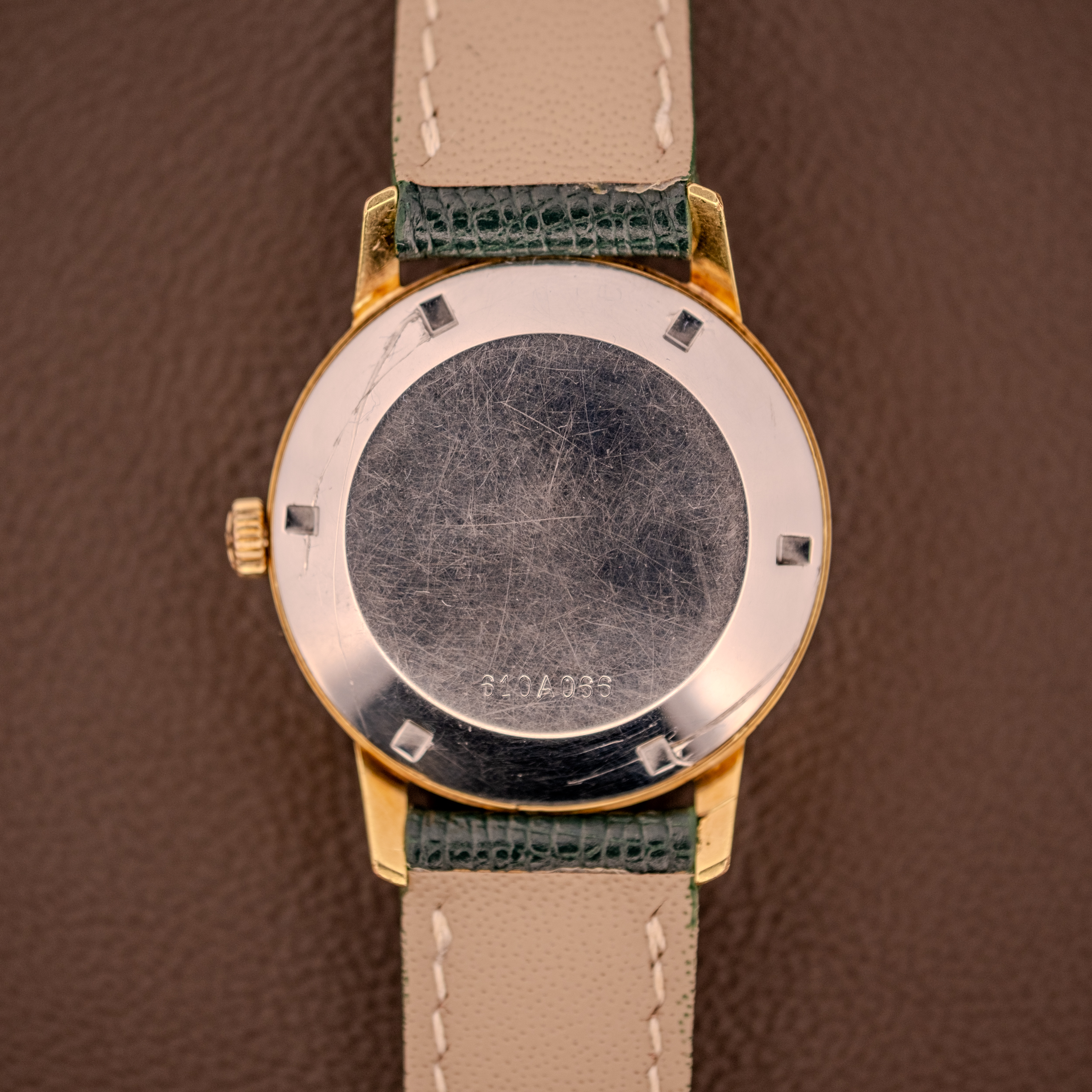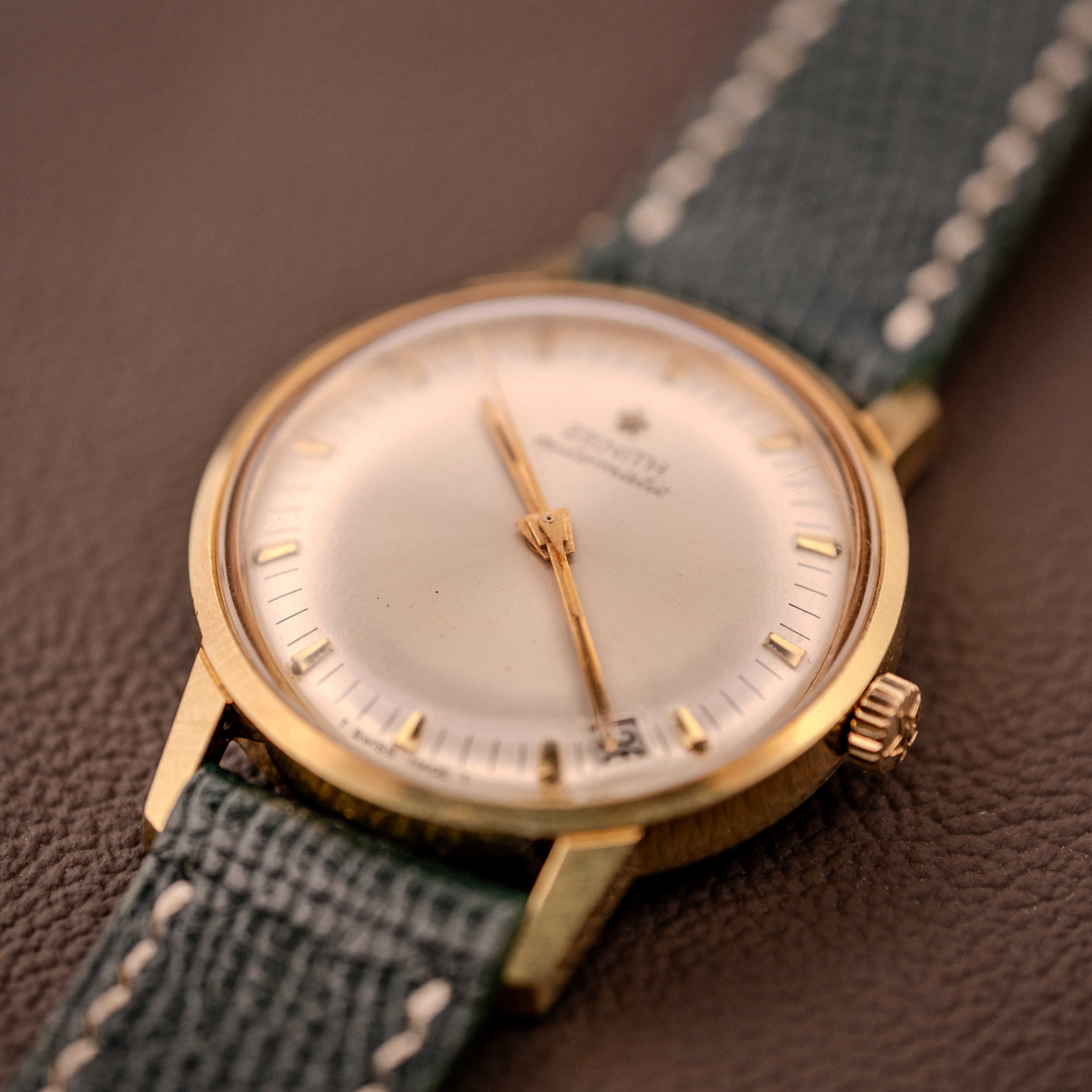 We are presenting this piece on a green leather strap with white contrast stitching, a pairing that plays wonderfully against the gold case. For the collector who values in-house movement quality, brand heritage, and the kind of value proposition that simply does not exist elsewhere in Swiss horology, a 1960s Zenith automatic is one of the smartest buys in the vintage market. This is a watch from a true manufacture, finished to a standard that its current price does not reflect, and it is only a matter of time before the market corrects that.