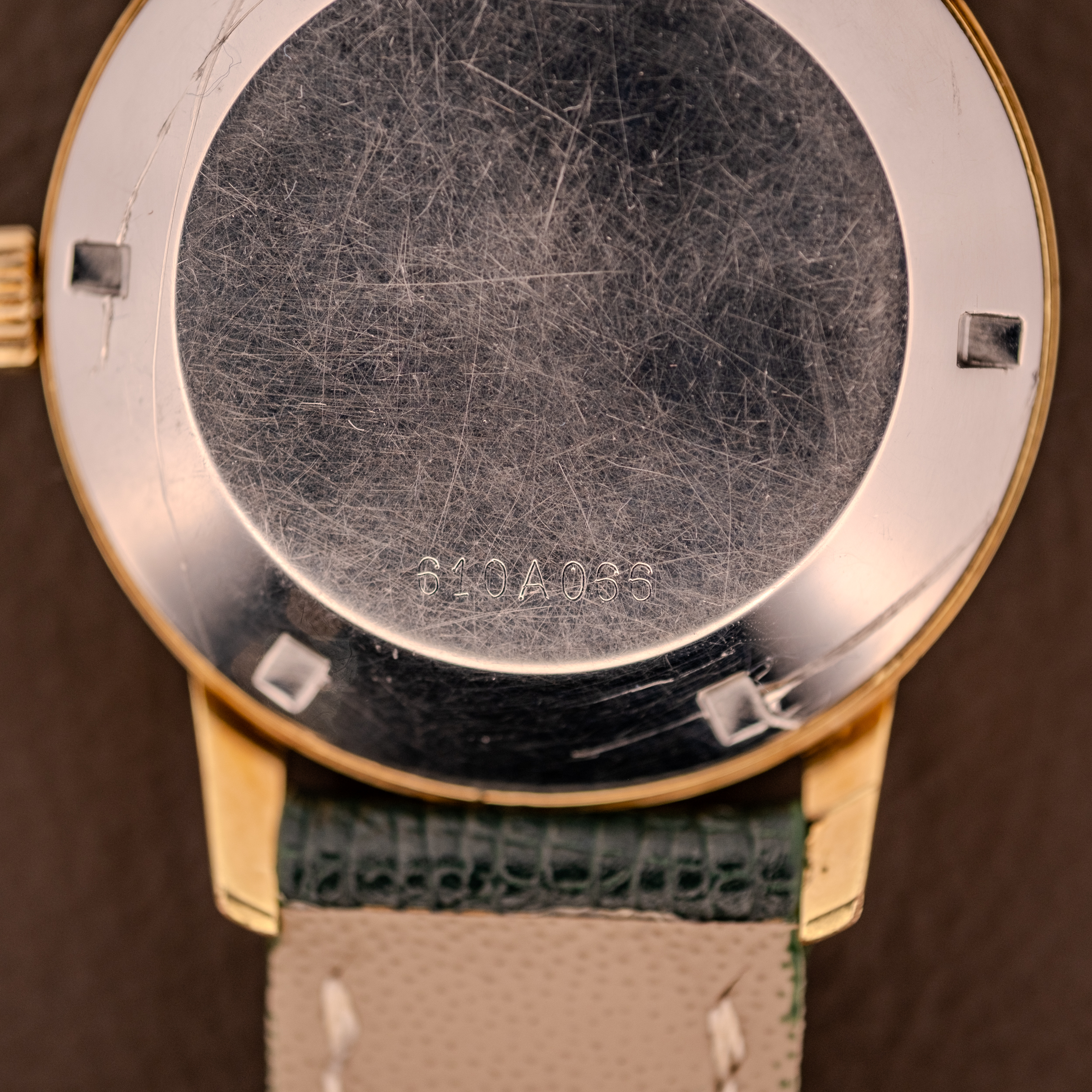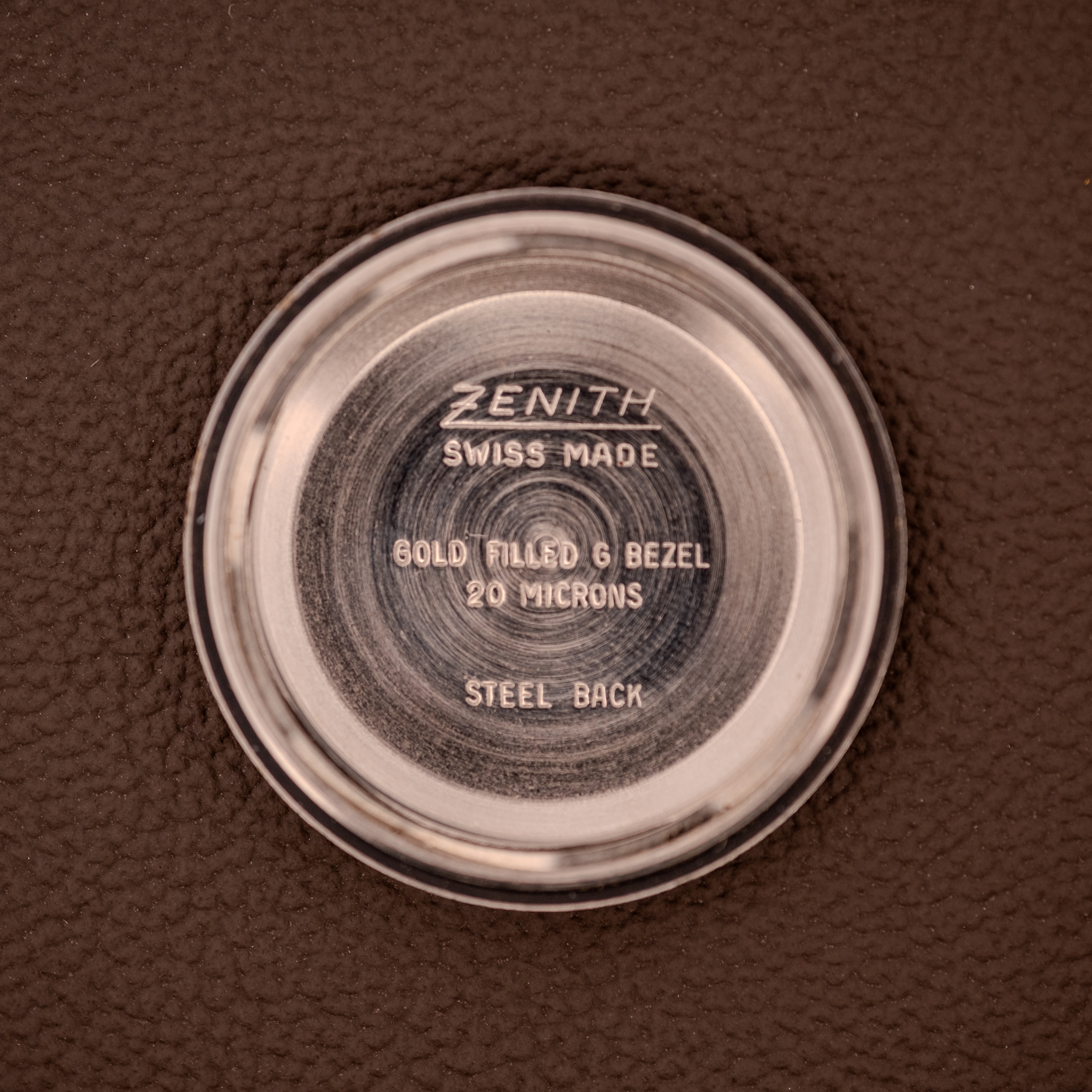 This particular example is housed in a gold filled case with 20 microns of gold on the bezel and a steel caseback, as confirmed by the inner caseback stamping: “Zenith, Swiss Made, Gold Filled 6 Bezel, 20 Microns, Steel Back.” The outer caseback carries the number 610A066, which functions as a case number rather than a confirmed model reference, as vintage Zenith reference numbering is notably inconsistent and this number does not appear in established Zenith reference databases. The signed Zenith star crown is original, and the case profile is slim and elegant with clean, straight lugs.