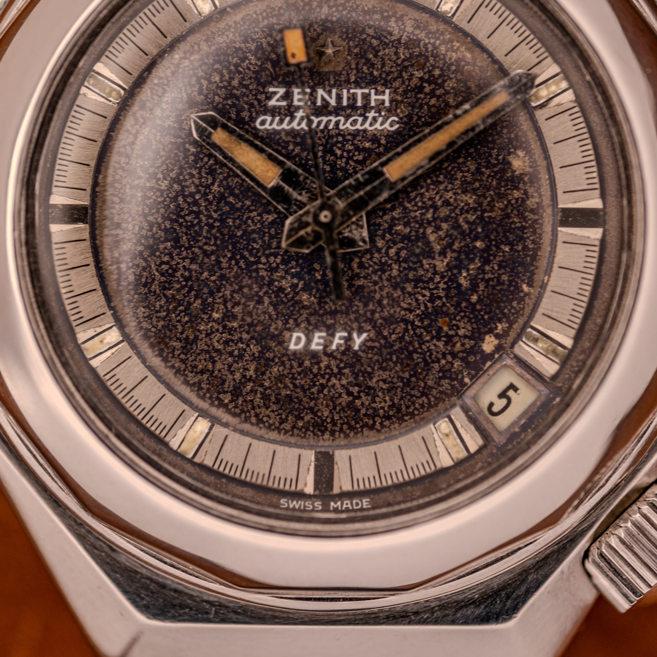 This particular example, reference NA 50.012.2, is an absolute showstopper, and we don’t say that lightly. The dial has undergone a dramatic tropical transformation that elevates this from a cool vintage sport watch into something truly extraordinary. What was once a clean black dial has evolved into a mesmerizing, almost galactic landscape of warm speckled patina, as though someone captured a nebula under crystal. The degradation is remarkably even and consistent across the entire surface, creating a texture that is simultaneously dark and alive with depth. The “Zenith automatic” script and “DEFY” text at six o’clock remain clearly legible in white, floating above this otherworldly backdrop. The brushed silver chapter ring with its applied stick indices and fine minute track remains sharp and well-defined, providing a crisp frame around the chaos of the center dial. The skeleton handset is quintessential Defy, angular and aggressive, and the tritium lume has aged to a gorgeous warm amber that perfectly complements the dial’s transformation. Even the small orange lume pip at six o’clock and the date indicator accent add welcome pops of color.