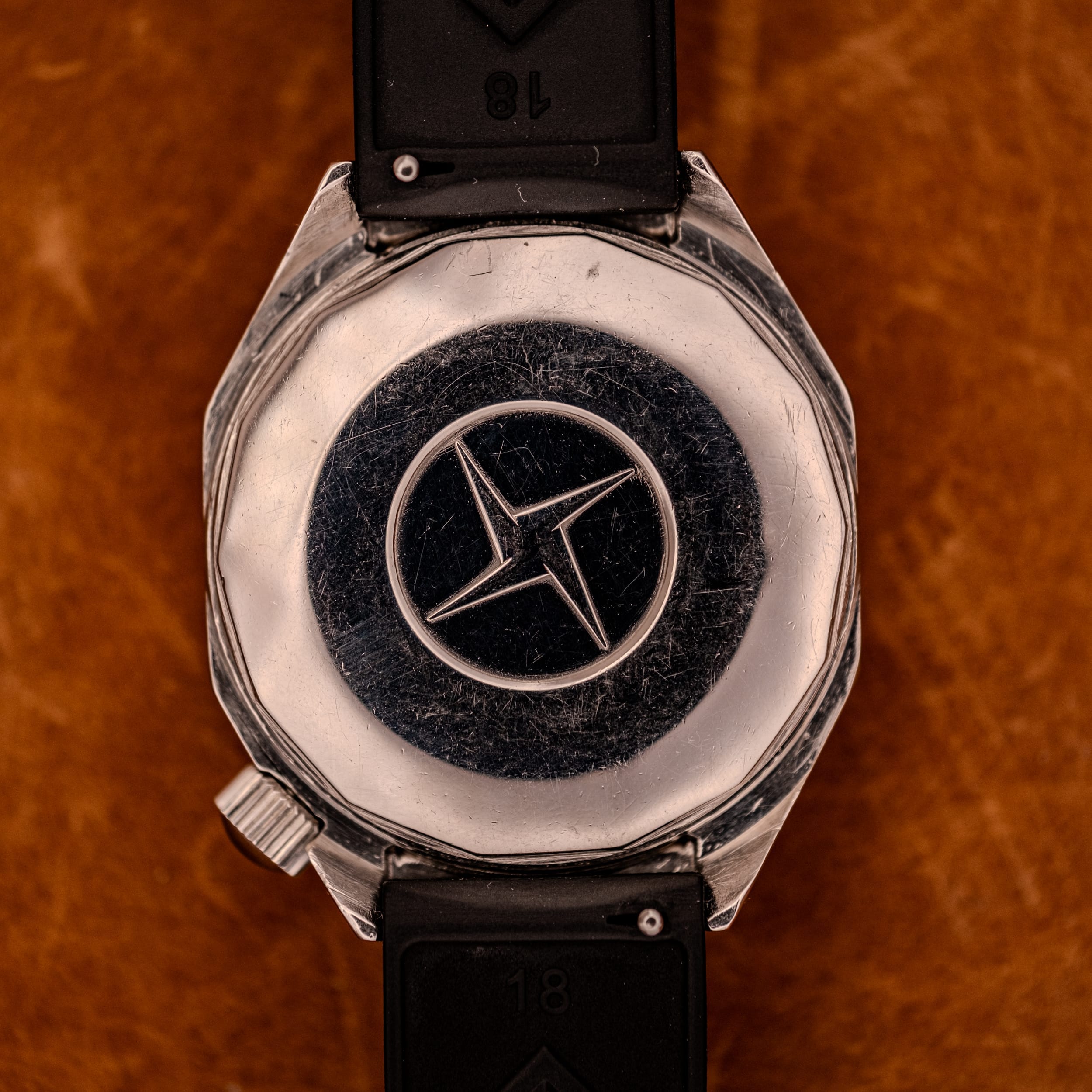 The stainless steel case is in strong condition, retaining its original sharp facets and the interplay between brushed and polished surfaces that make this design so visually dynamic. The case profile reveals substantial, purposeful thickness, and the signed Zenith crown sits at three o’clock, ready for action. The caseback features Zenith’s iconic four-pointed star emblem in relief, while the inner caseback confirms the reference, “ACIER INOXYDABLE” stainless steel construction, and the patented case design with “MODELE DEPOSE.” Pop that caseback off and you’re greeted by the in-house Cal. 2562 PC in all its glory, the Zenith-signed rotor with gold lettering sweeping over a well-finished movement that’s been recently serviced as of February 2026.