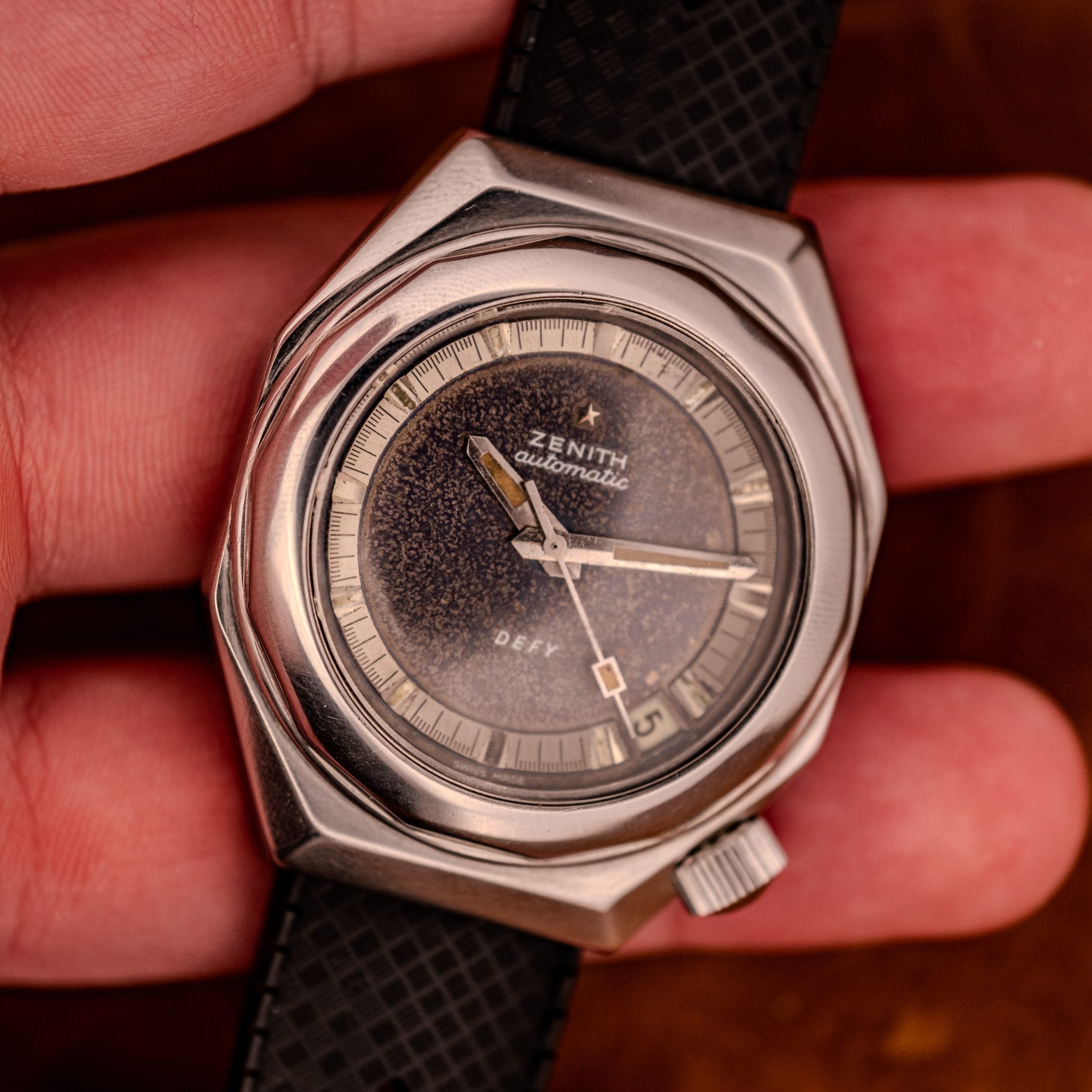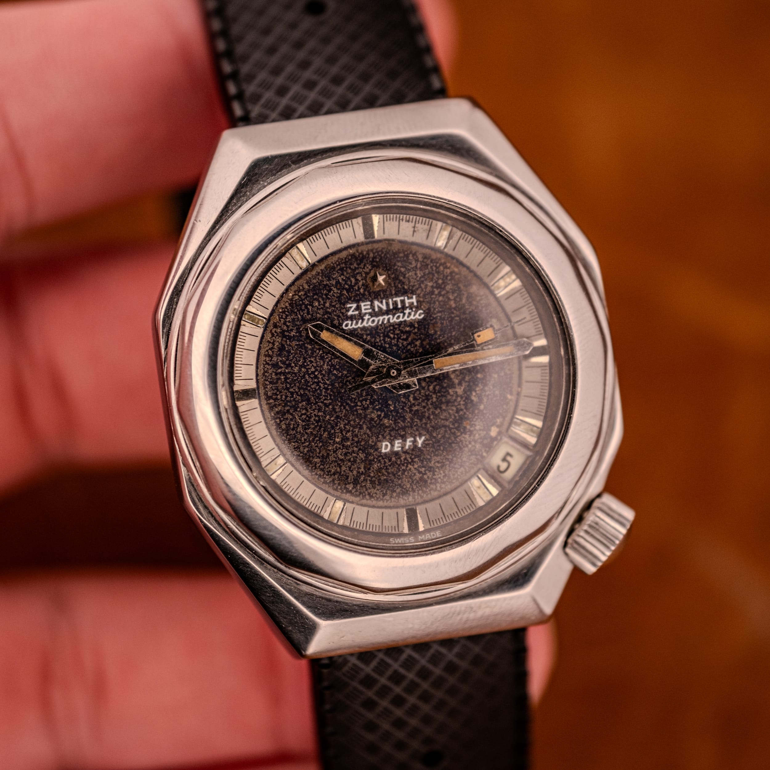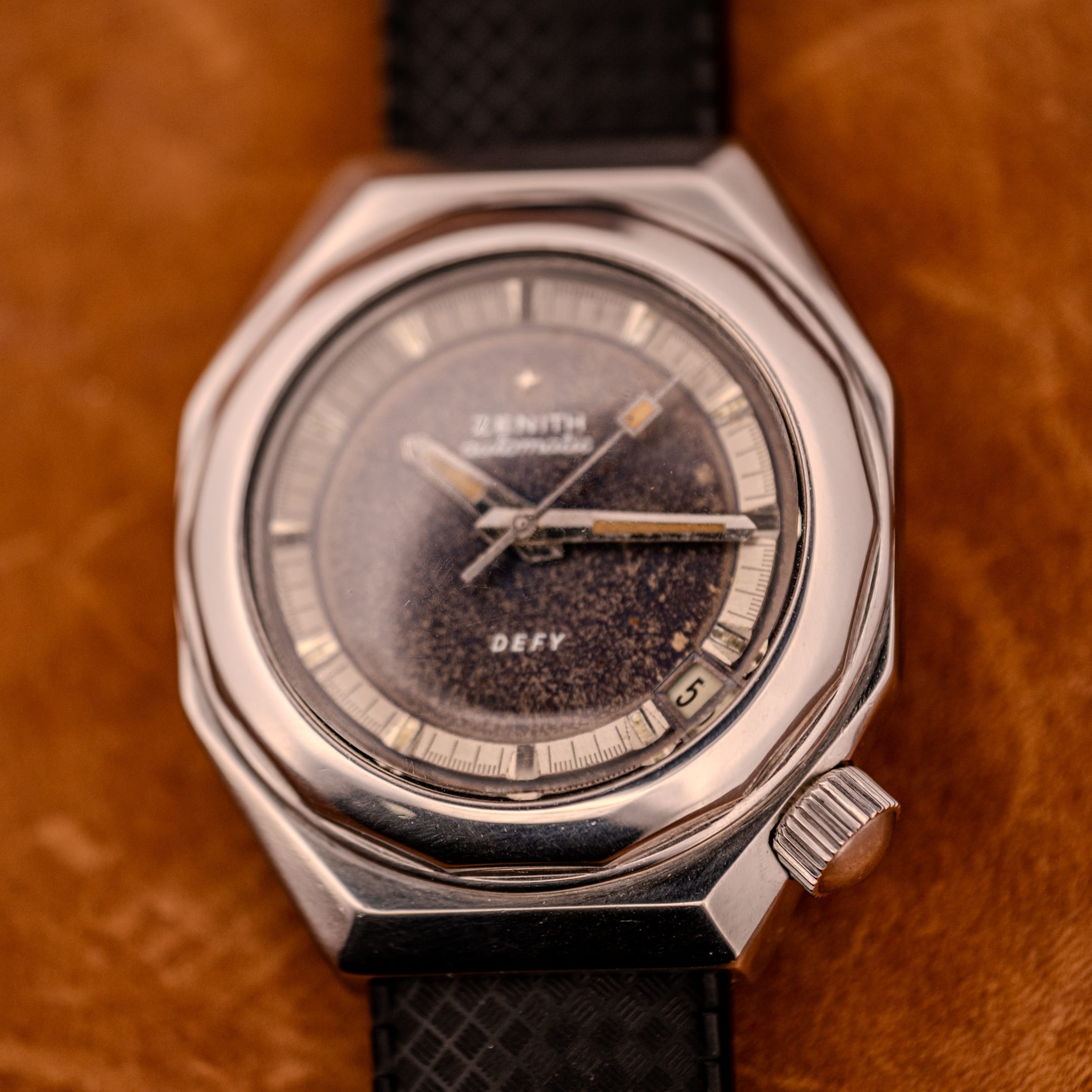A bold octagonal stainless steel case frames a dramatically aged dark dial with stunning galactic tropical patina, warm amber lume on the skeleton handset, and Zenith’s signature brushed silver chapter ring. Pure 1970s sculptural design with serious wrist presence.