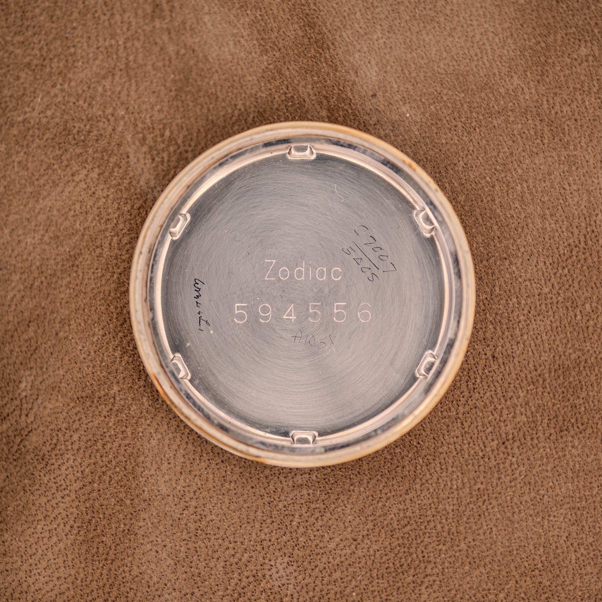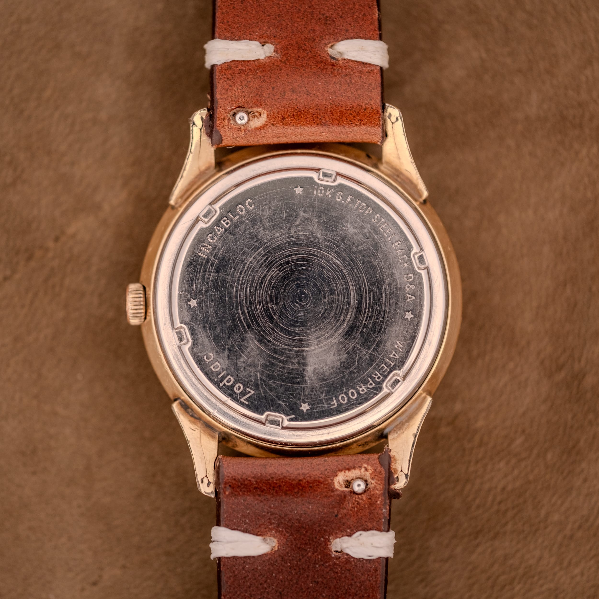 The Caliber 1624 powering this watch is a Zodiac-signed Swiss automatic movement with 17 jewels and Incabloc shock protection. The rotor is engraved “Zodiac Ltd., 1624, Seventeen 17 Jewels, Swiss,” and the movement itself is cleanly finished with visible ruby jewels. The stainless steel caseback is stamped with “Zodiac,” “Incabloc,” “10K G.F. Top, Steel Back,” “D&A,” and “Waterproof,” a comprehensive set of markings that confirms both the gold filled construction and the practical, sealed case design. The inner caseback is signed “Zodiac” with the serial number 594556.