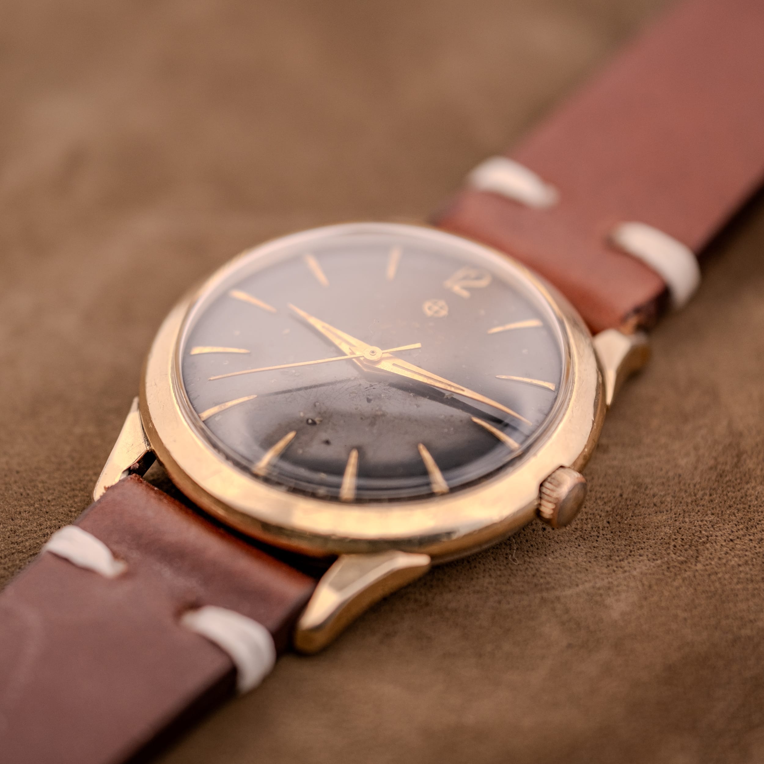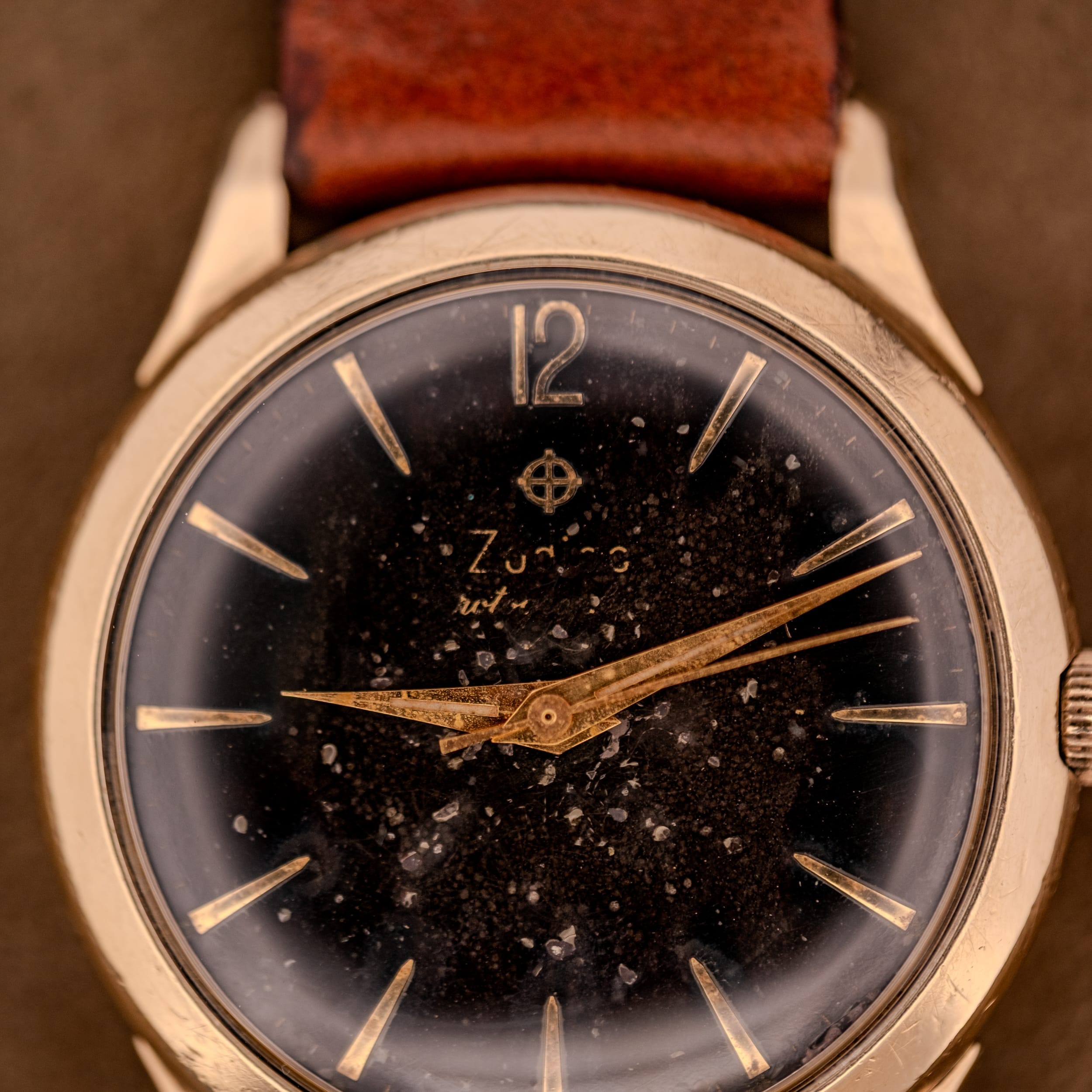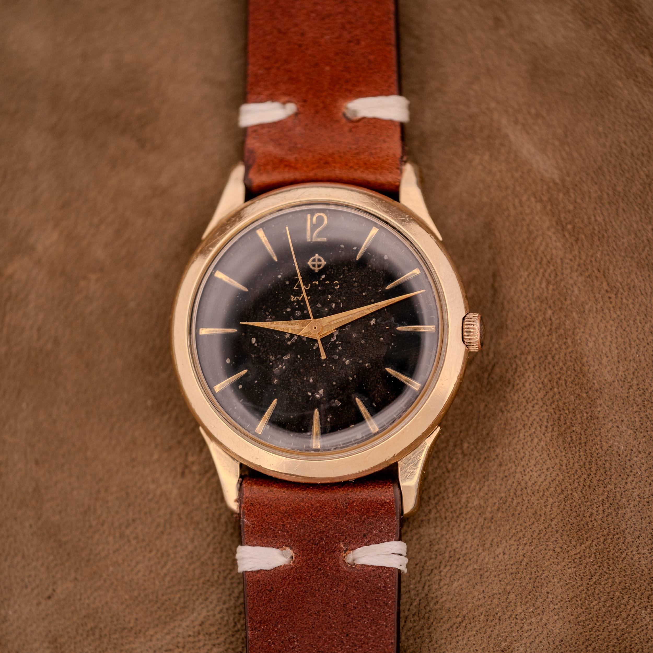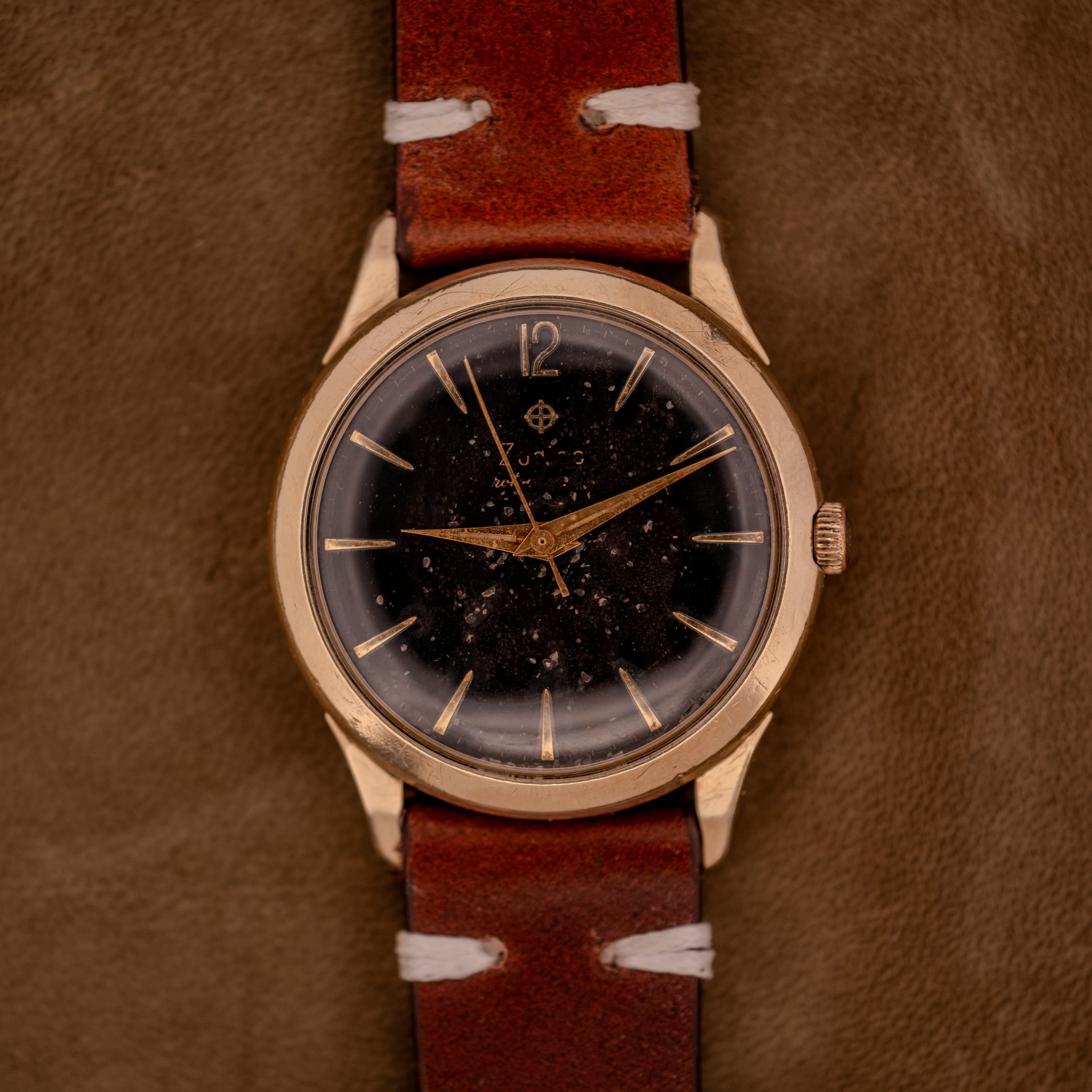 An absolutely mesmerizing 1950s Zodiac Hermetic automatic in 10K gold filled, featuring a deeply evocative black dial with extraordinary starry night tropical patina. Applied gold dagger indices radiate outward, a stylized gold Arabic “12” anchors the top, and the original gold lance handset sweeps across a dial surface that looks like a photograph of deep space. Sculpted lugs and Incabloc shock protection complete the picture. This one is pure wrist candy for the patina hunter.