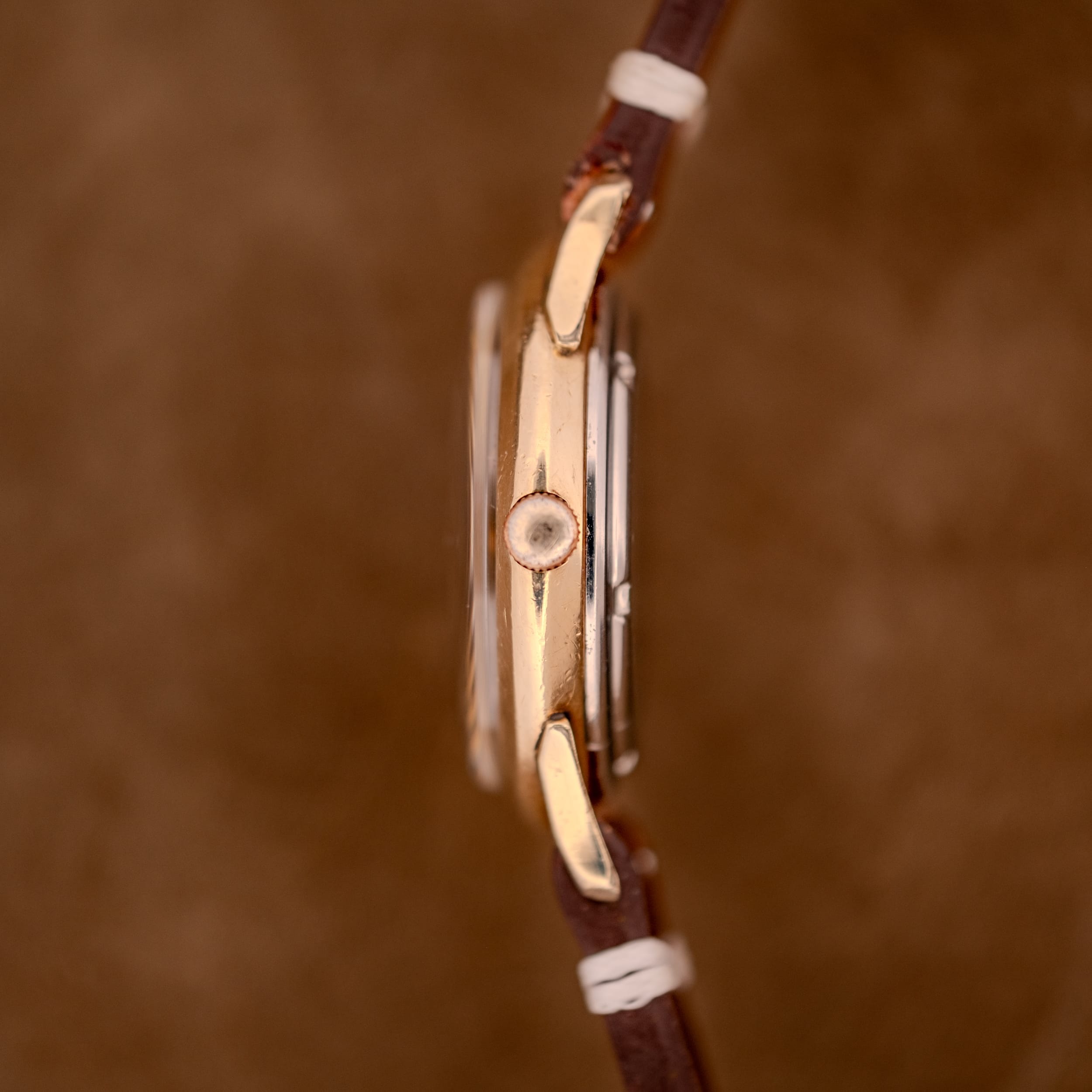 The 10K gold filled case is in good condition, with the warm gold tone still presenting nicely across the bezel and the elegantly sculpted lugs. The case shows honest surface wear throughout, with light scratching on the bezel and between the lugs consistent with a watch that was clearly enjoyed. The profile shots reveal a nicely proportioned mid-case with gently curved lugs that give the watch a comfortable, ergonomic wrist presence.