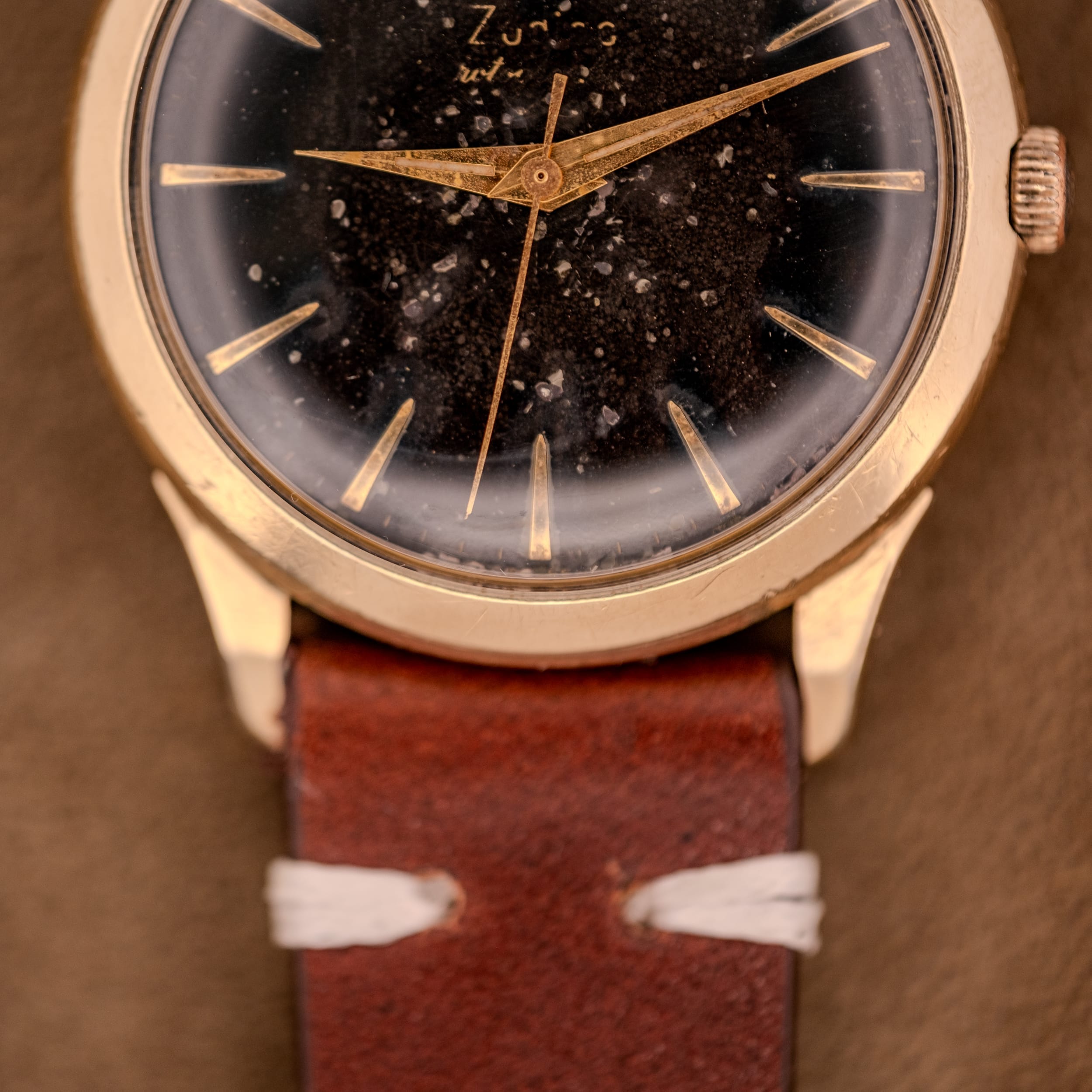 To be direct: you are not buying this watch for a pristine, museum-grade dial. You are buying it because this dial has more character, more presence, and more visual drama than ninety-nine percent of the mint-condition vintage watches on the market. For the collector who understands that patina is not a flaw but a feature, who seeks out the unrepeatable and the unique, this Zodiac Hermetic is an absolute treasure. On the brown leather strap, the warm gold case and the dark, cosmic dial create a contrast that is nothing short of arresting. It is the kind of watch that demands a second look and rewards every one thereafter.
