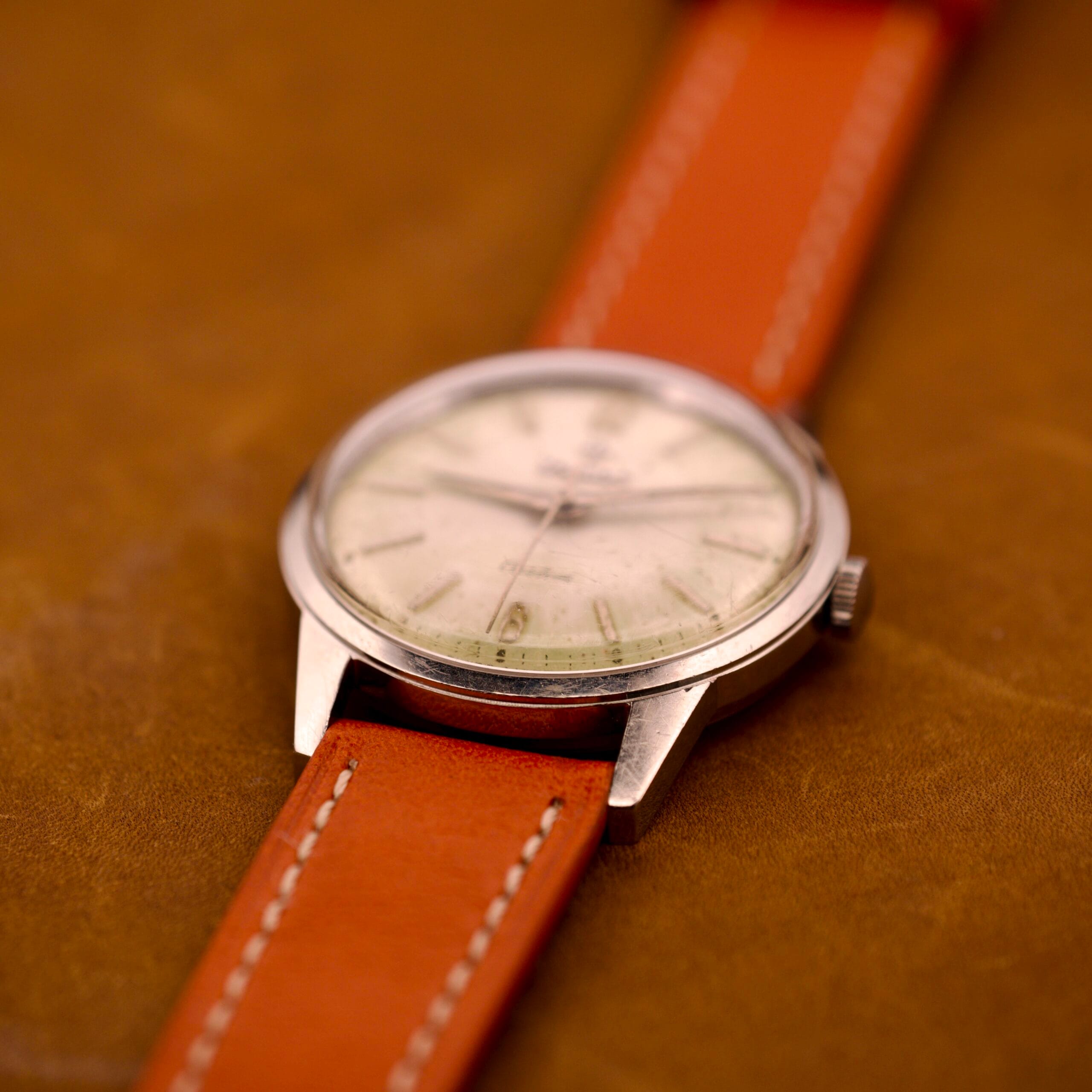In terms of condition, we are looking at an honest survivor. The stainless steel case retains its definition, and the manual-wind movement offers that tactile connection to time that only a hand-wound watch can provide. The “Hermetic” sealing system, while we wouldn’t recommend swimming with it today, has likely done its job over the last sixty years, keeping the dial and movement preserved from the elements.